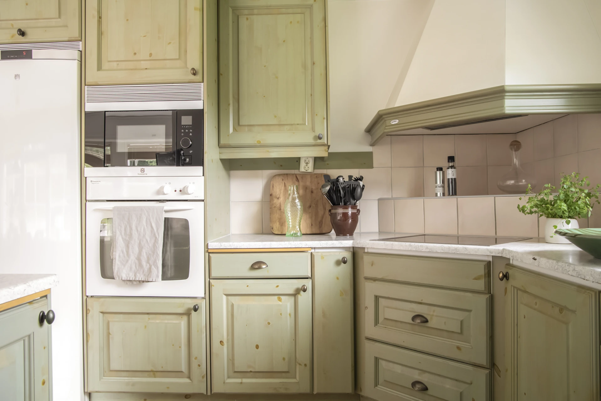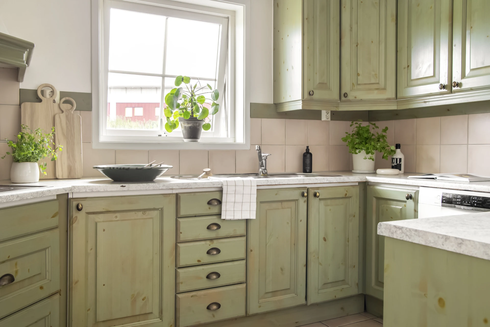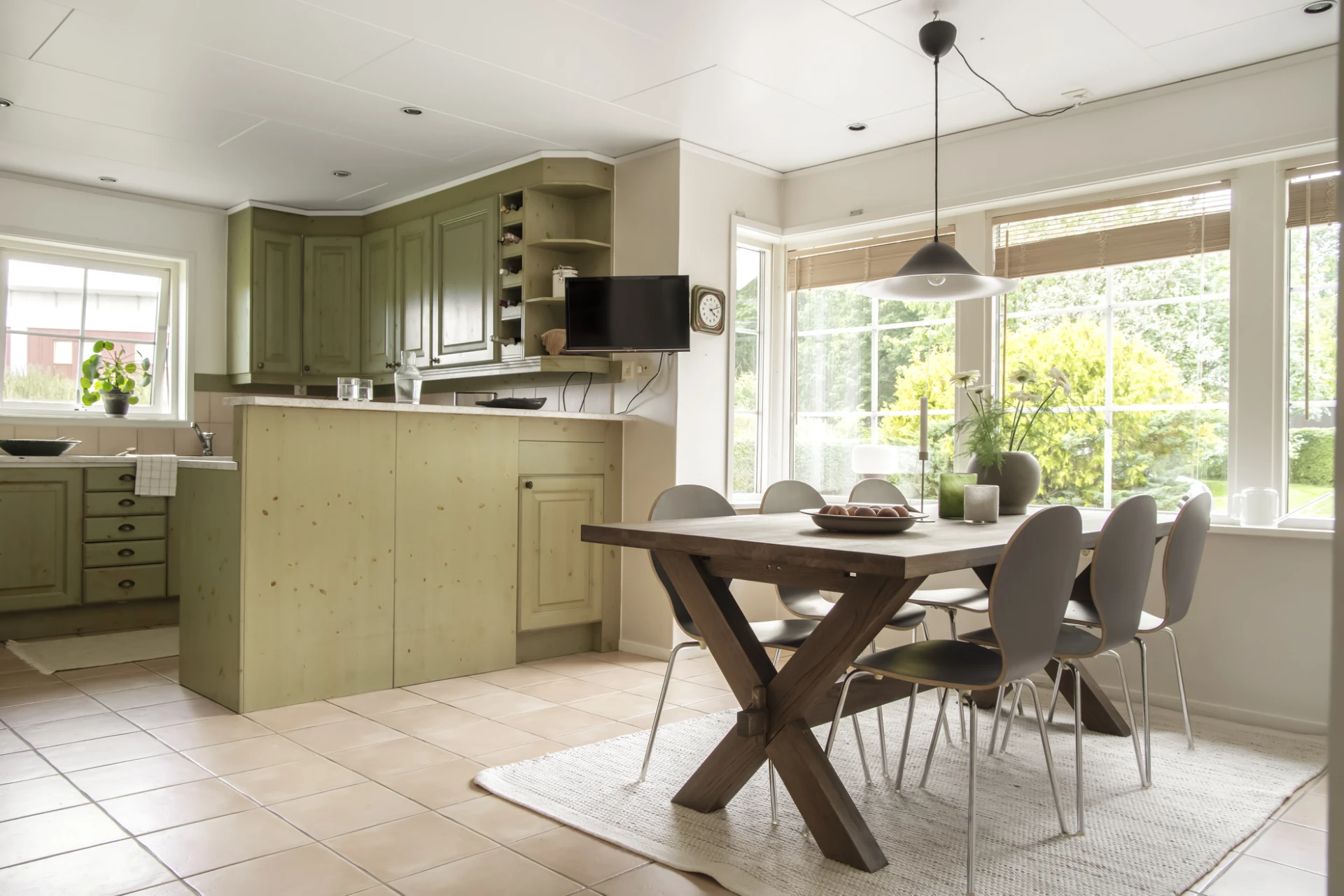 Klinkergolv och väggar målade i ljus kulör. Köksinredningen består av gröna skåpsluckor från Myresjö samt aprikos kakel över en bänkskiva i grå laminat. Den maskinella utrustningen består av kyl och frys i fullhöjd, mikro, diskmaskin, keramisk häll, varmluftsugn samt fläkt. I taket sitter dimmbar spotlightsbelysning och den öppna planlösningen till matplatsen erbjuder plats för ett stort matbord.