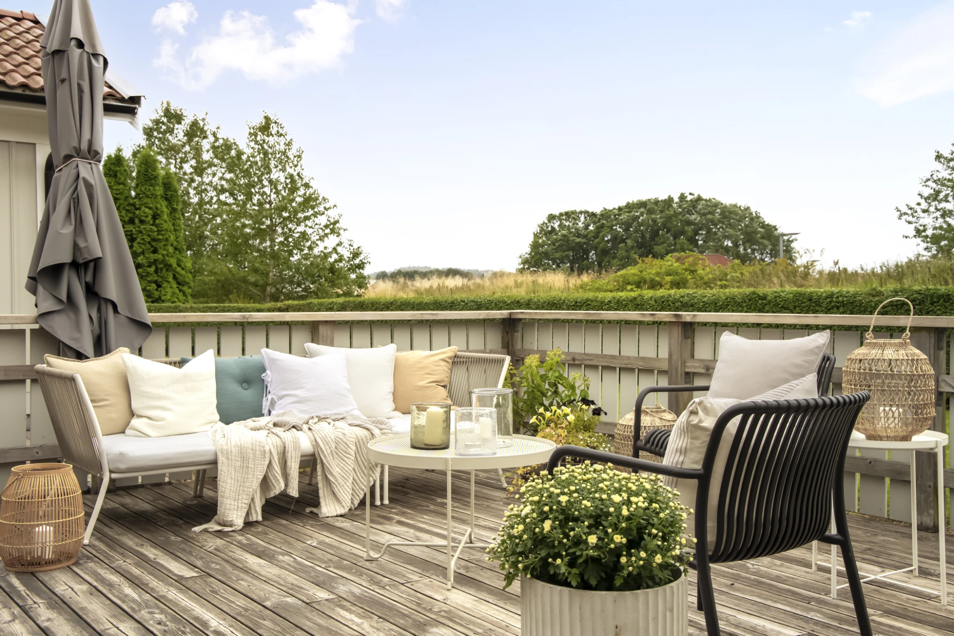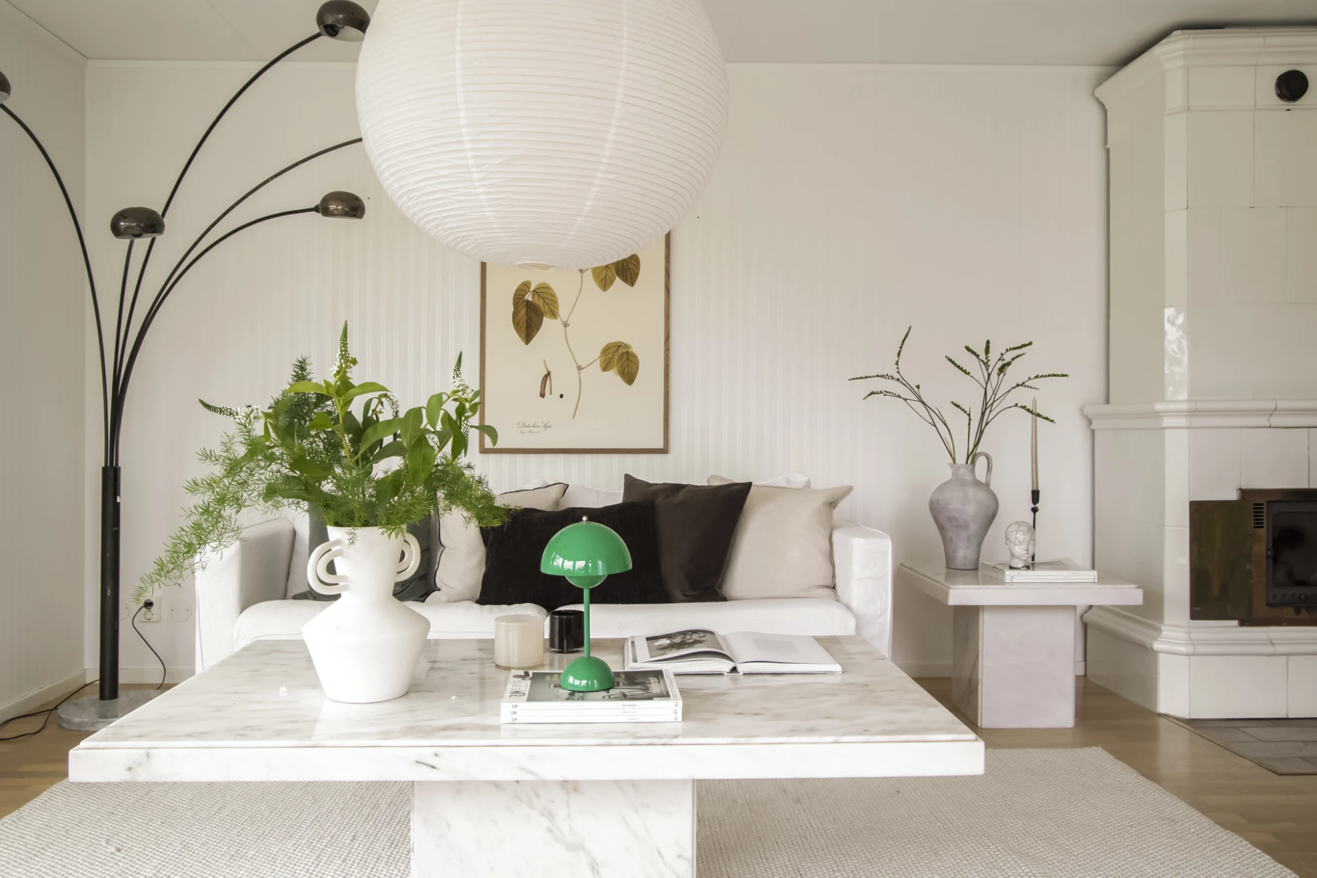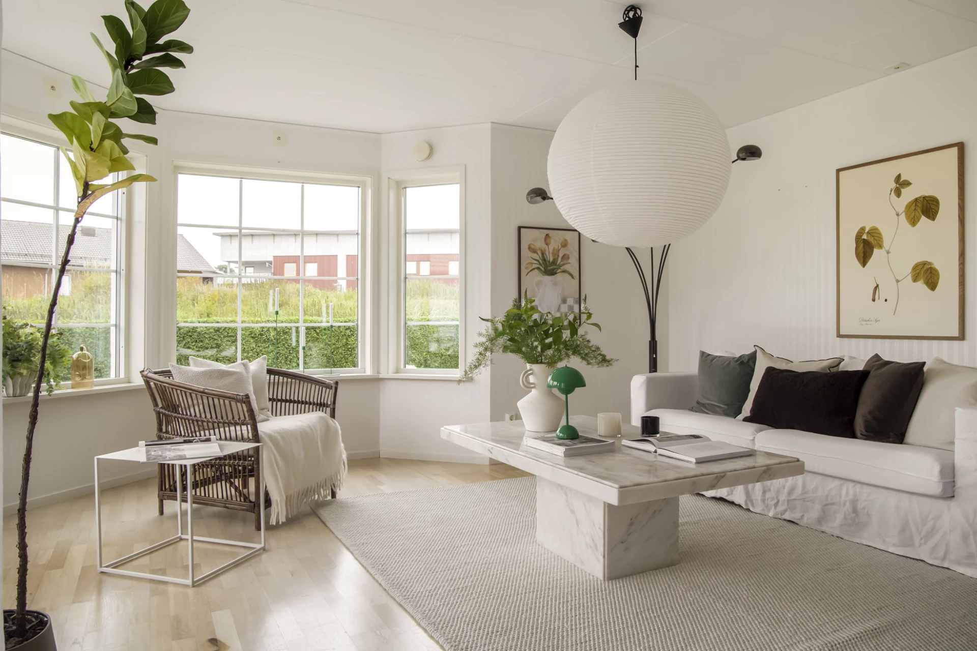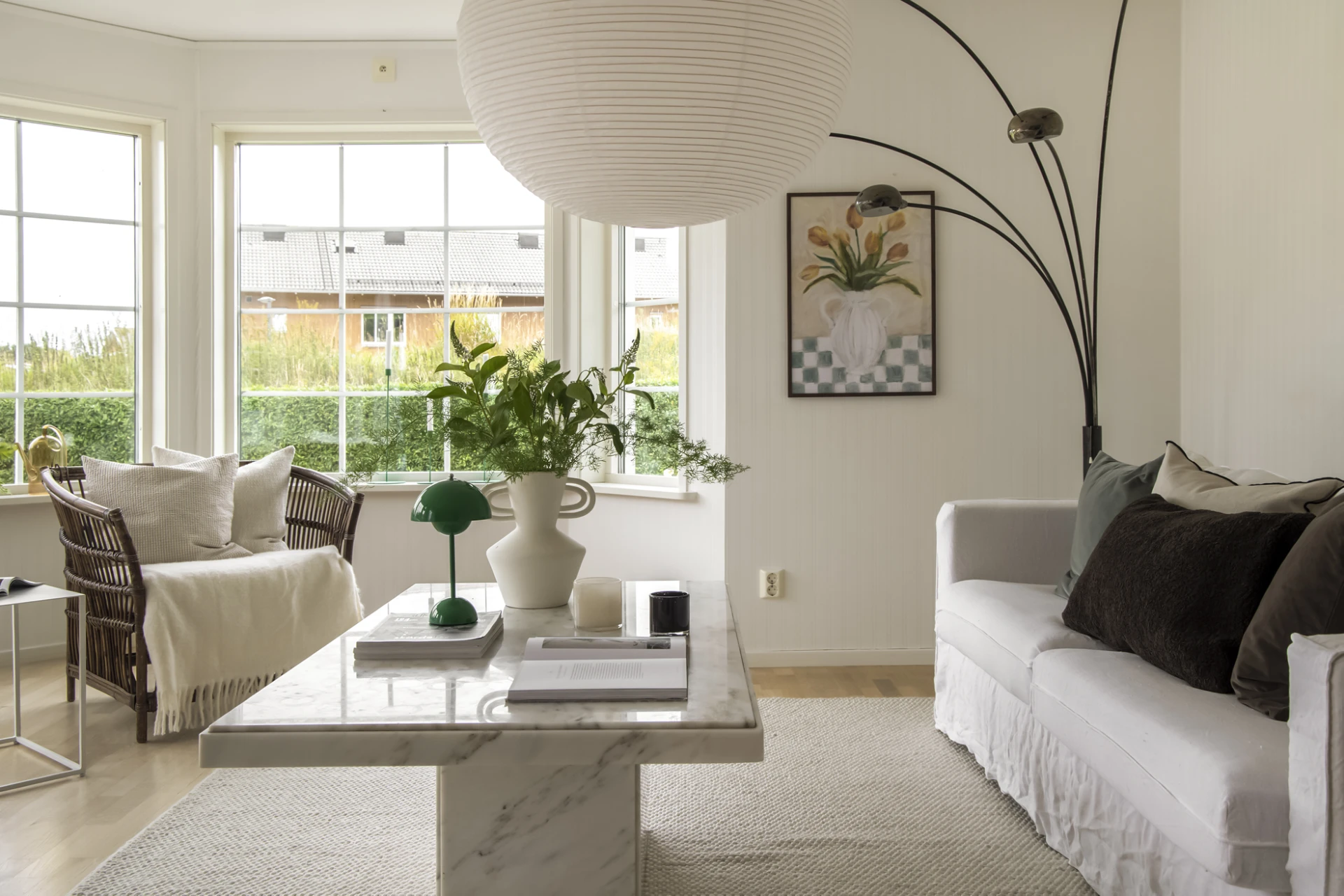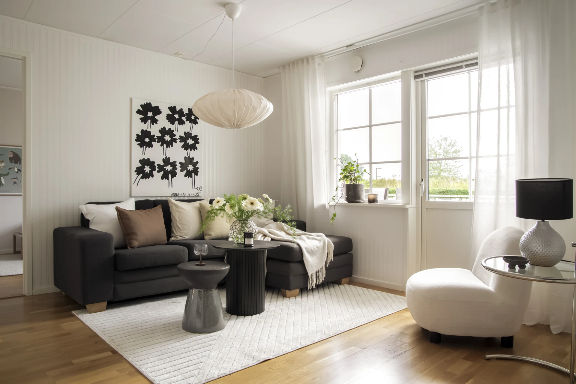 Ekparkett och väggar tapetserade i vit kulör. Rummet ger plats åt en stor soffgrupp med tillhörande möblemang och härifrån når man bostadens altan i söder.