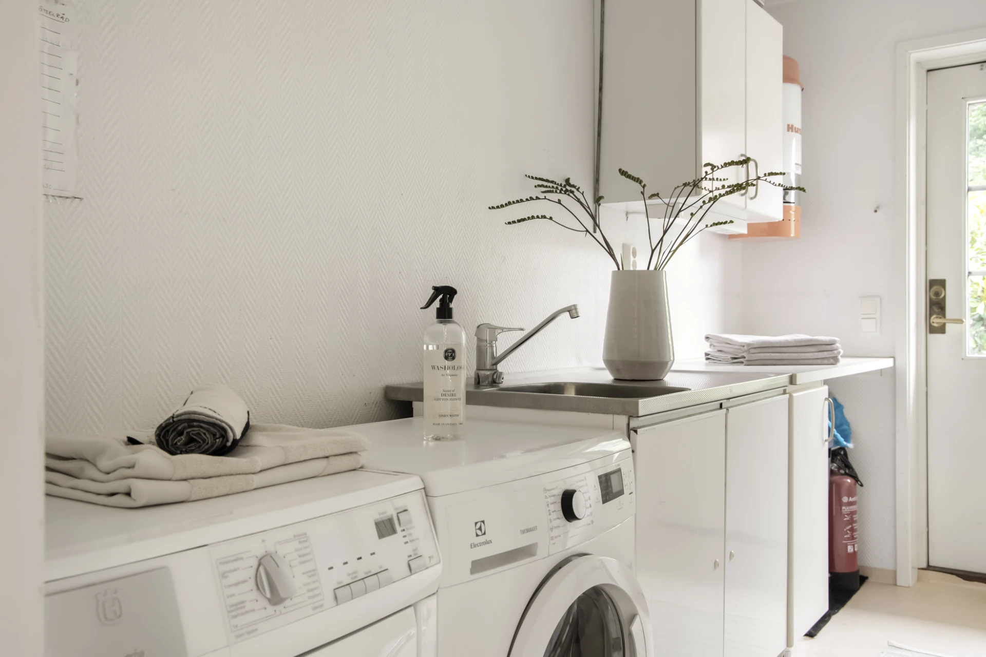Ljus linoleumgolv med vitmålad vävtapet. Den praktiska tvättstugan är utrustad med tvättmaskin och torktumlare, vägghängda skåp samt två platsbyggda garderober för maximal förvaring. Här finns även uppsamlingskärl till centraldammsugaren.