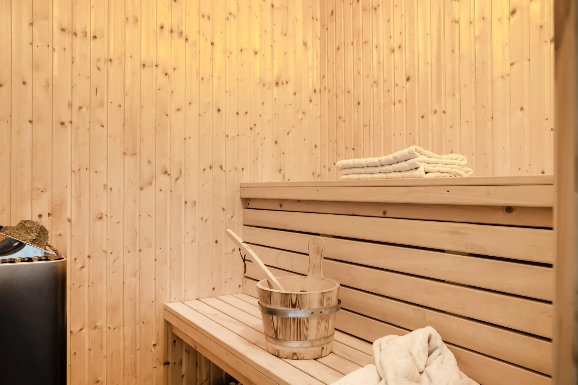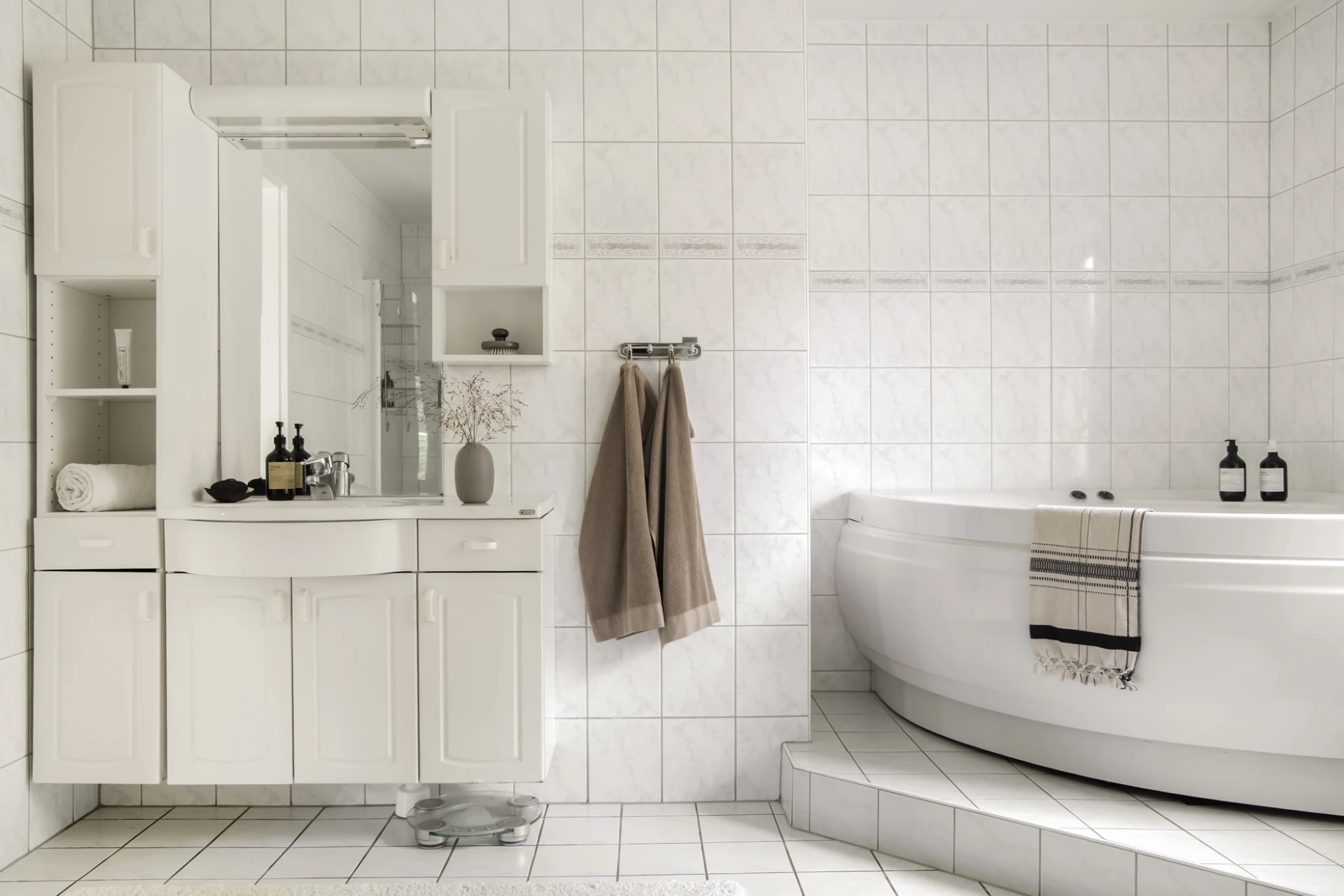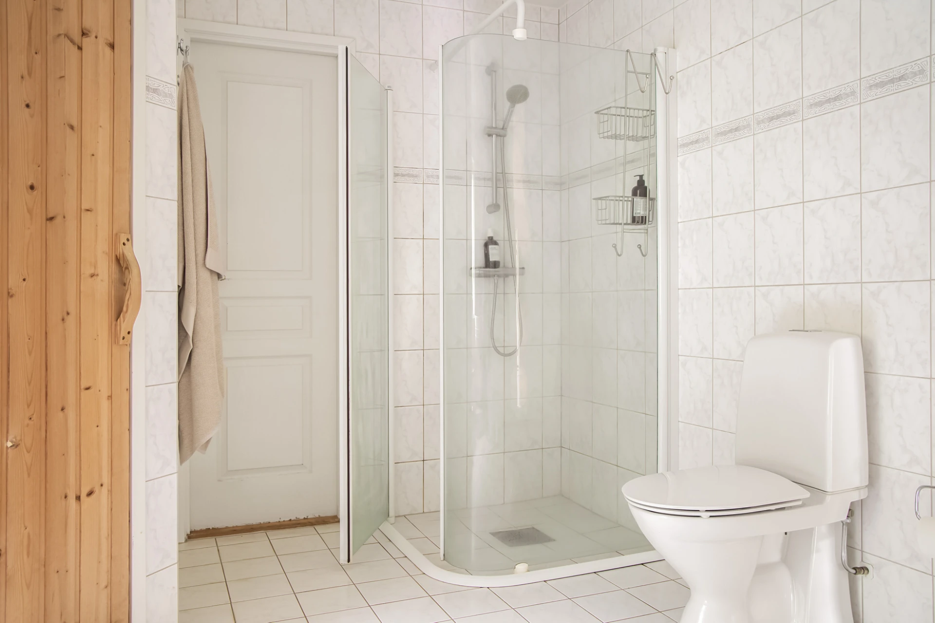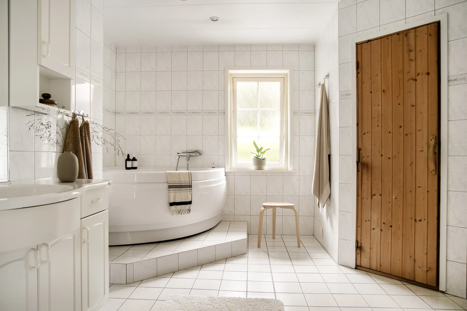 Helkaklat badrum med vita klinkergolv med vattenburen golvvärme samt ljust kakel på väggar. Badrummet är utrustat med wc-stol, dusch med duschkabin, handfat med kommod, spegel med spegelskåp, badkar samt bastu och i taket sitter dimmbar spotlightsbelysning.