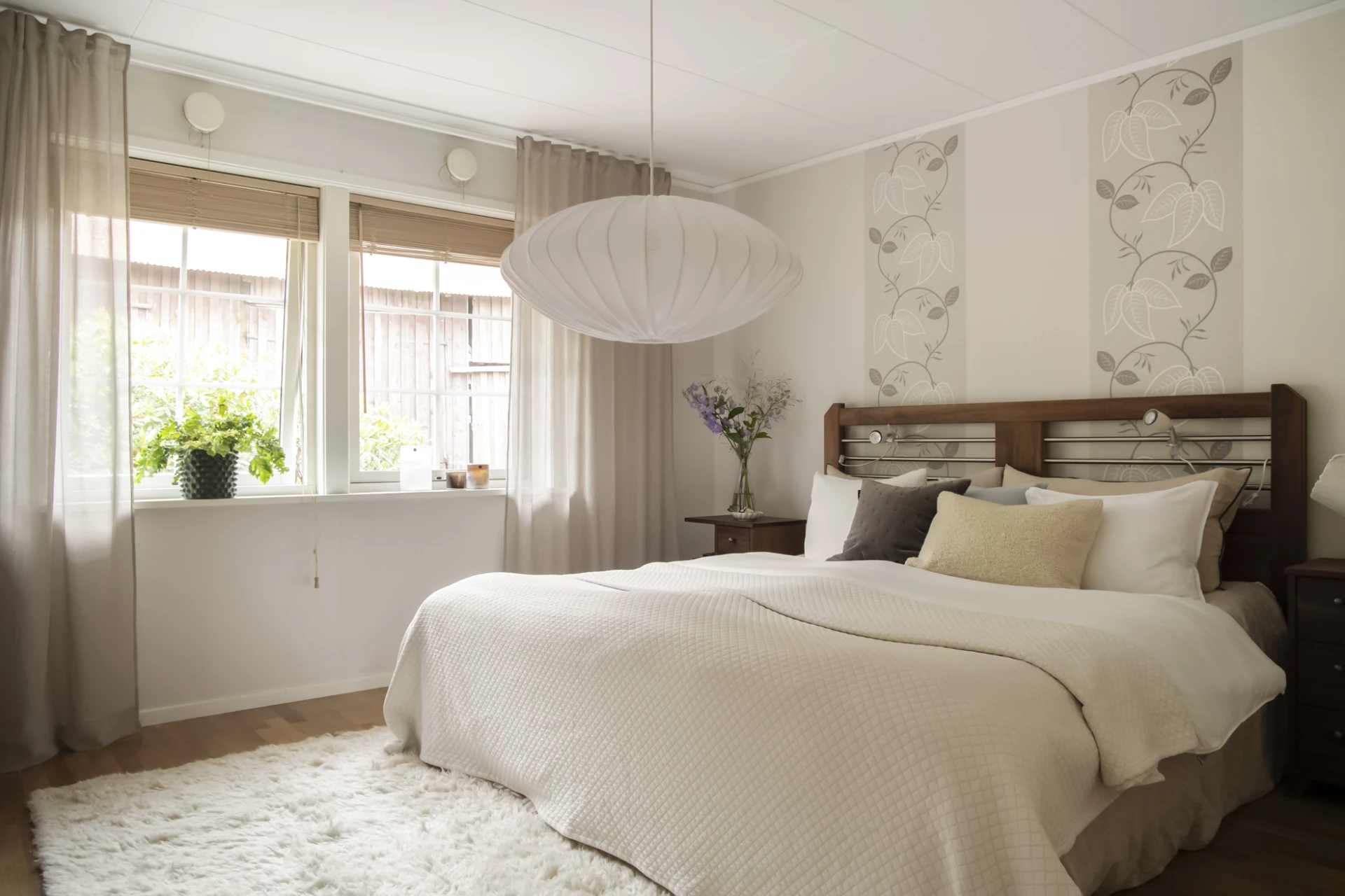 Ekparkett och väggar målade i beige kulör. Sovrummet erbjuder plats för en dubbelsäng med tillhörande möblemang och förvaringen och avhängningen består av en klädkammare. Härifrån har man en genomgång till tillhörande badrum.