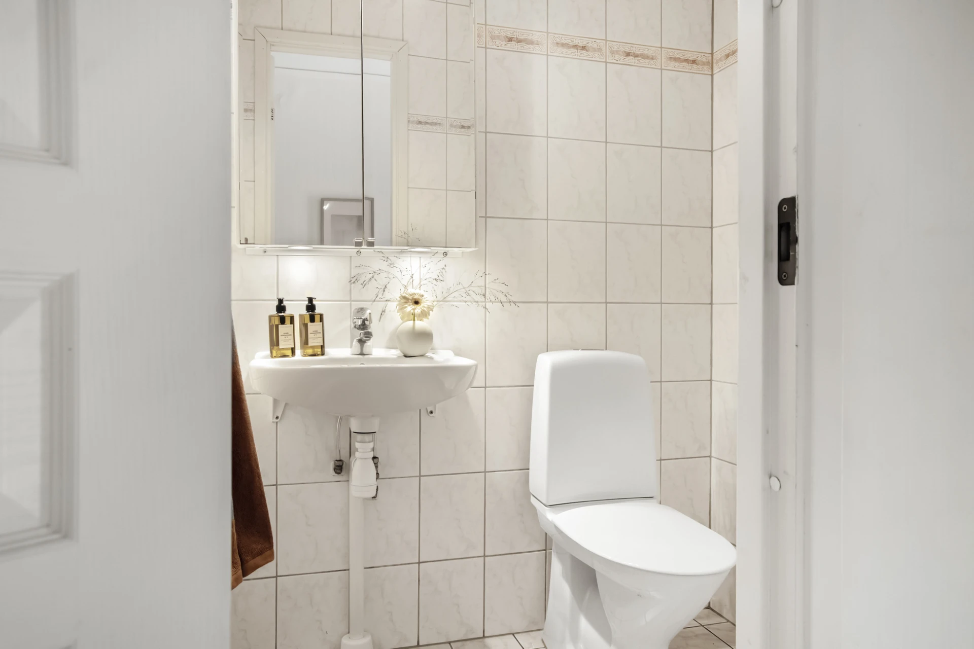 Helkaklat badrum med ljusa klinker på golv med vattenburen golvvärme och ljust kakel på väggar. Här finns wc-stol, handfat samt spegel med spegelskåp.