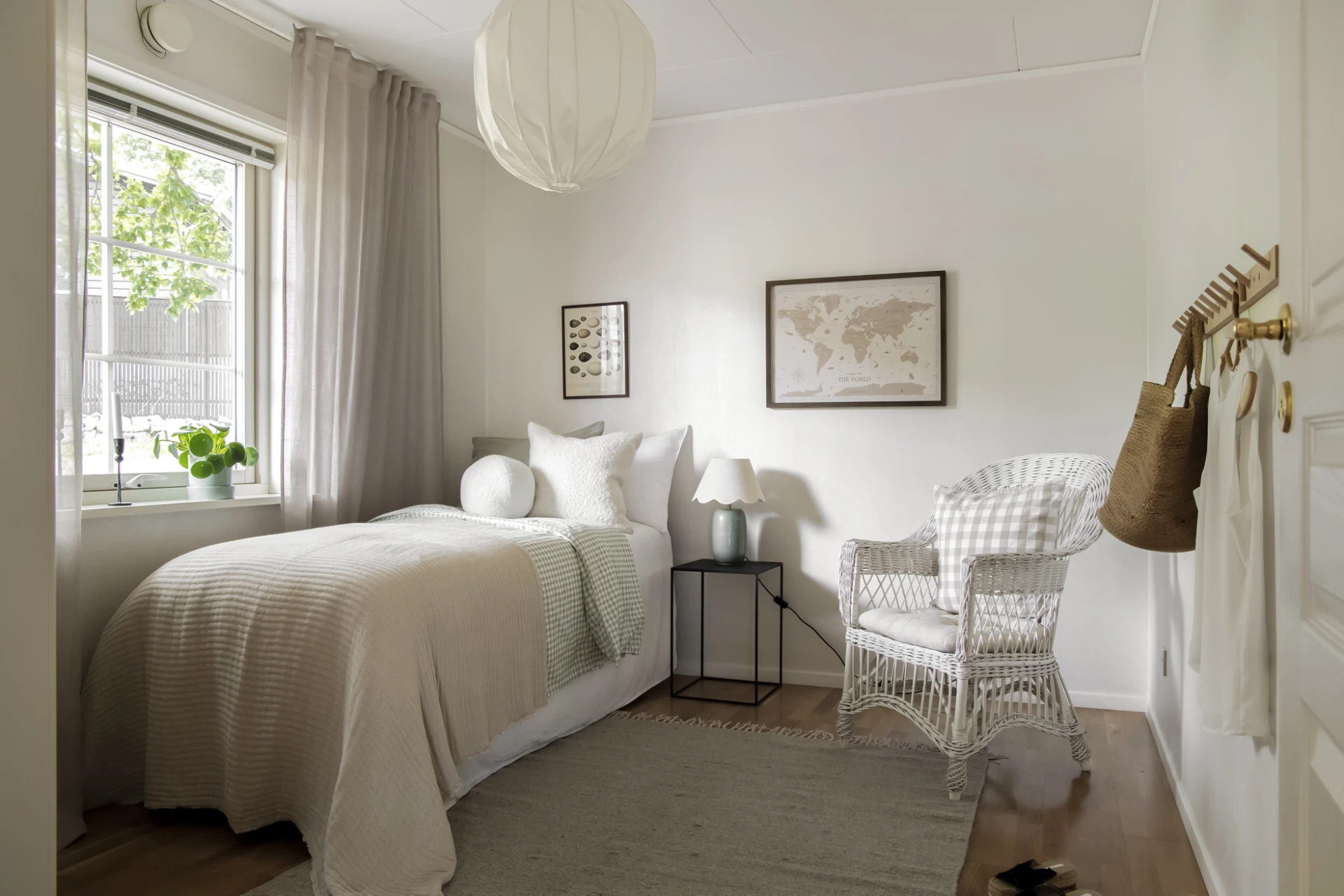 Ekparkett och vitmålade väggar. Här finns plats för en dubbelsäng med tillhörande möblemang och förvaringen och avhängningen består av två platsbyggda garderober.