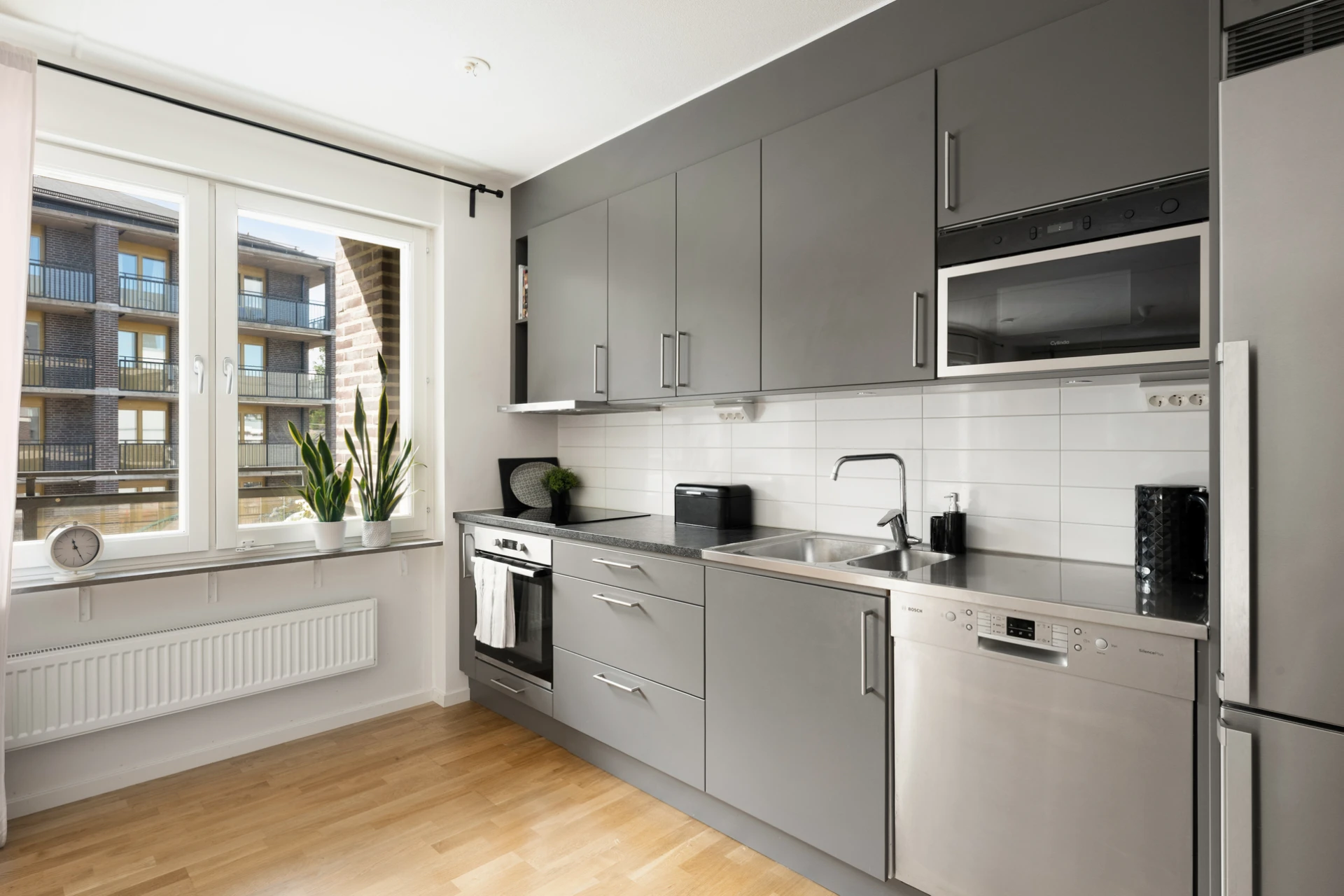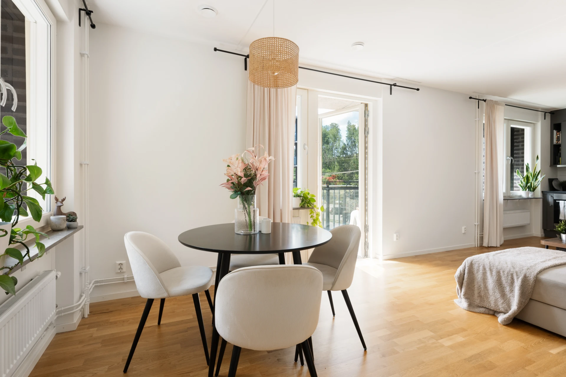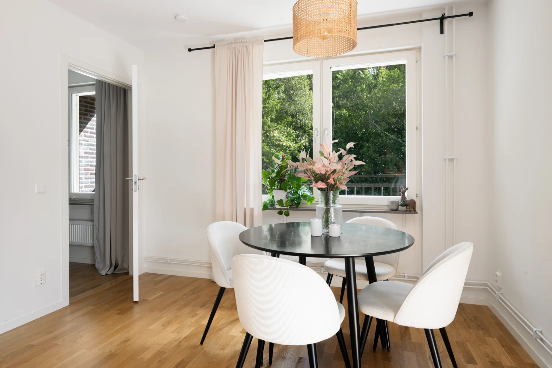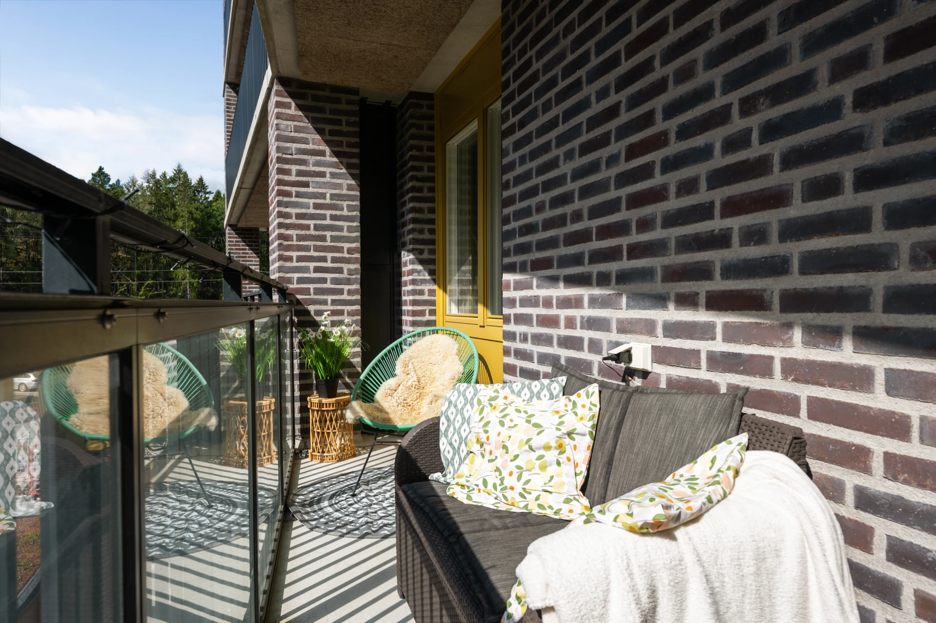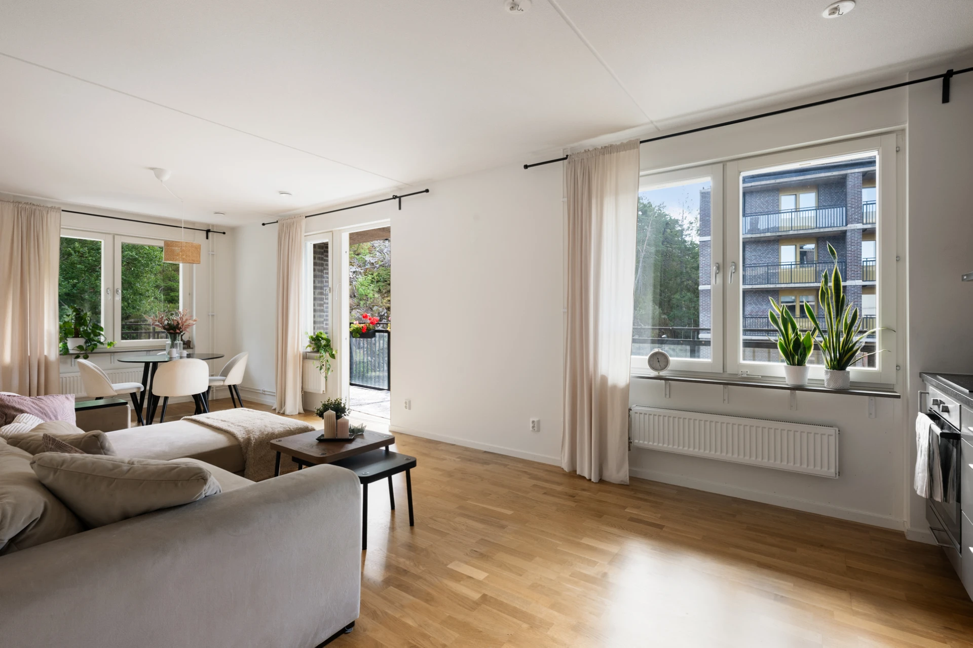 Hörntvåa med fantastiskt läge i omtyckta Vega. Enorm hörnbalkong i soligt läge inbäddad i grönska.