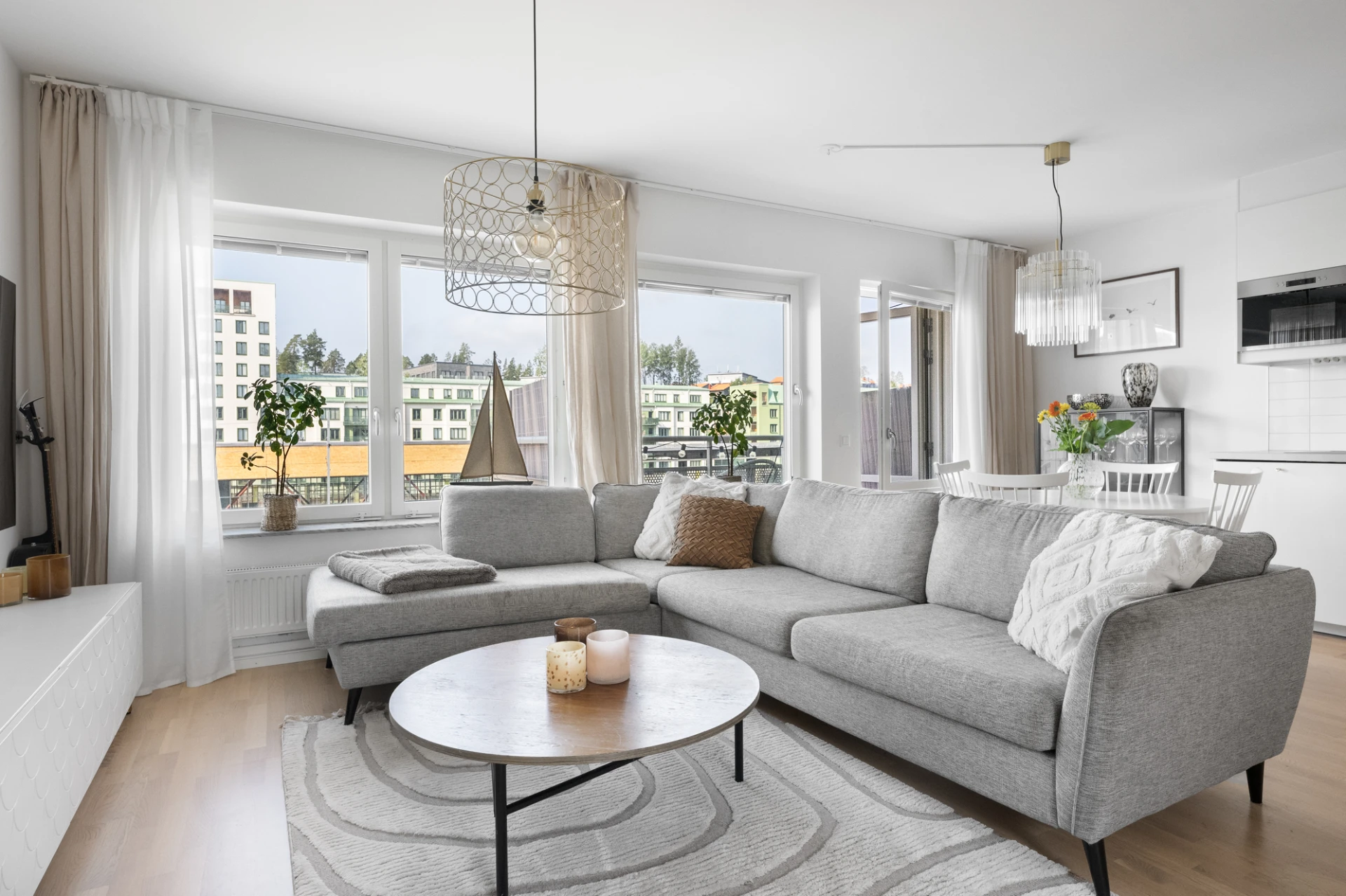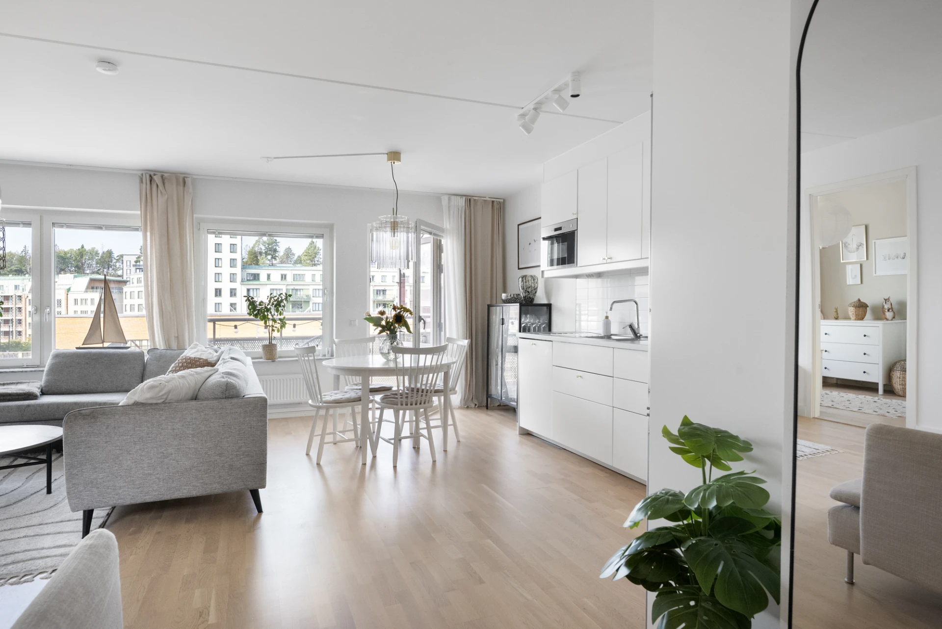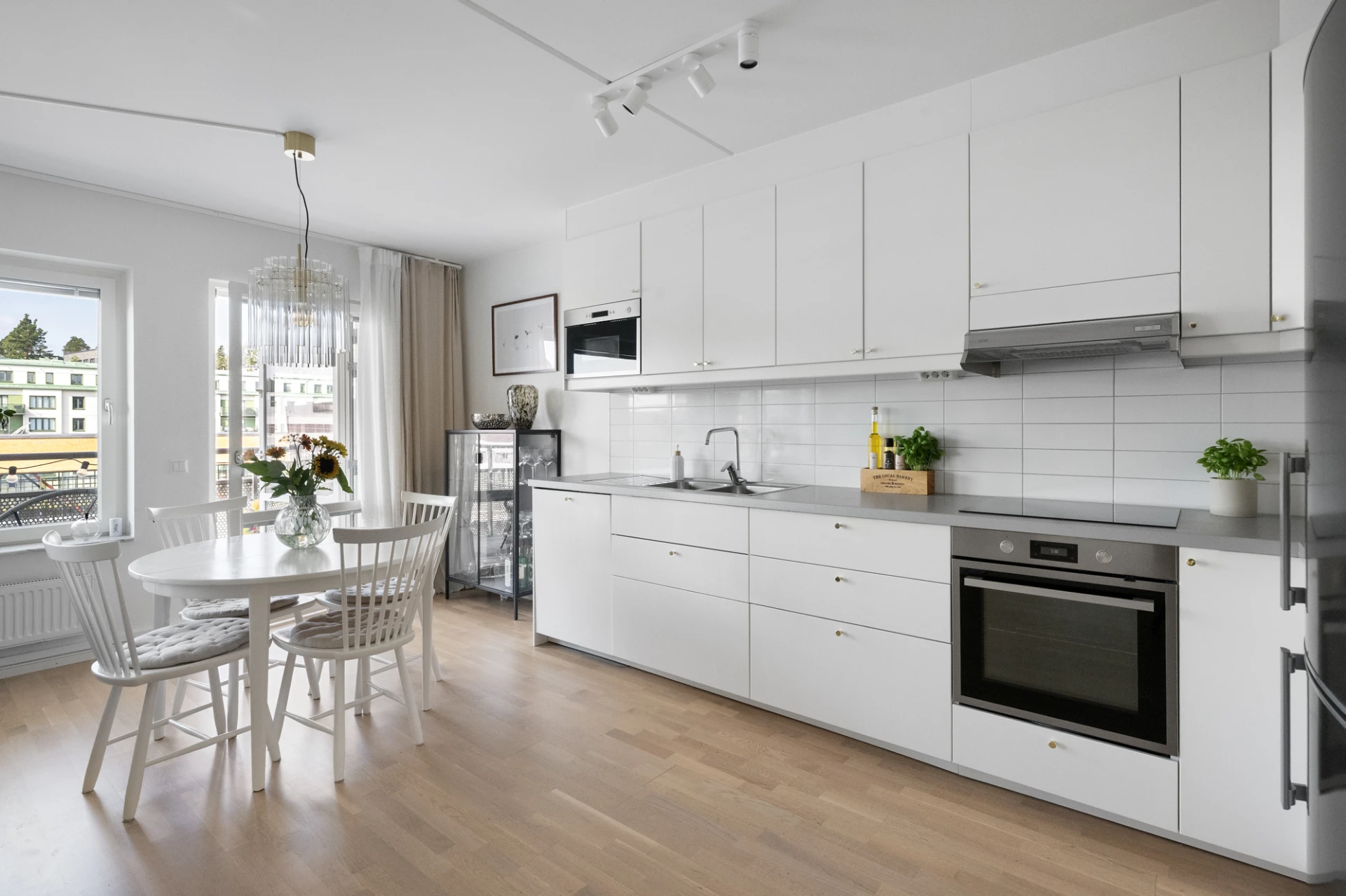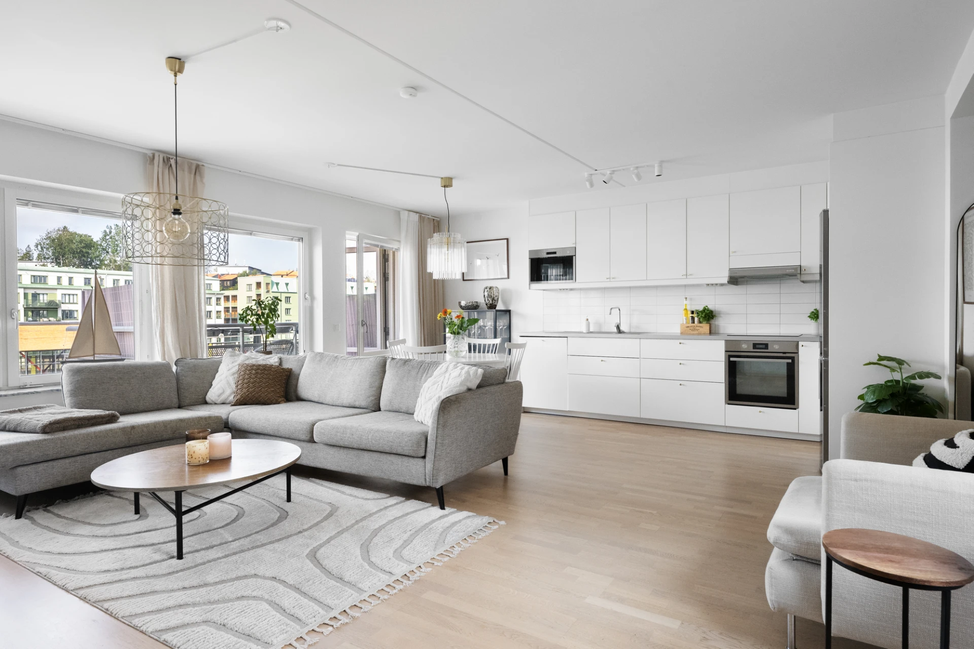 Bostaden präglas av nyproduktionens alla fördelar: öppen planlösning, stilrena materialval och ett hem som fortfarande känns nästintill orört, med minimalt underhållsbehov. Köket går i ljusa toner och är utrustat med integrerade vitvaror, gott om förvaring samt generösa arbetsytor. Här finns en naturlig matplats mellan kök och vardagsrum, perfekt för ett rejält matbord. Vardagsrummet är lättmöblerat och rymmer både större soffgrupp och annat möblemang – härifrån nås även den trevliga balkongen med ett högt och trevligt läge där eftermiddags och kvällssol kan avnjutas.