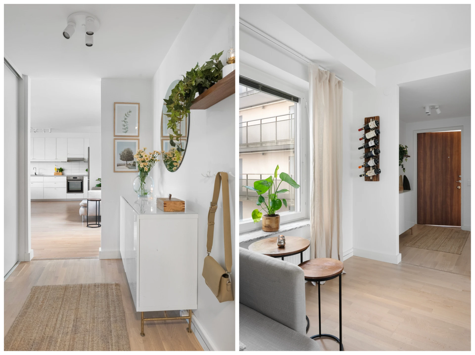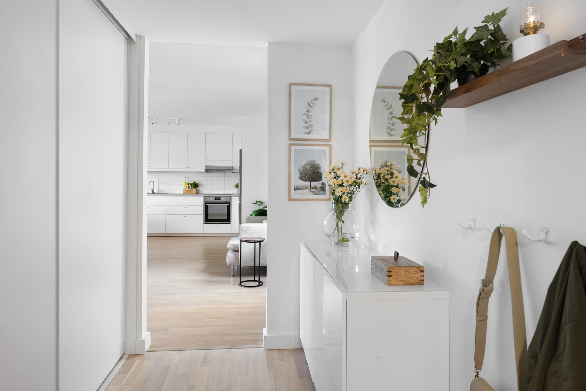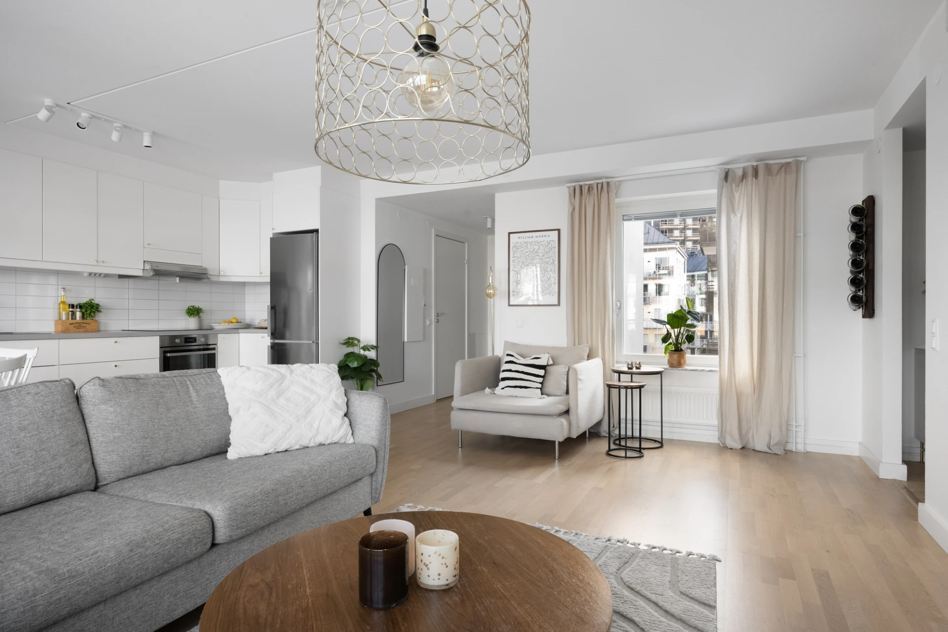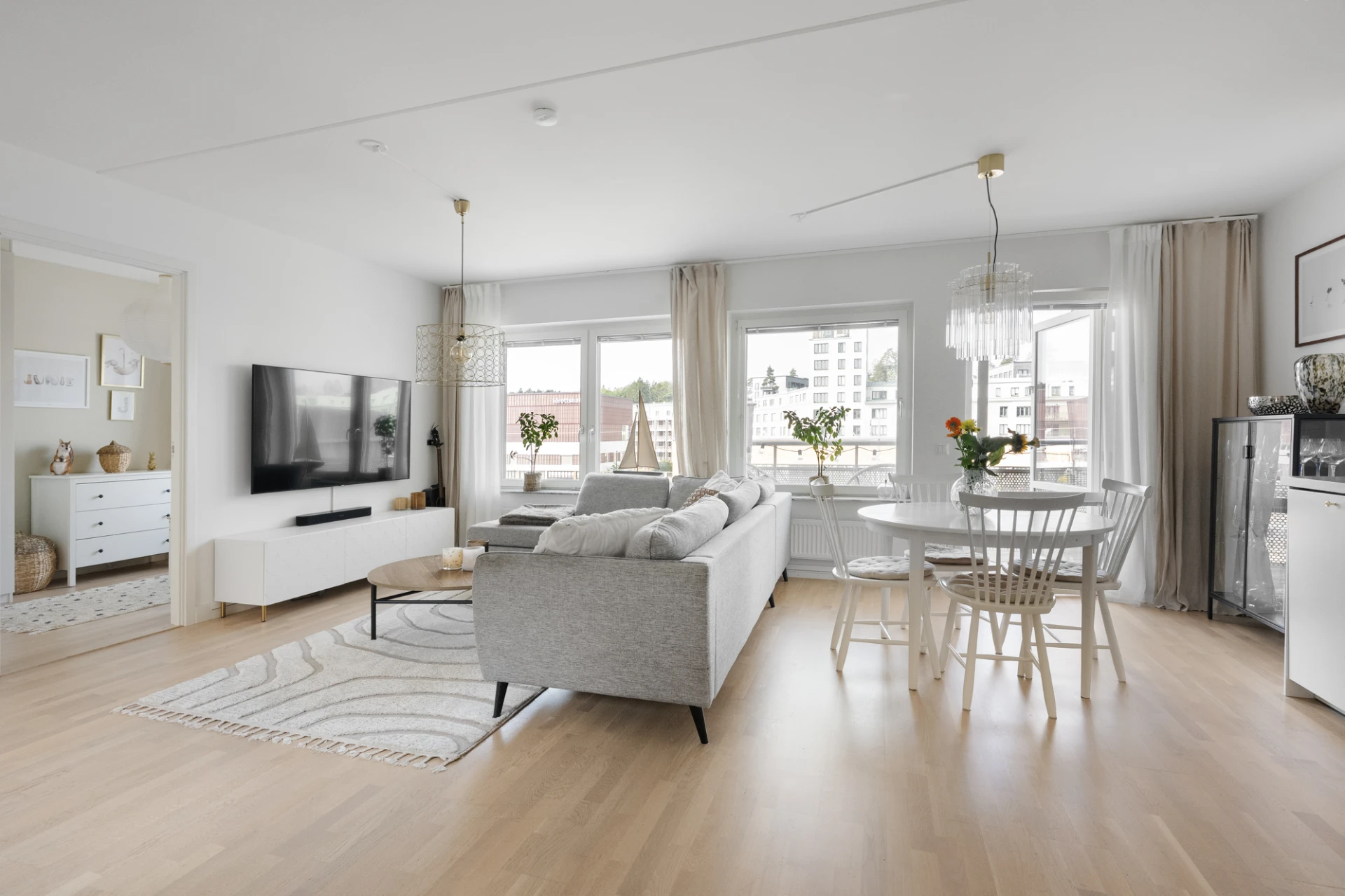 Bostaden präglas av nyproduktionens alla fördelar: öppen planlösning, stilrena materialval och ett hem som fortfarande känns nästintill orört, med minimalt underhållsbehov. Köket går i ljusa toner och är utrustat med integrerade vitvaror, gott om förvaring samt generösa arbetsytor. Här finns en naturlig matplats mellan kök och vardagsrum, perfekt för ett rejält matbord. Vardagsrummet är lättmöblerat och rymmer både större soffgrupp och annat möblemang – härifrån nås även den trevliga balkongen med ett högt och trevligt läge där eftermiddags och kvällssol kan avnjutas.