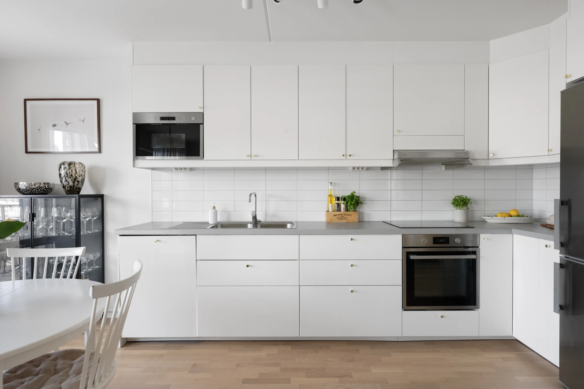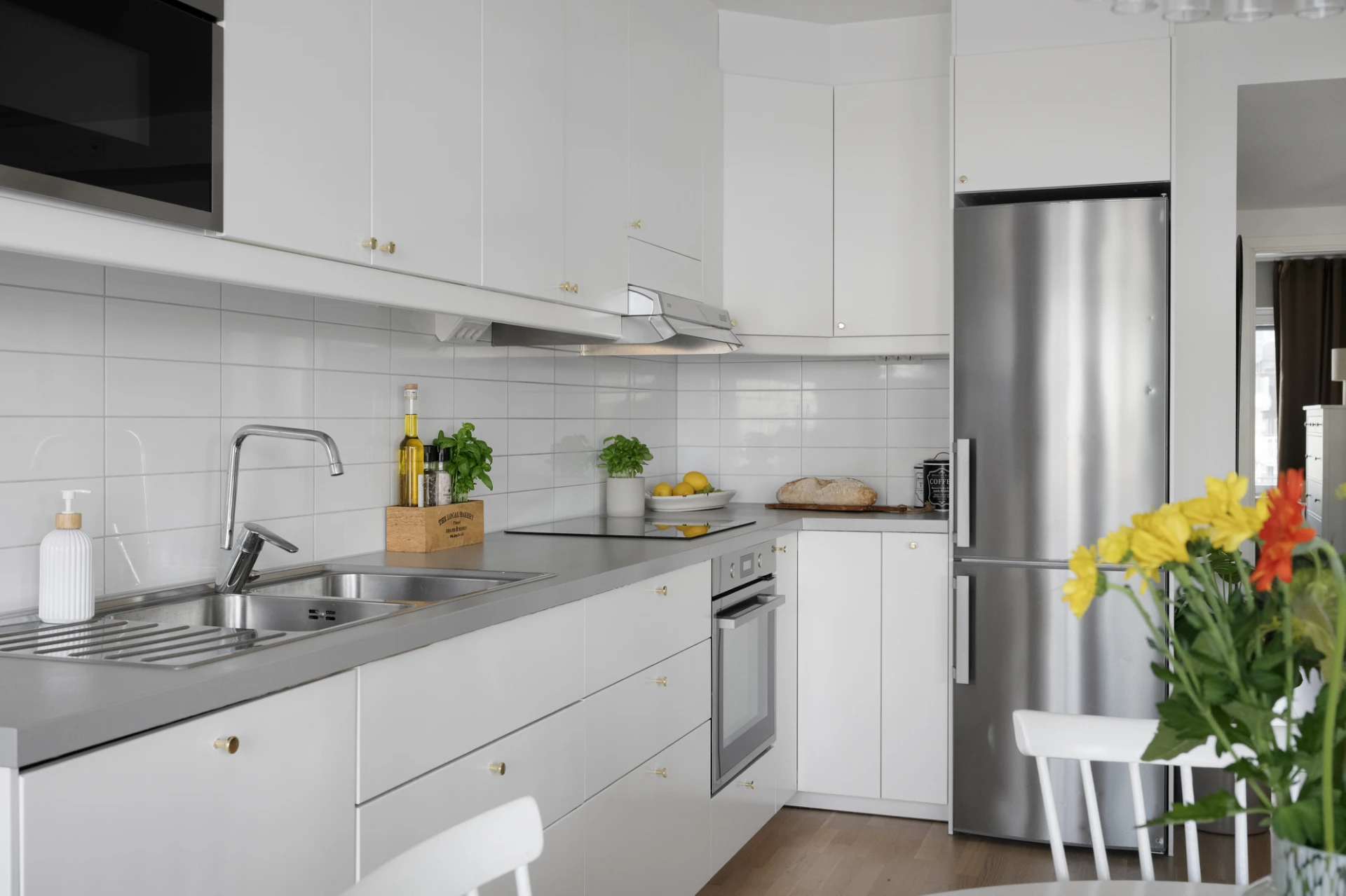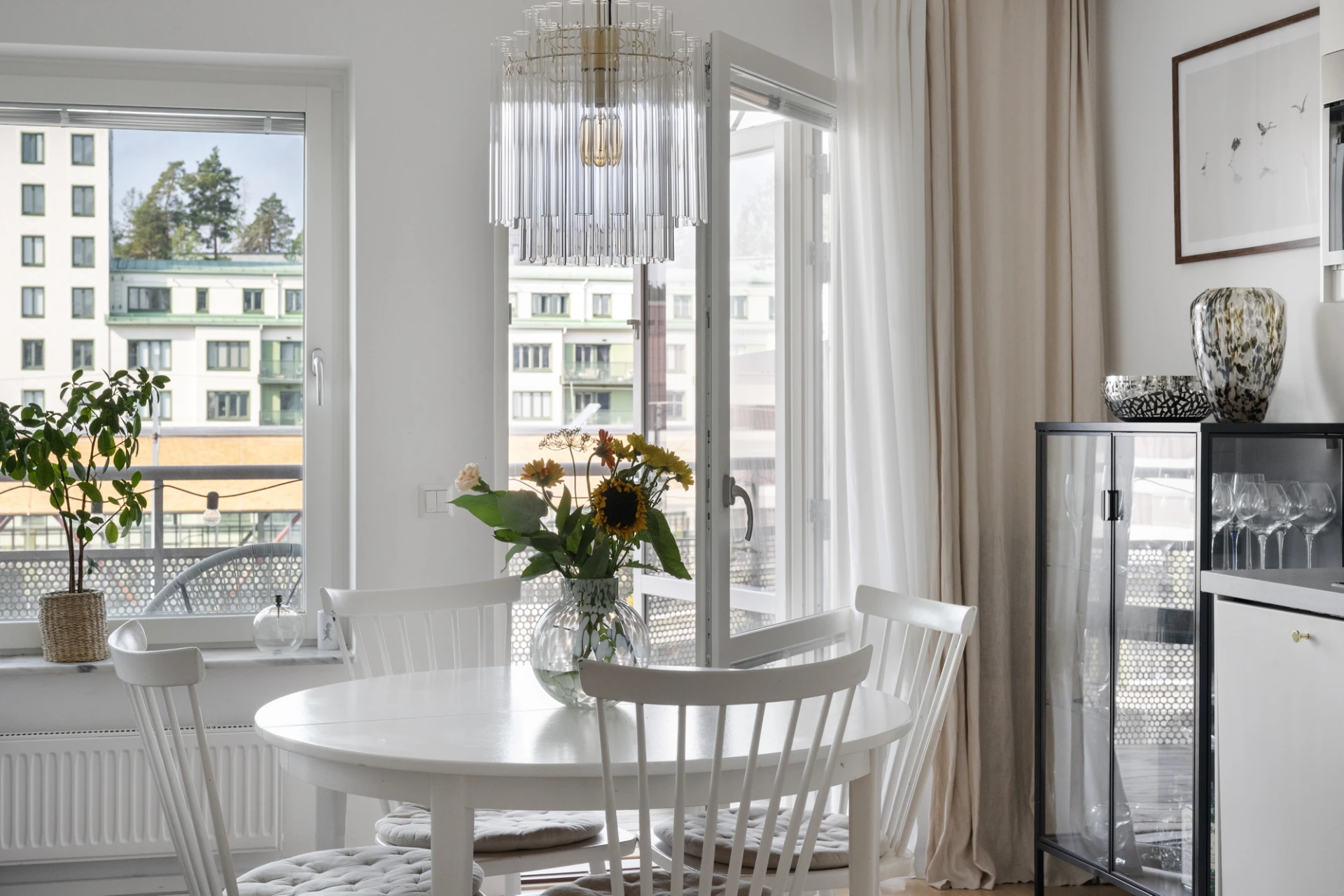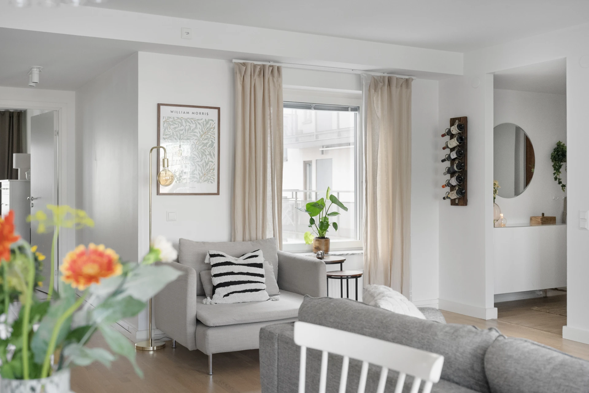 Bostaden präglas av nyproduktionens alla fördelar: öppen planlösning, stilrena materialval och ett hem som fortfarande känns nästintill orört, med minimalt underhållsbehov. Köket går i ljusa toner och är utrustat med integrerade vitvaror, gott om förvaring samt generösa arbetsytor. Här finns en naturlig matplats mellan kök och vardagsrum, perfekt för ett rejält matbord. Vardagsrummet är lättmöblerat och rymmer både större soffgrupp och annat möblemang – härifrån nås även den trevliga balkongen med ett högt och trevligt läge där eftermiddags och kvällssol kan avnjutas.