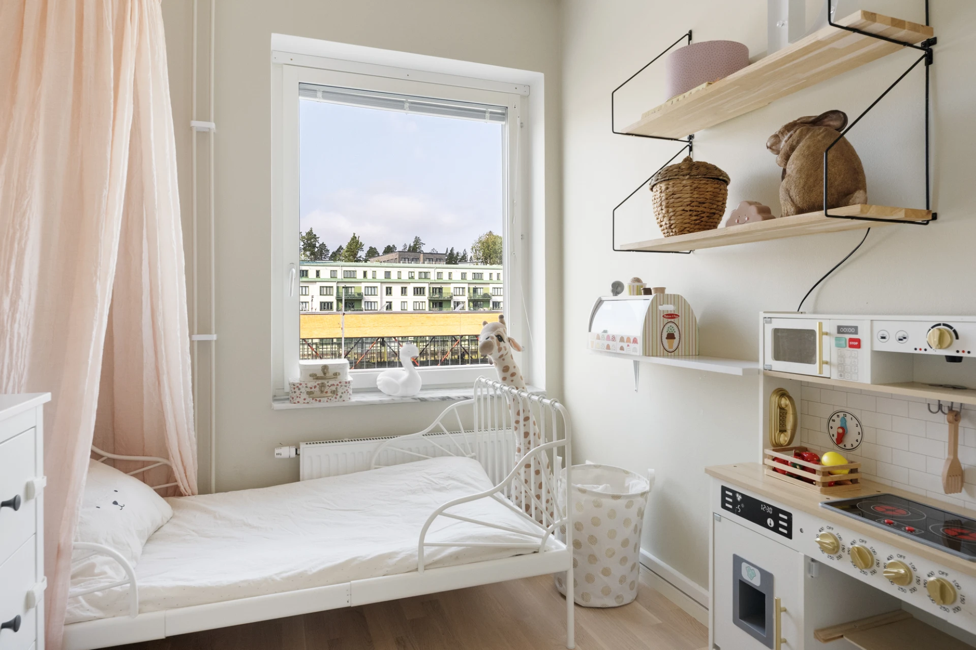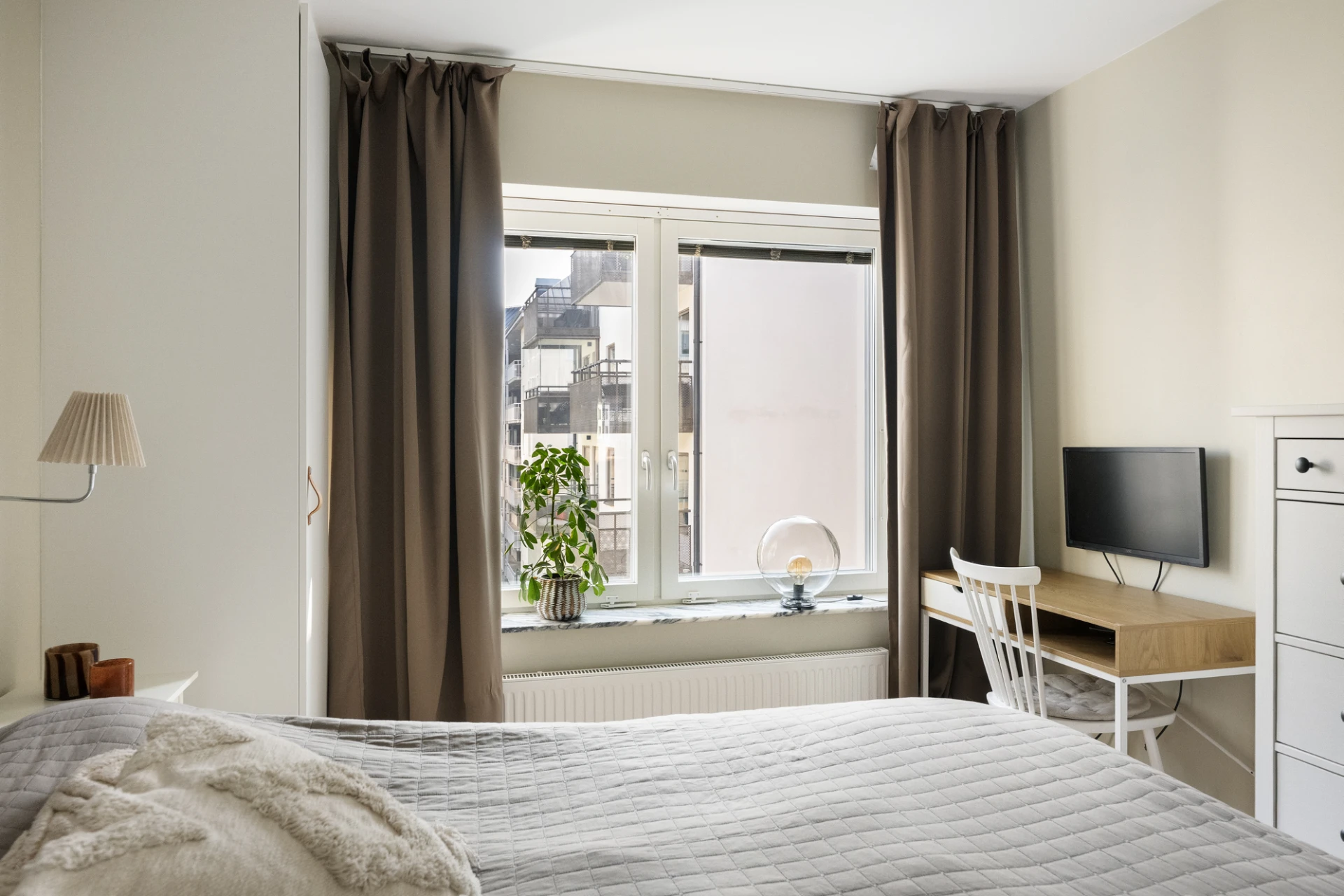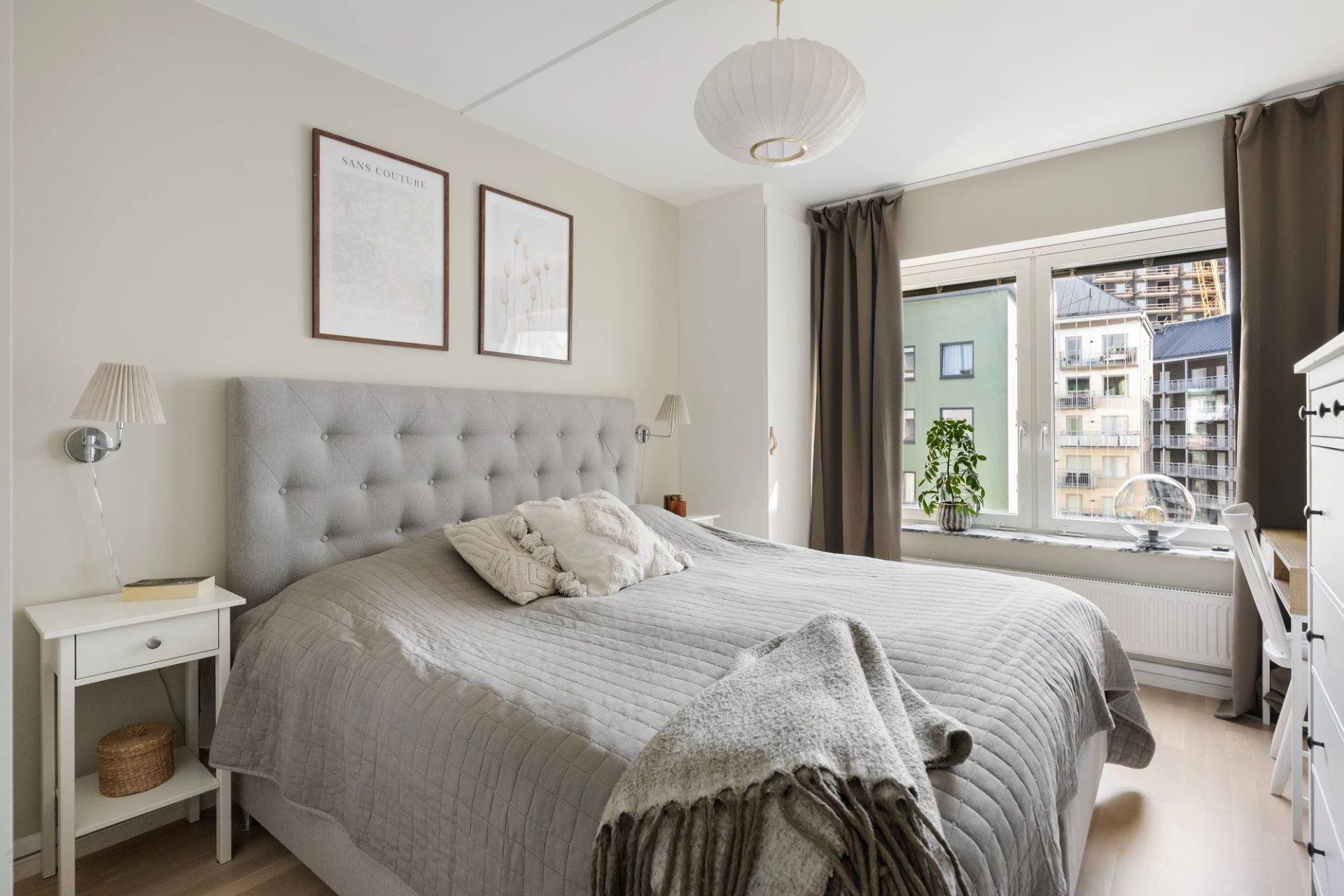 Det helkaklade badrummet är både elegant och funktionellt, utrustat med tvättmaskin, torktumlare, arbetsbänk och bra förvaring. Det större sovrummet vetter mot föreningens trevliga innergård och rymmer en dubbelsäng med tillhörande möblemang. Det andra sovrummet fungerar lika väl som barnrum, kontor eller gästrum och har plats för både säng, skrivbord och förvaring.