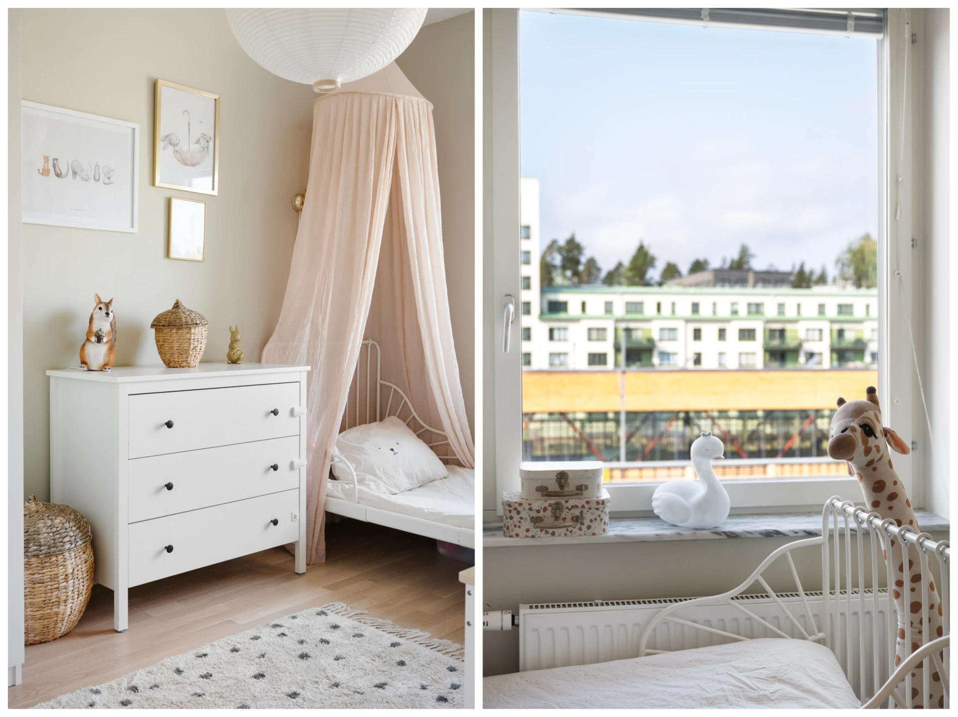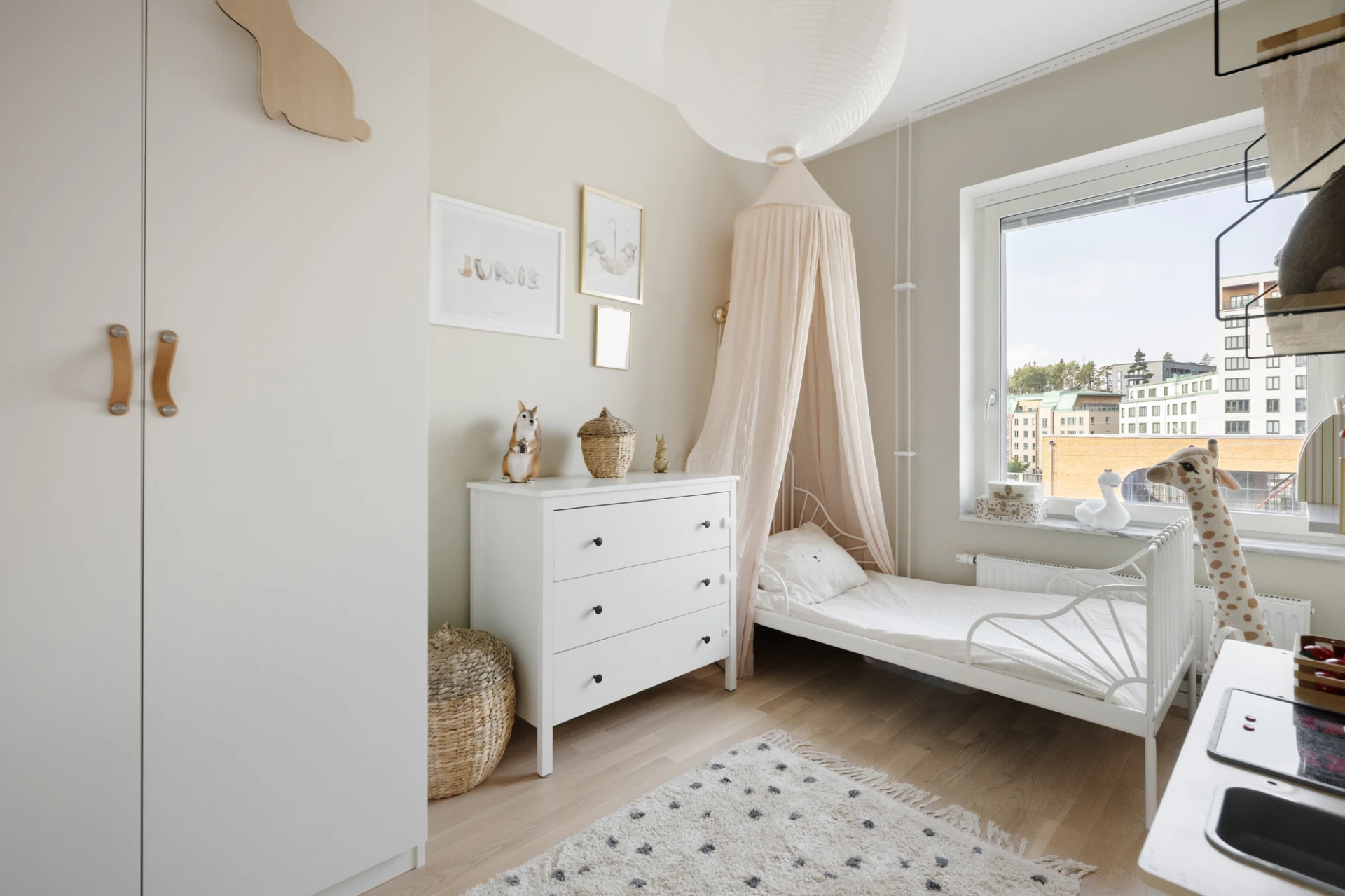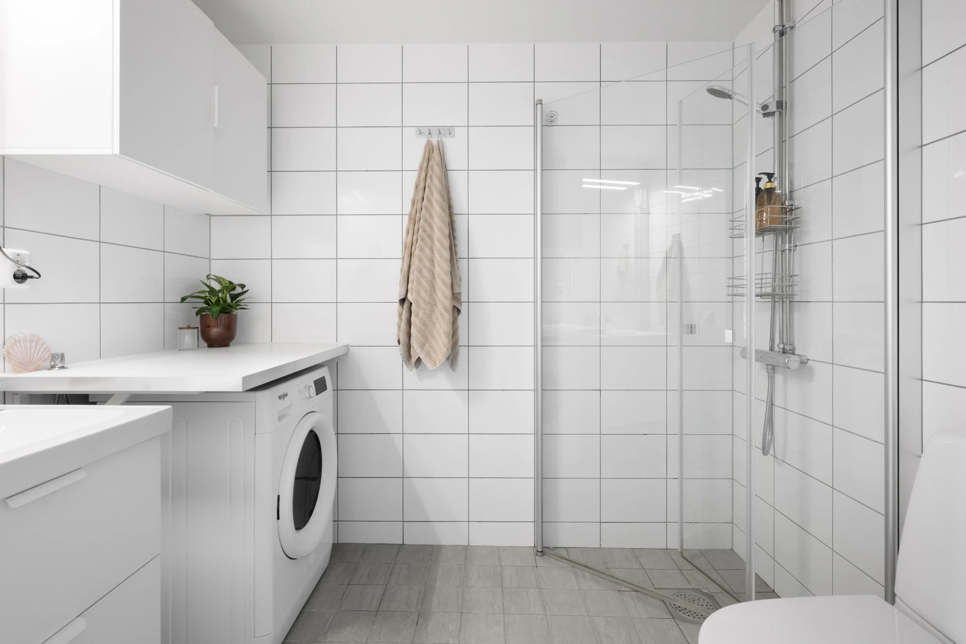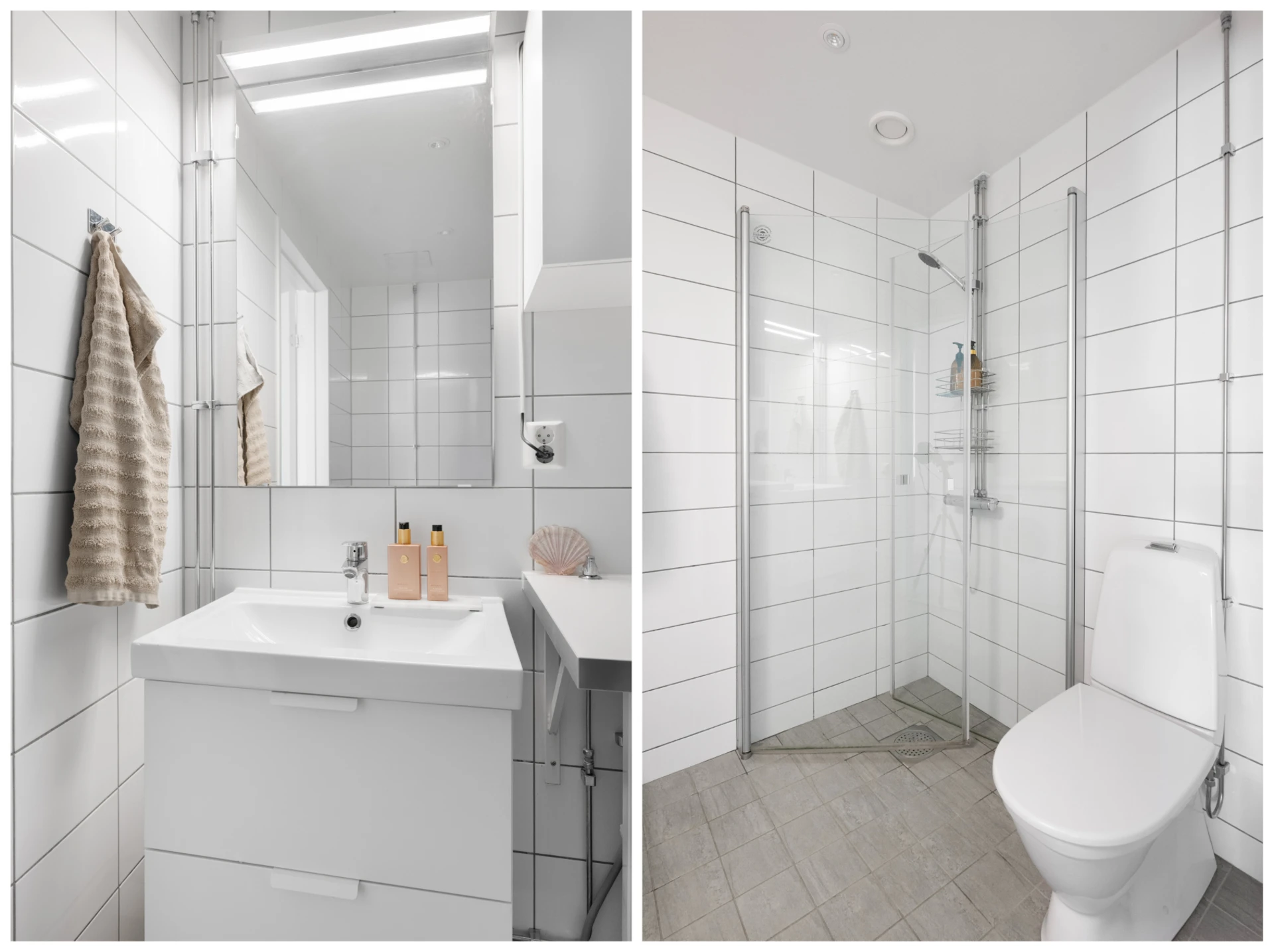 Det helkaklade badrummet är både elegant och funktionellt, utrustat med tvättmaskin, torktumlare, arbetsbänk och bra förvaring. Det större sovrummet vetter mot föreningens trevliga innergård och rymmer en dubbelsäng med tillhörande möblemang. Det andra sovrummet fungerar lika väl som barnrum, kontor eller gästrum och har plats för både säng, skrivbord och förvaring.