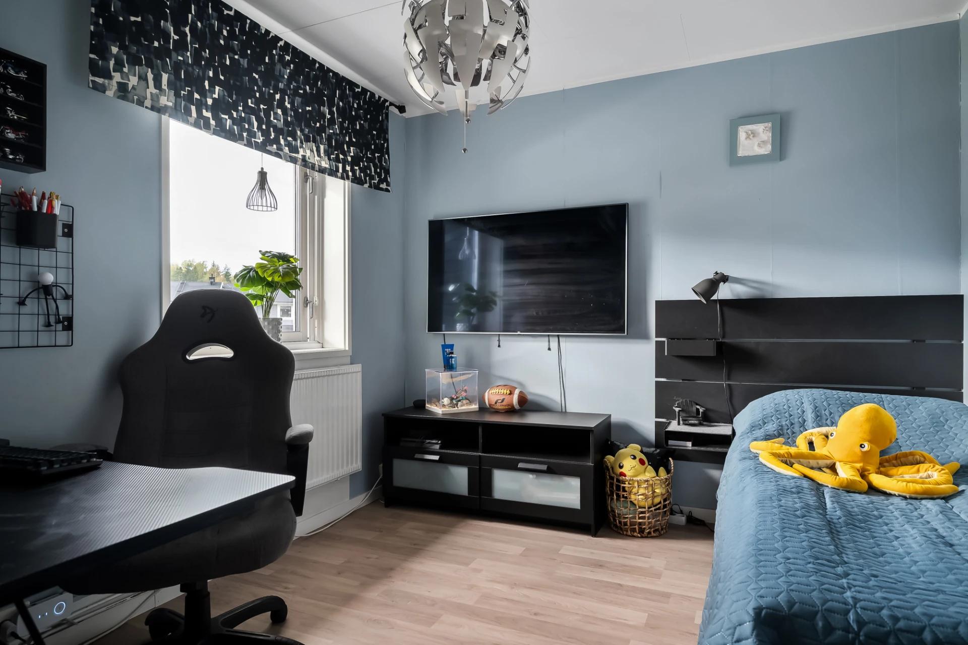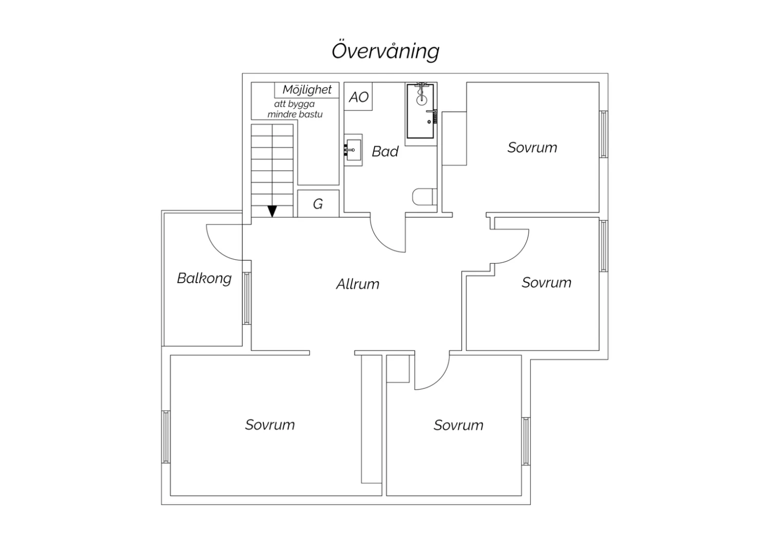 På övervåningen väntar fyra sovrum, allrum och balkong. Här finns gott om plats för både familj och gäster. Badrummet på övervåningen är fräscht med nyare inredning och målade väggar. Det finns utrymme för att bygga ut badrummet ytterligare med bastu eller relax-avdelning.