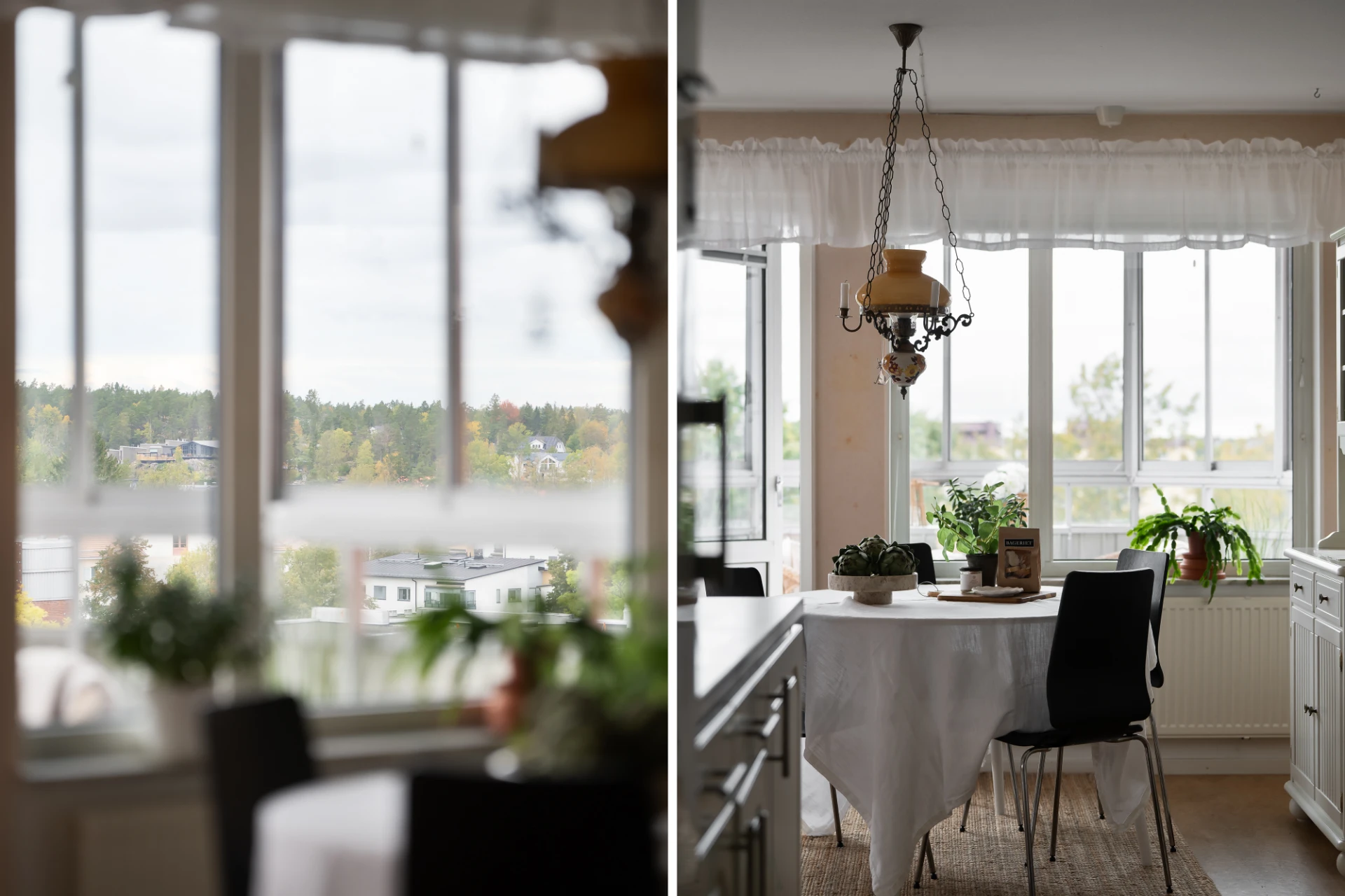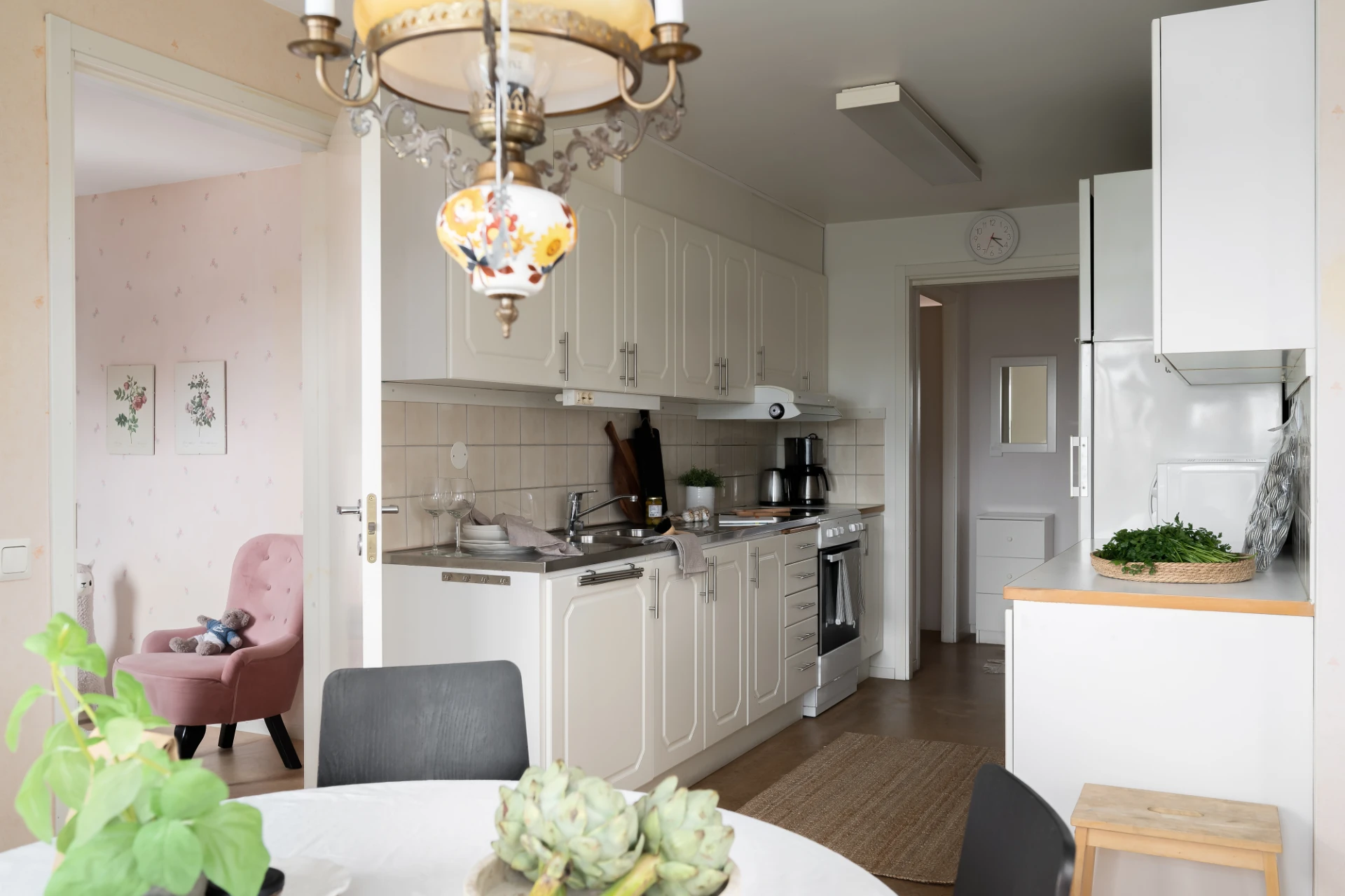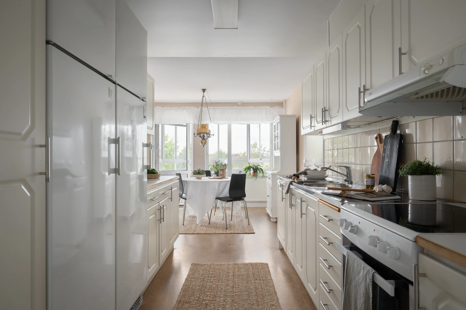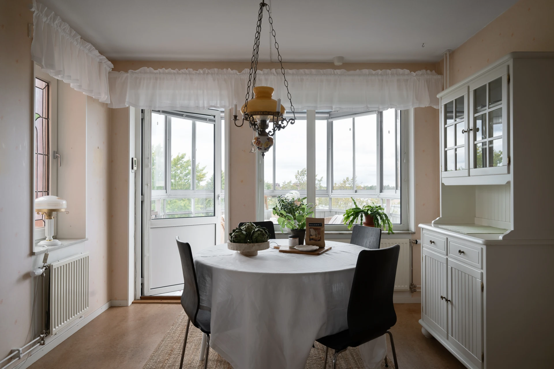 Stilrent och funktionellt kök med generösa arbetsytor och gott om skåpförvaring. Vita luckor, bänkskiva och matchande kakel ger ett klassiskt och tidlöst uttryck. Utrustat med kyl, frys, spis med ugn, fläkt och diskmaskin. Matplats vid fönster med plats för 4–6 personer – perfekt för både vardag och helgmiddag. Utgång till den inglasade balkongen, som blir ett extra rum stora delar av året – med härlig kvällssol och fri utsikt.