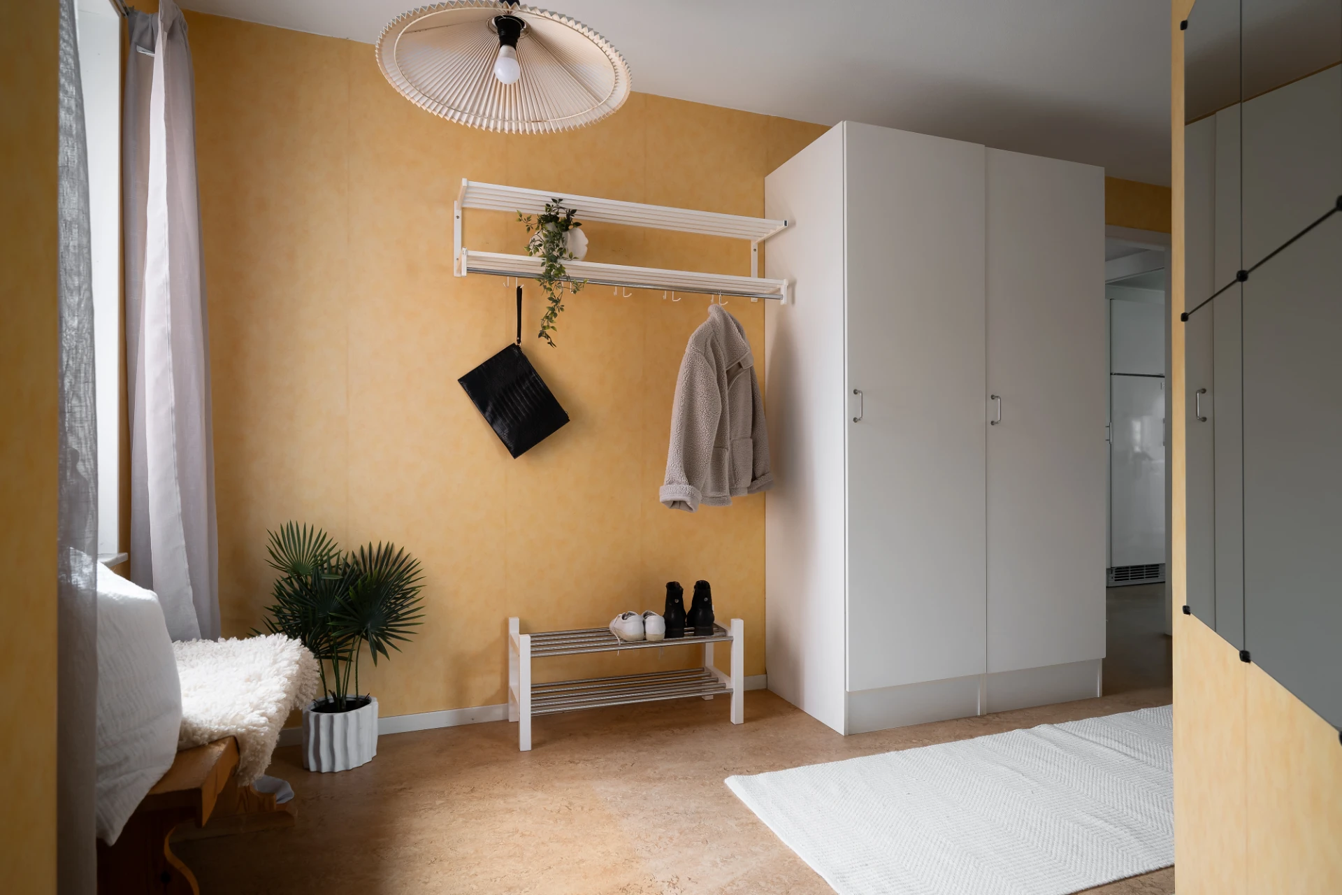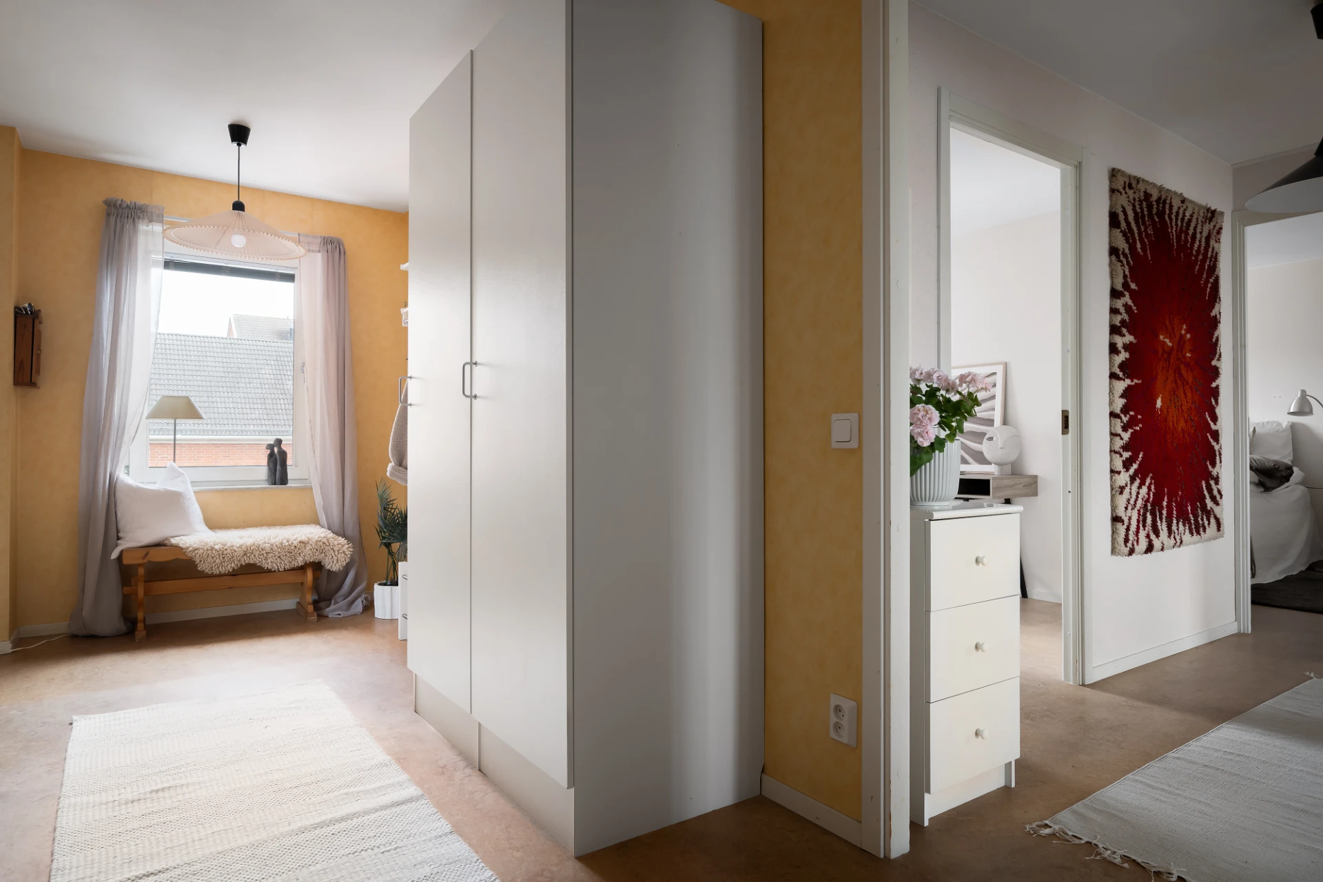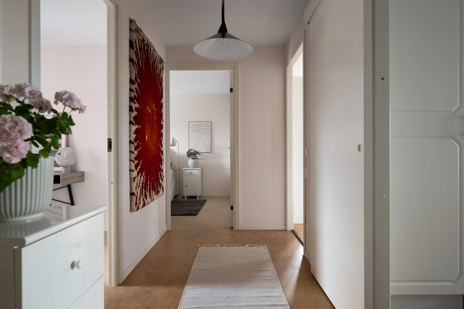 Lägenheten erbjuder tre välplanerade sovrum med många möjligheter – oavsett om du behöver barnrum, hemmakontor eller gästrum. Badrummet är fräscht och helkaklat med golvvärme, tvättmaskin och praktisk förvaring. Dessutom finns en gästtoalett – en extra bekvämlighet för vardagen. Hallen är rymlig med goda förvaringsmöjligheter.