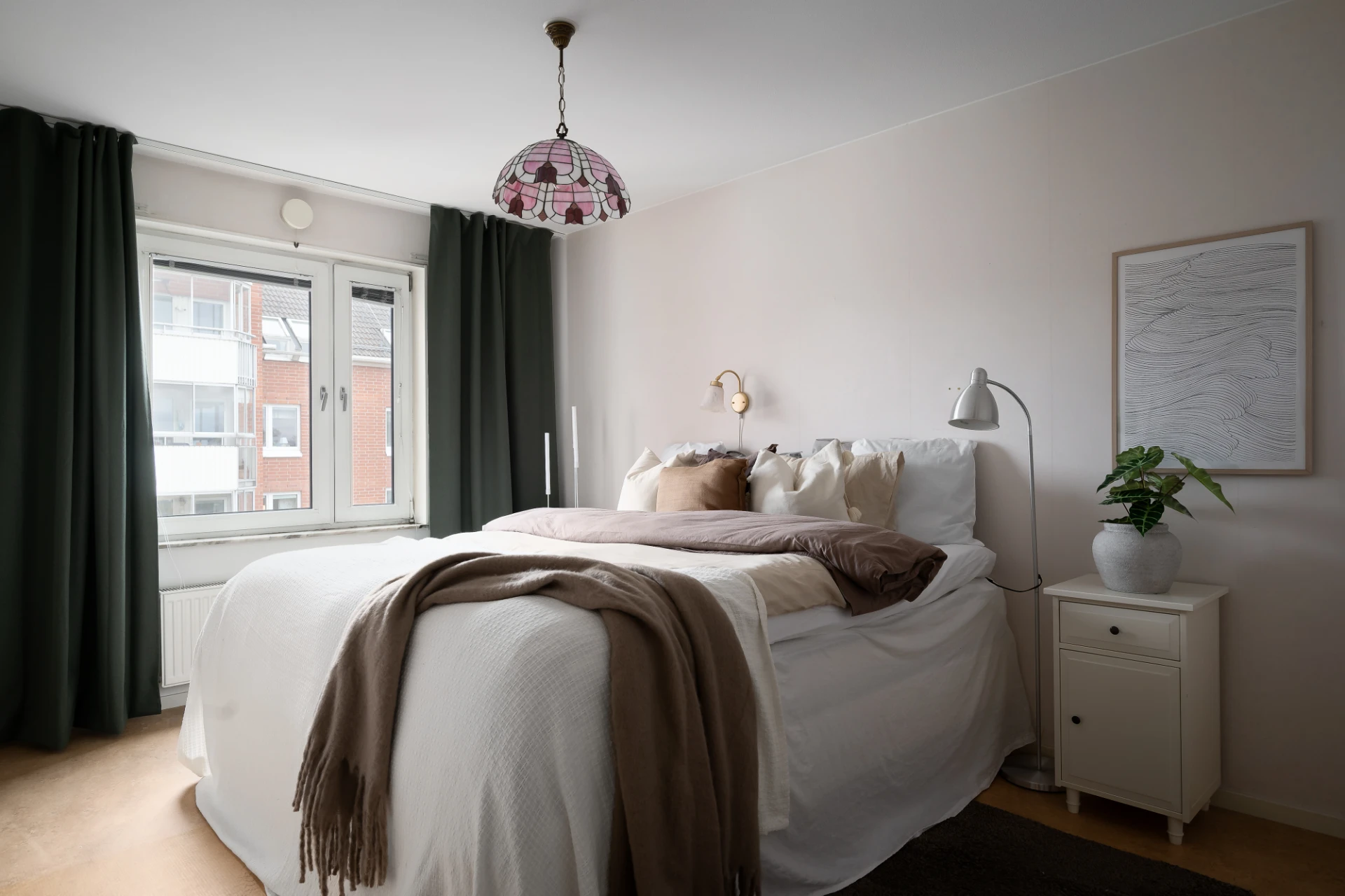 Rymligt sovrum med plats för dubbelsäng, sängbord och förvaringsmöbler. Stort fönster som ger ett härligt ljusinsläpp.