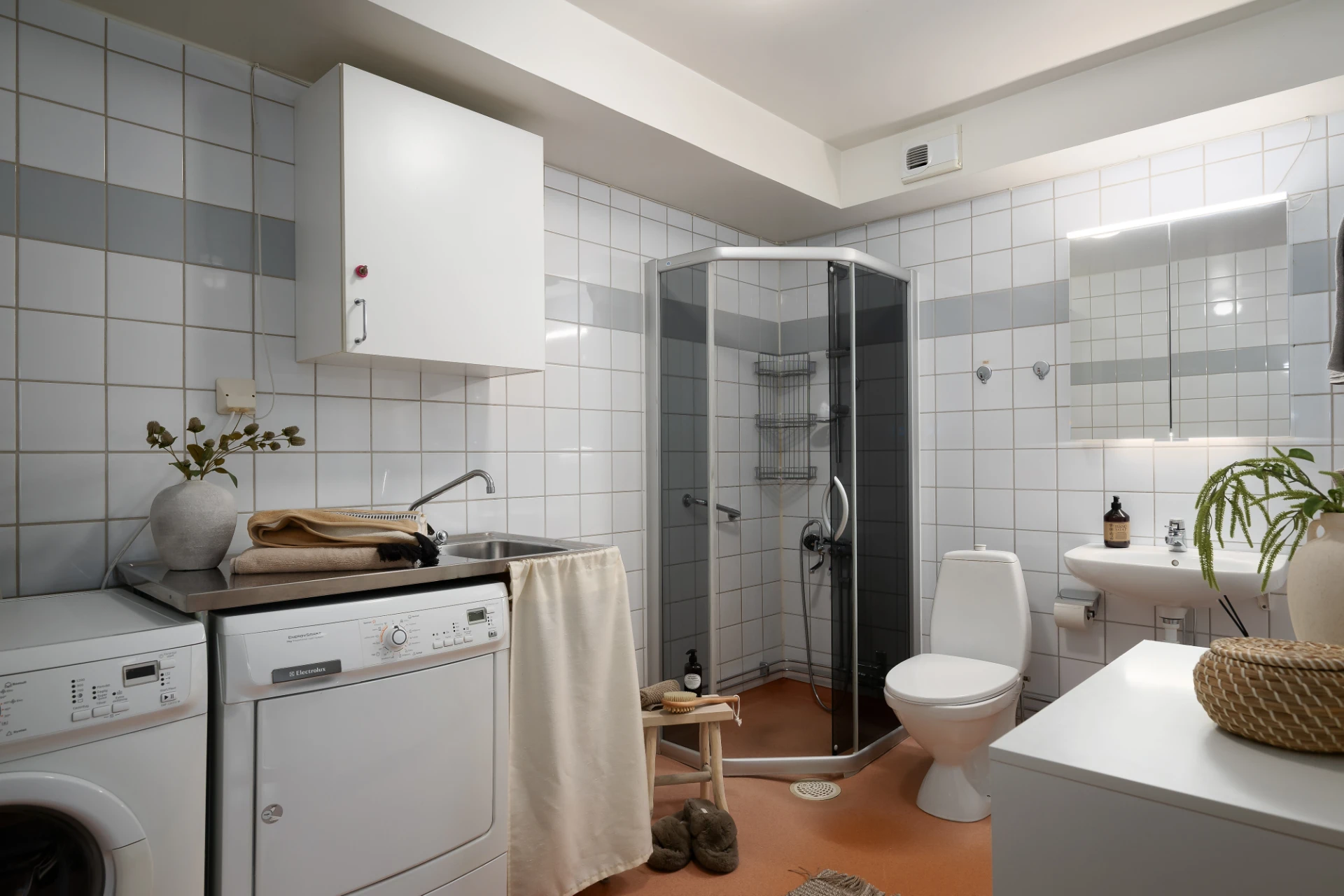 Halvkaklat badrum med dusch, tvättmaskin, torktumlare, ho samt kommod och spegelskåp.