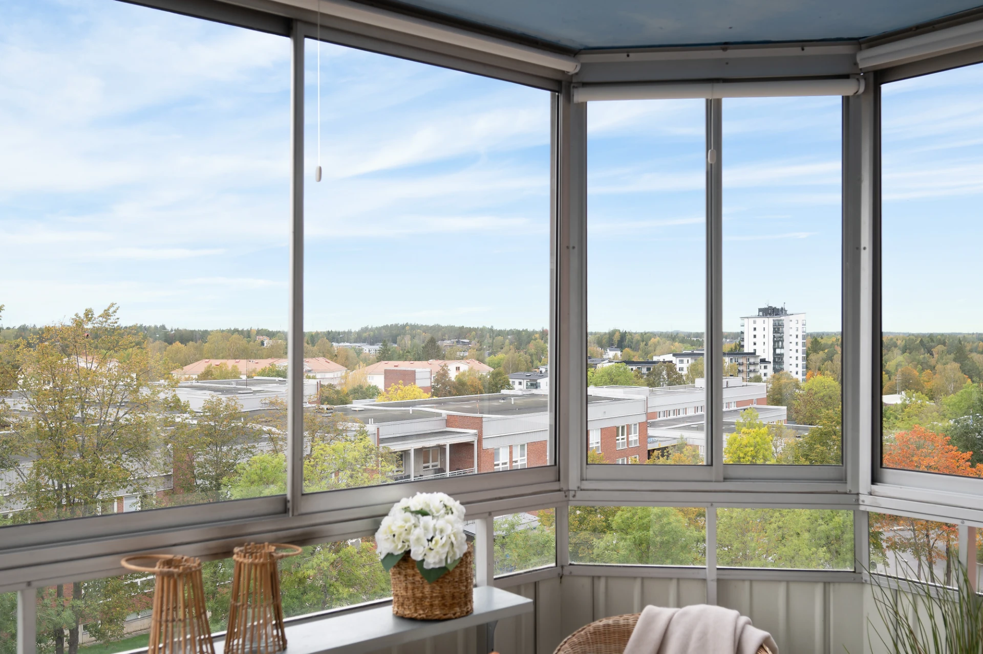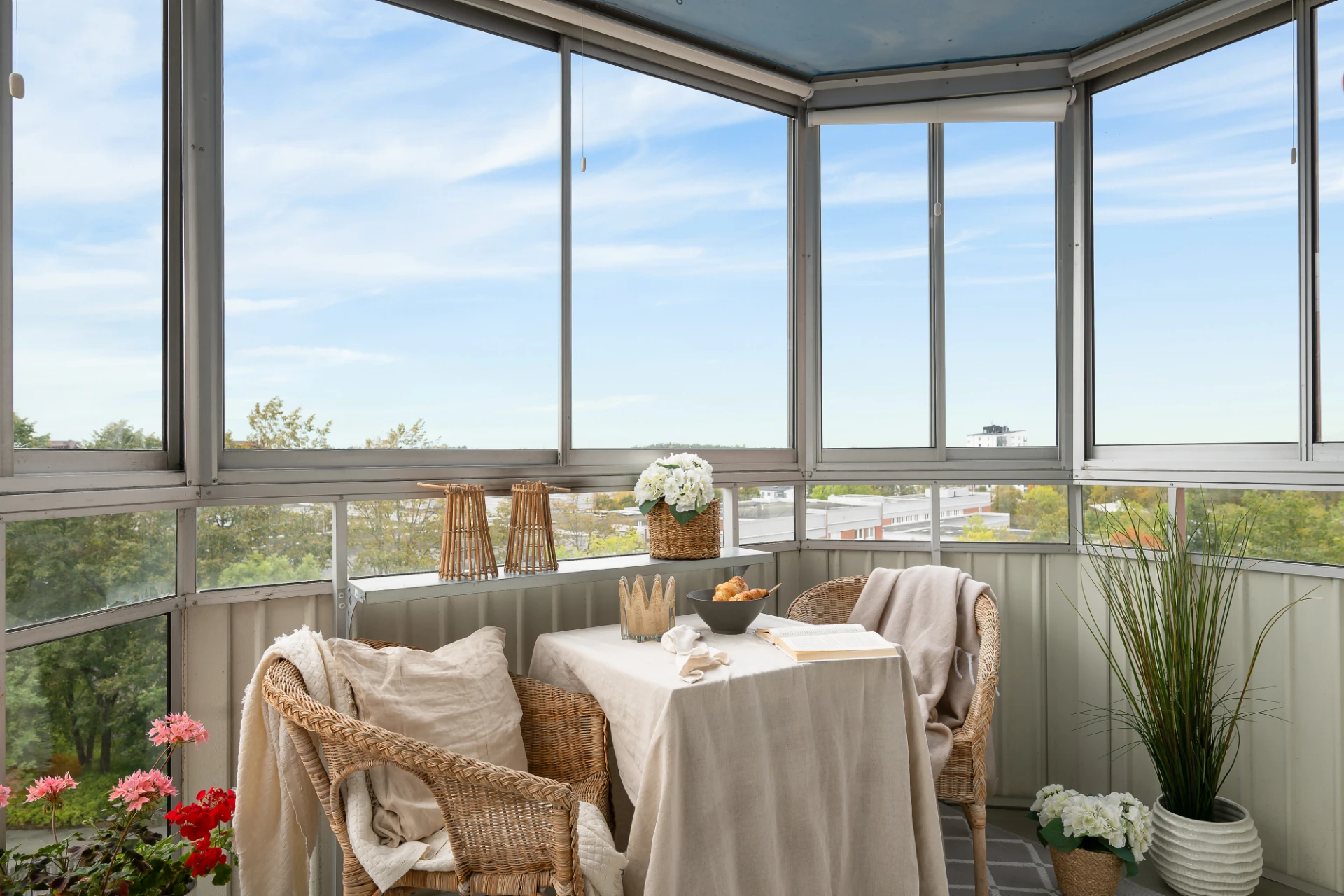 Inglasad balkong med kvällssol och fri utsikt. En riktig oas att njuta av året runt – för morgonkaffe, kvällsdrink eller avkoppling i lugn och ro.