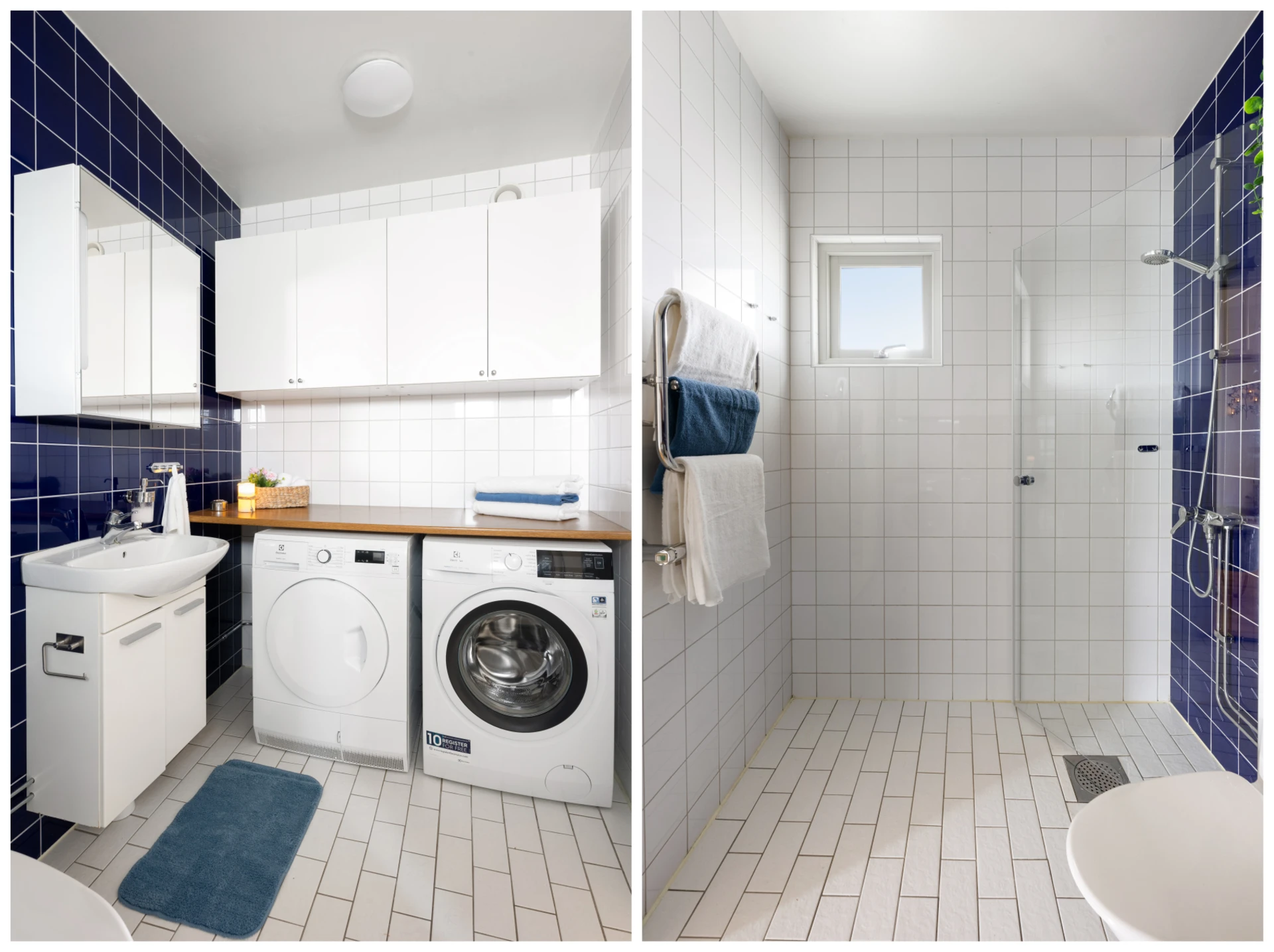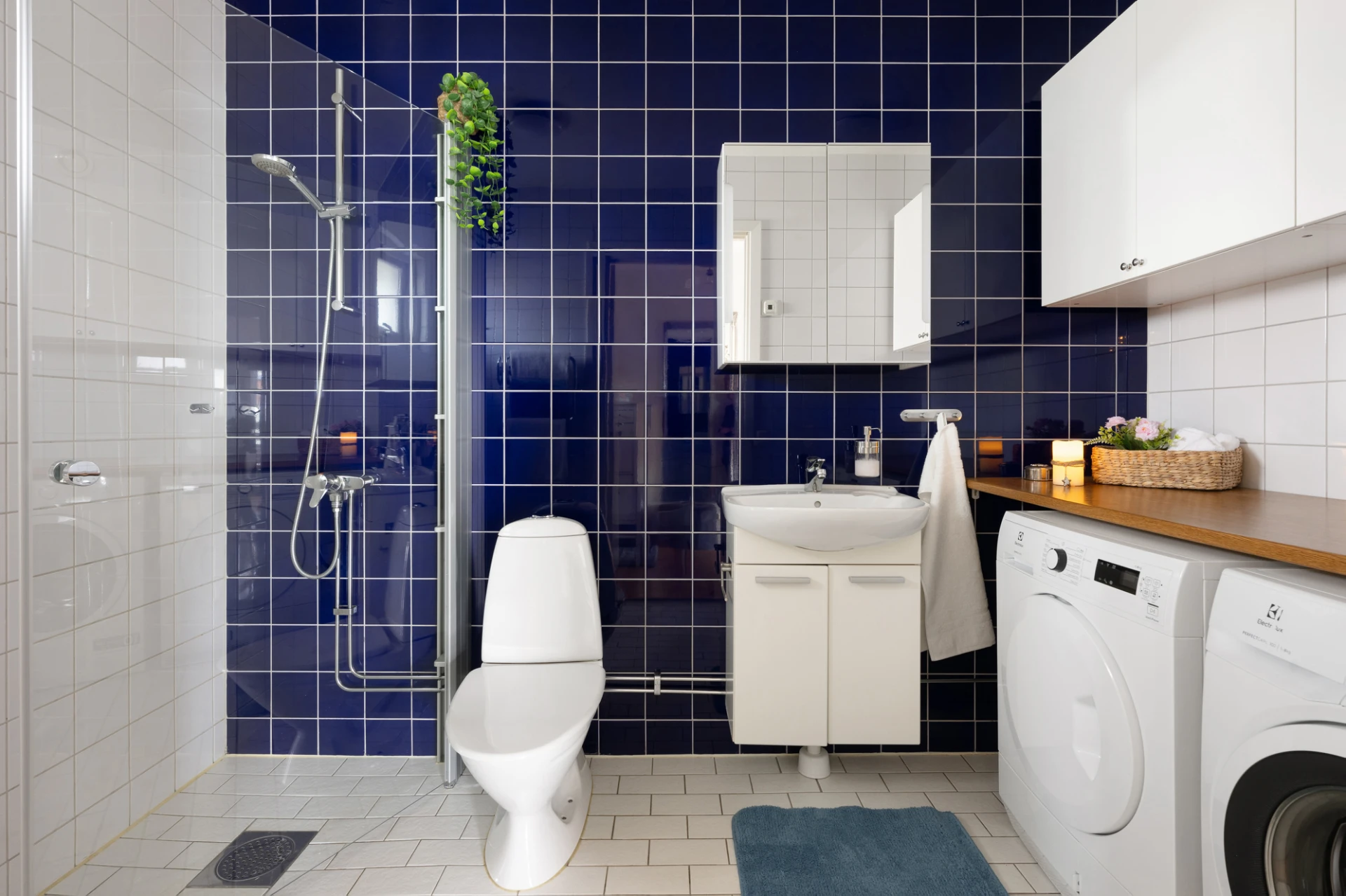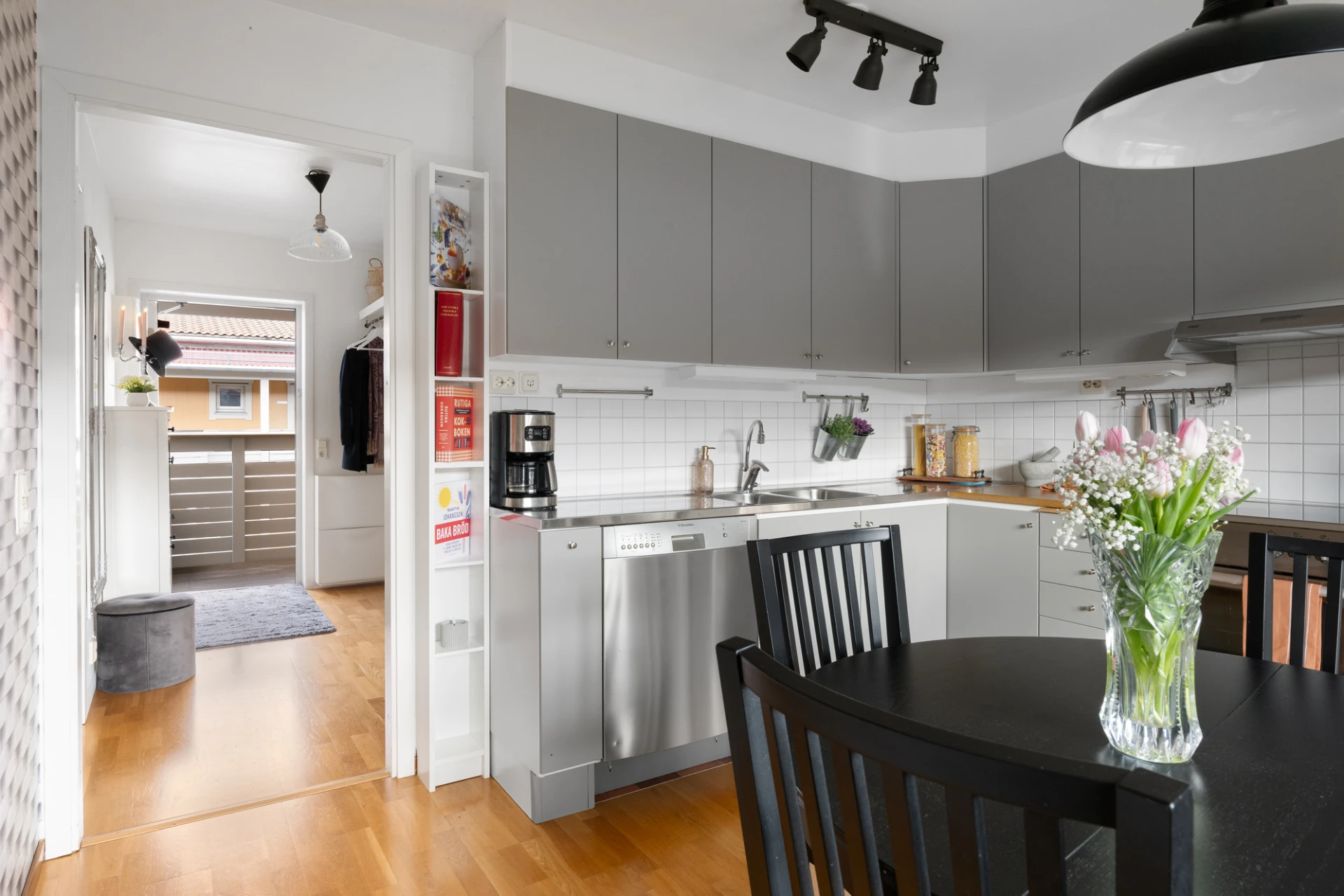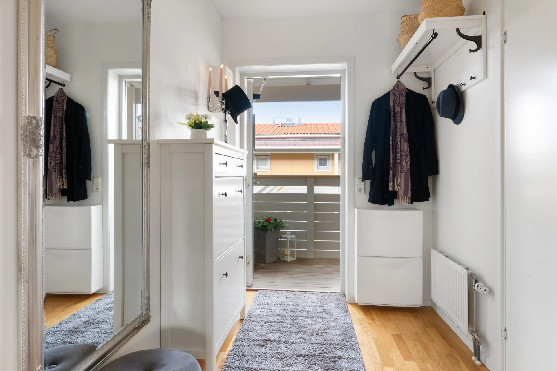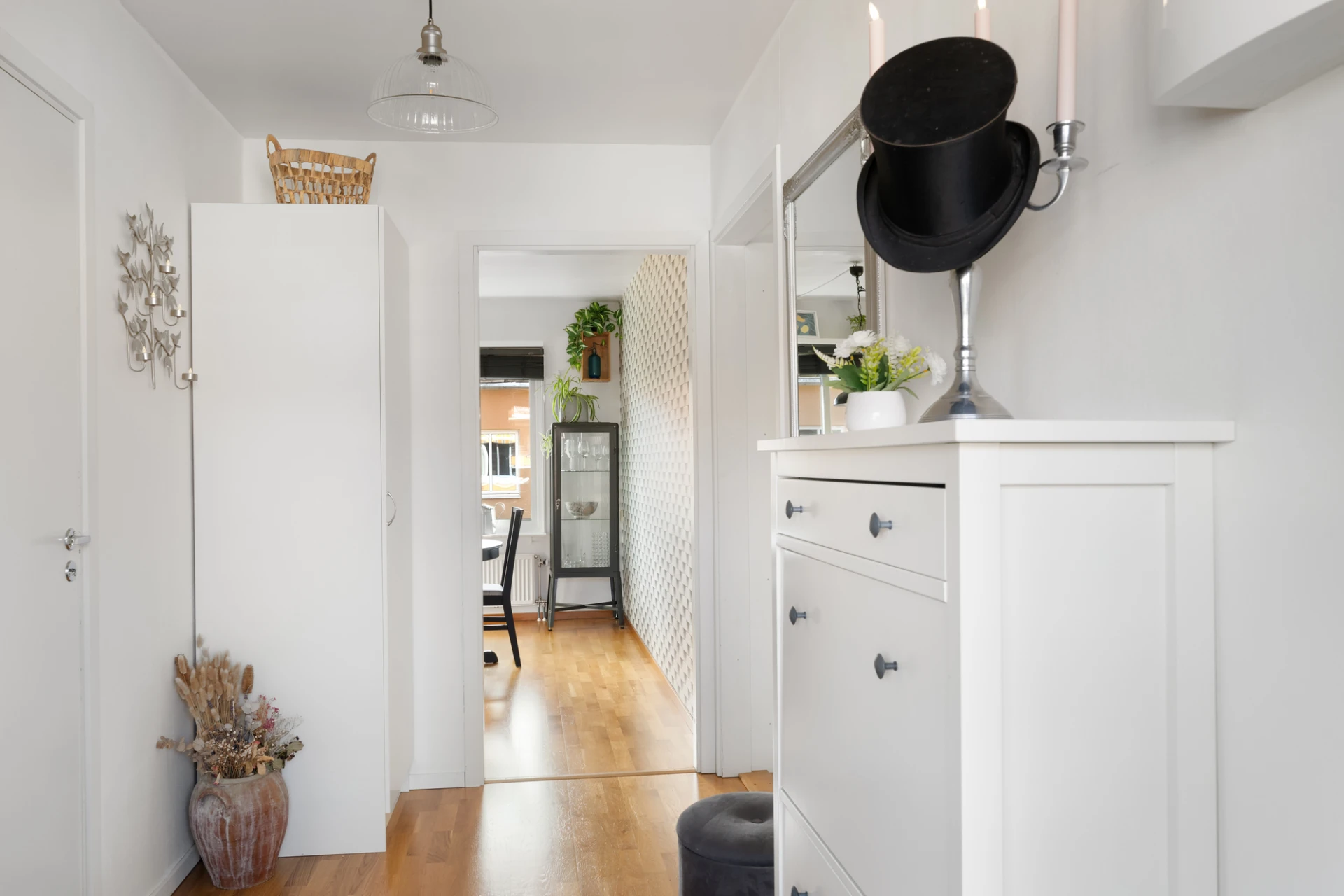 Du välkomnas av en rymlig hall med flera garderober som ger goda förvaringsmöjligheter direkt vid entrén. Till vänster ligger det helkaklade badrummet som är utrustat med både tvättmaskin och torktumlare – en praktisk lösning som underlättar vardagen.