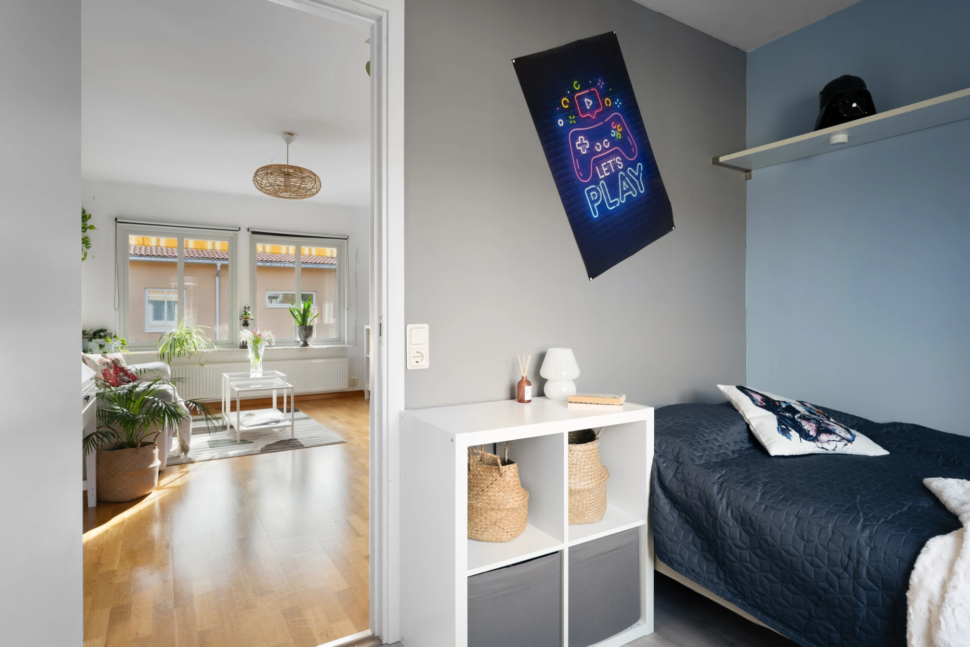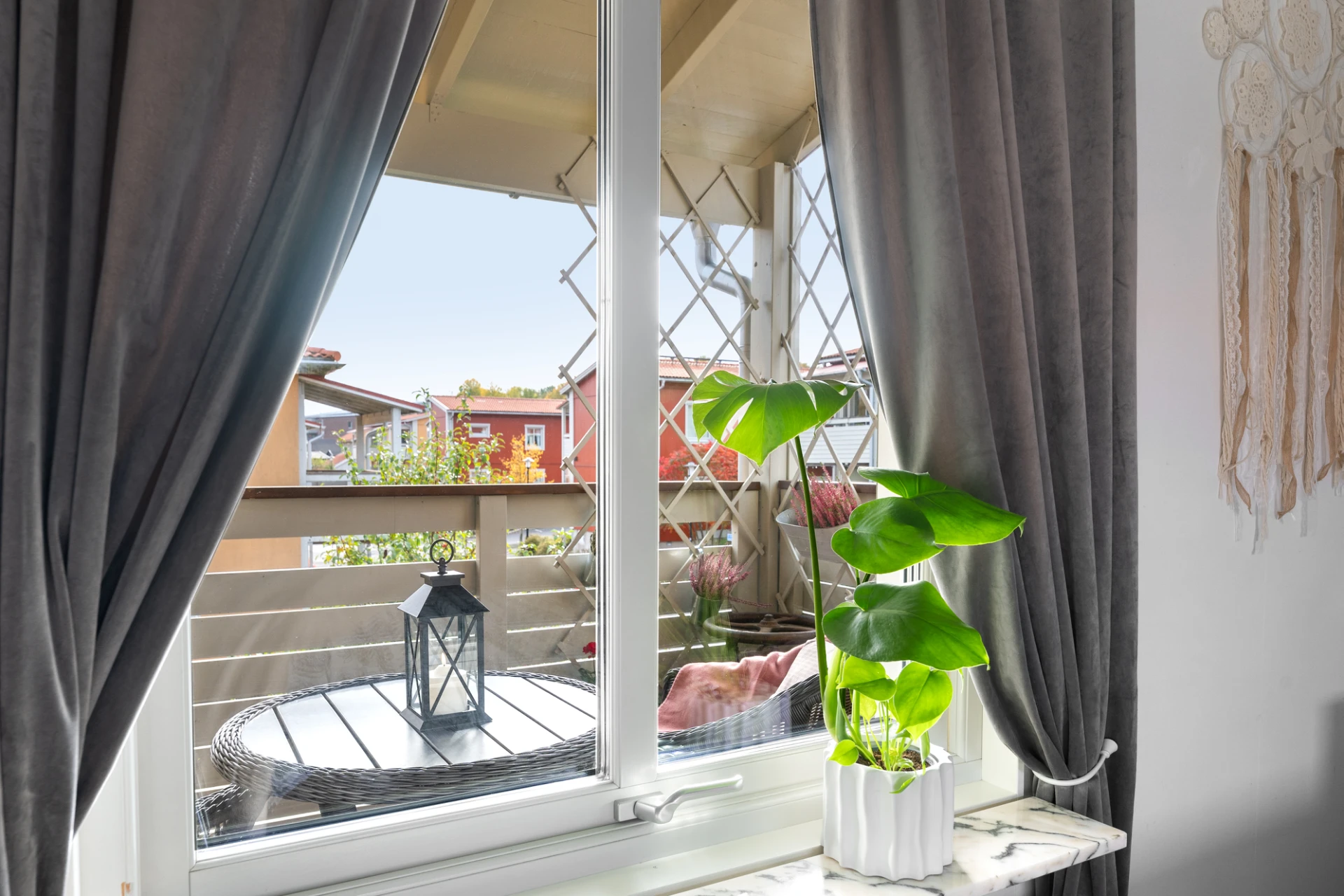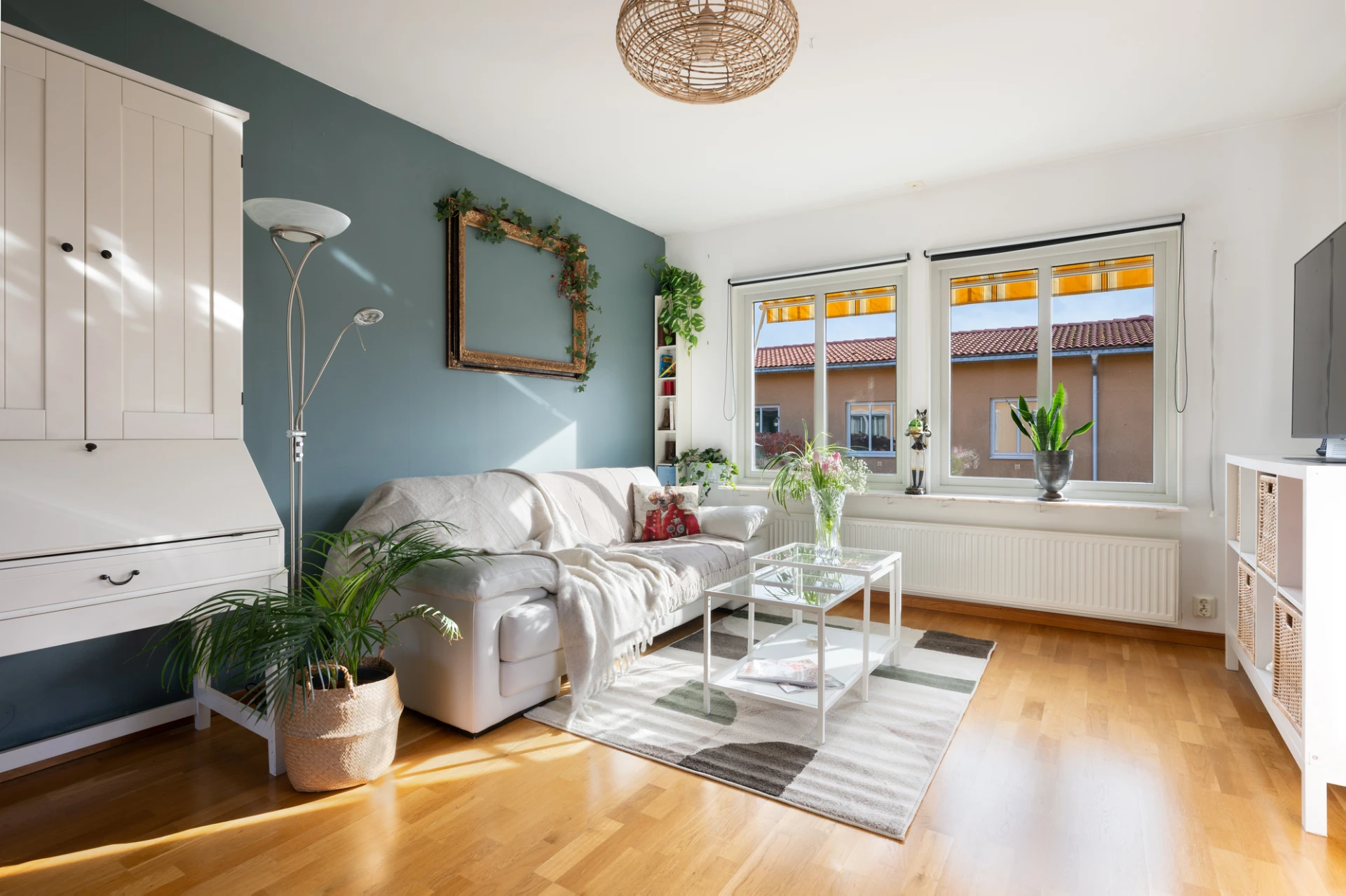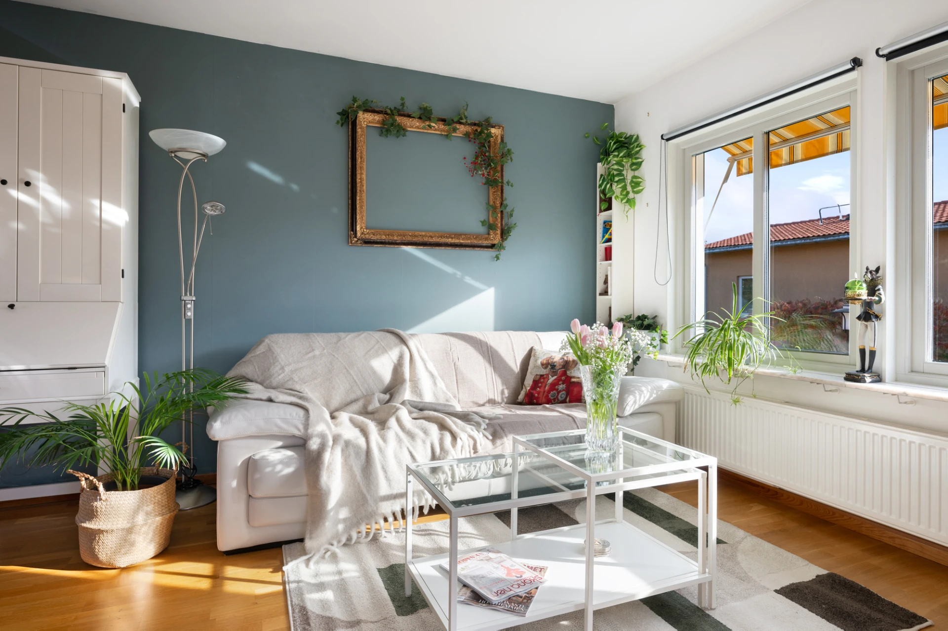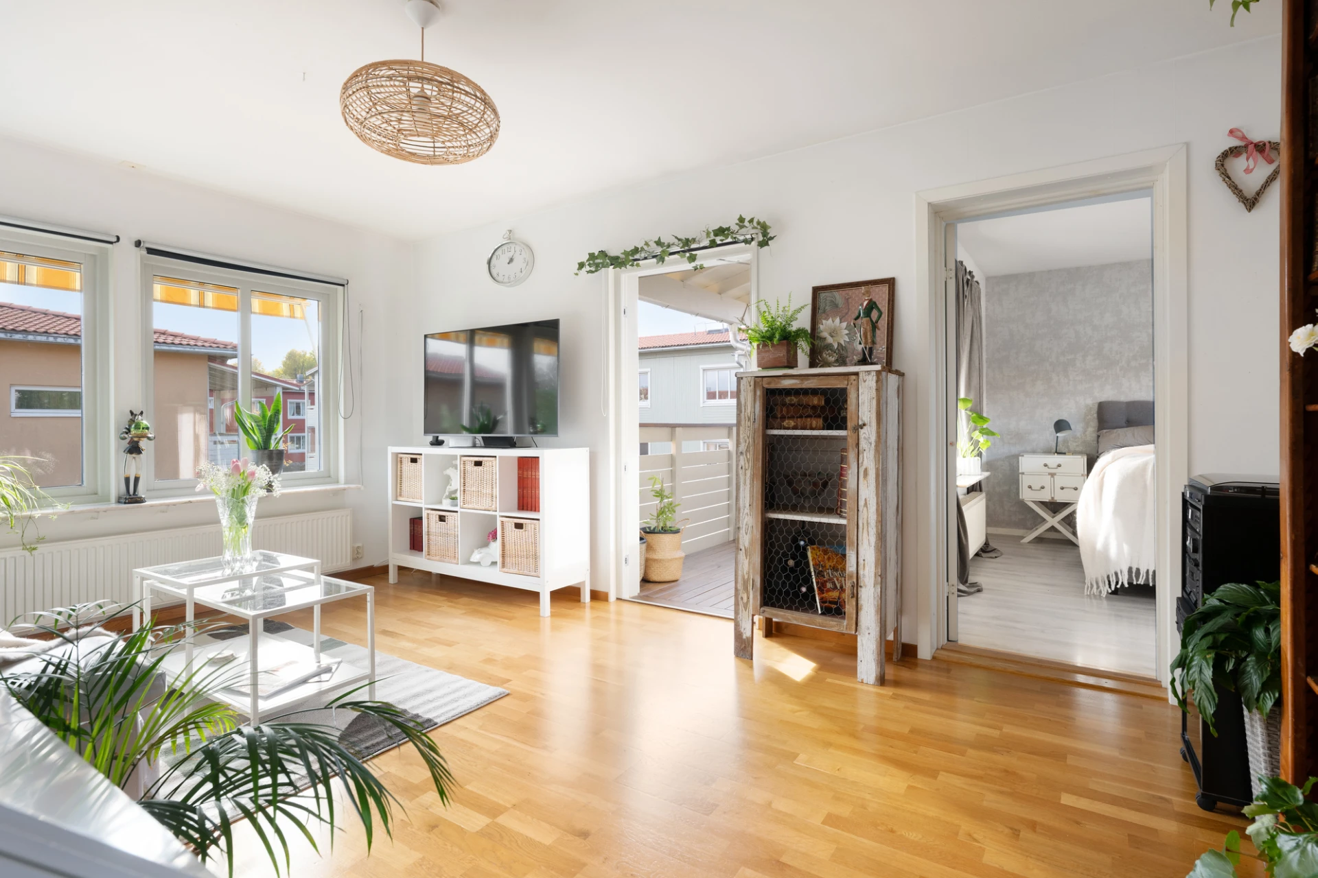 Det rymliga vardagsrummet har stora fönster i två väderstreck som släpper in rikligt med ljus, vilket skapar en ljus och luftig känsla. Härifrån har du även direkt utgång till balkongen – en härlig plats att njuta av solen under årets varmare månader.