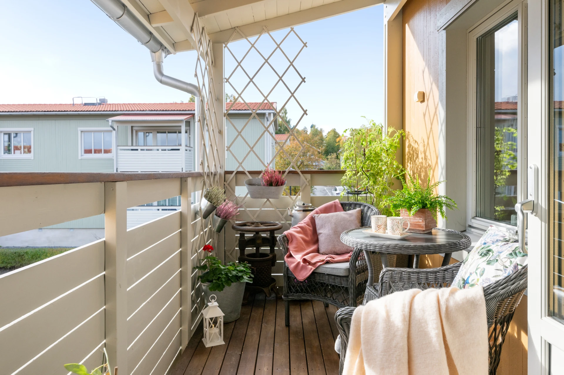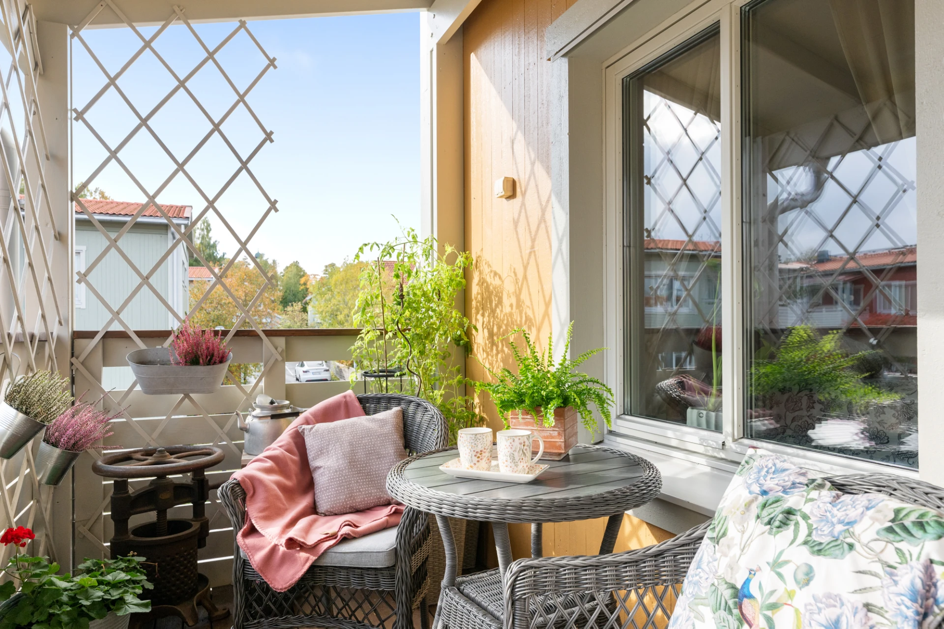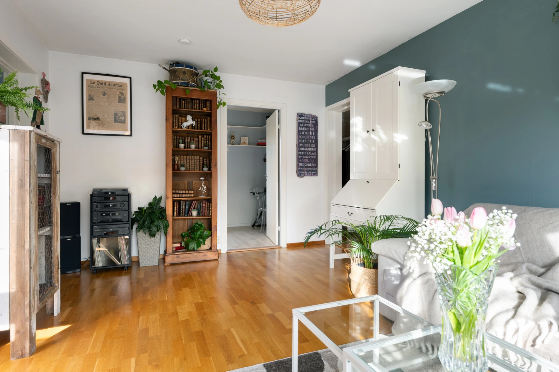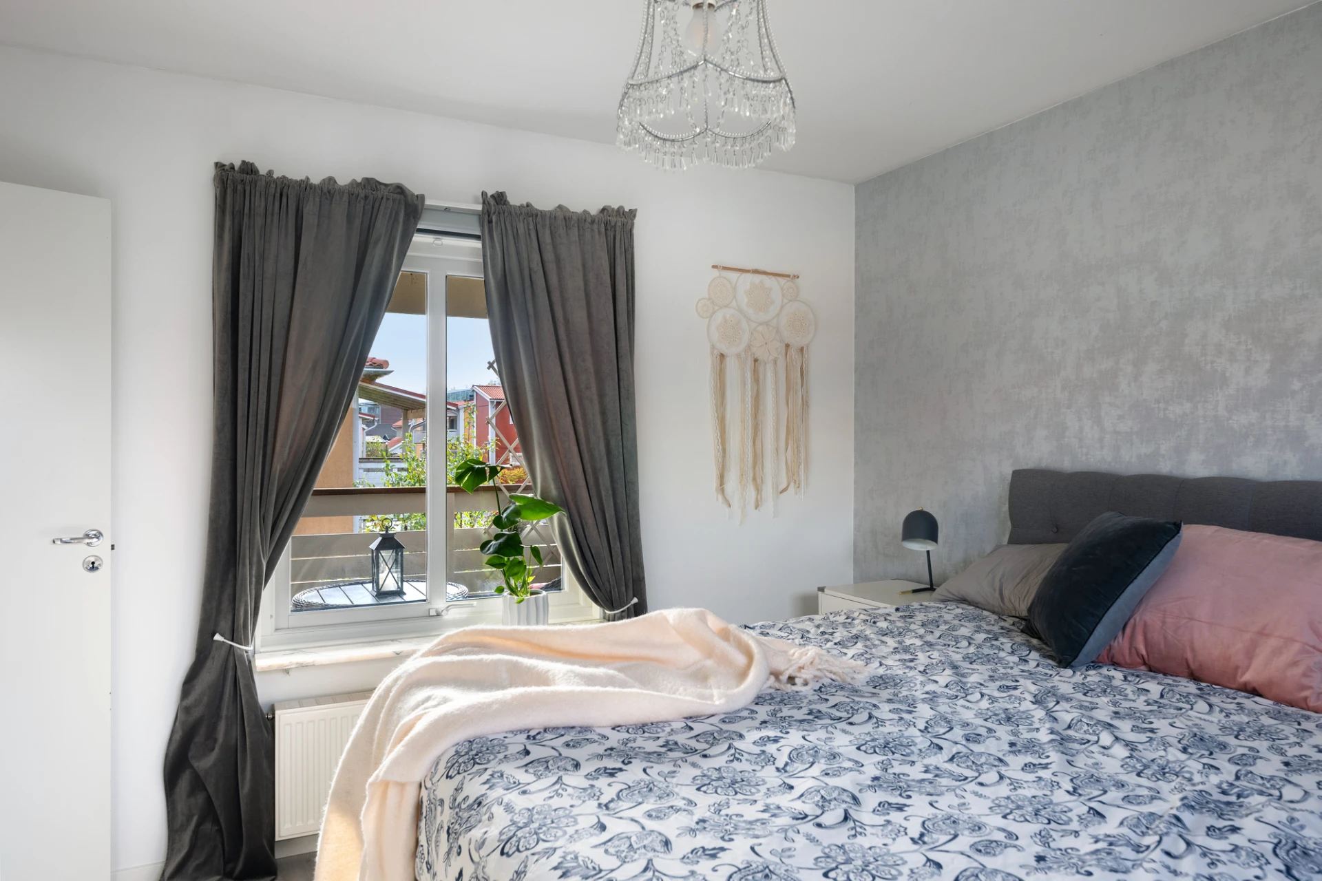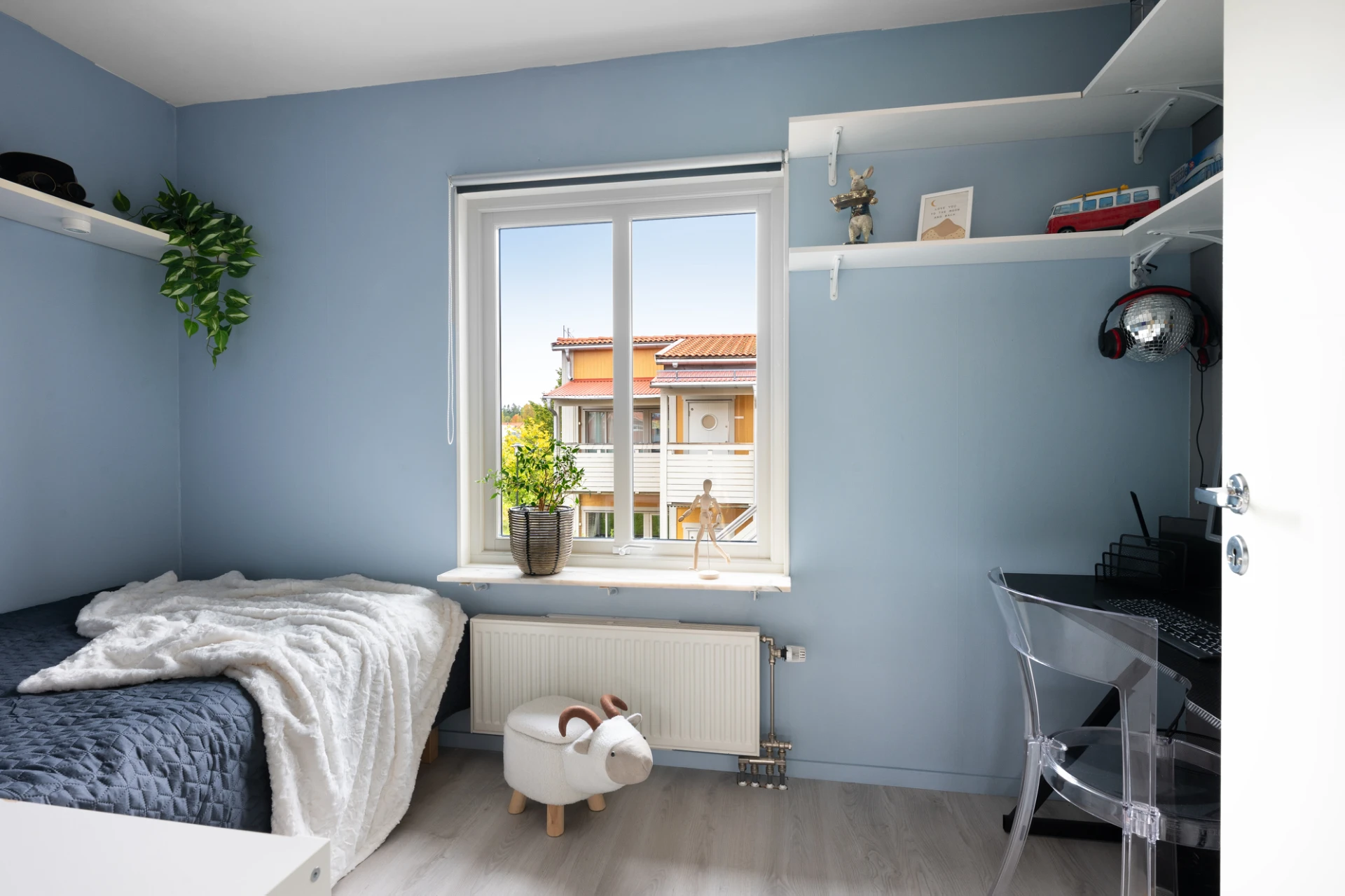 Det rymliga vardagsrummet har stora fönster i två väderstreck som släpper in rikligt med ljus, vilket skapar en ljus och luftig känsla. Härifrån har du även direkt utgång till balkongen – en härlig plats att njuta av solen under årets varmare månader.