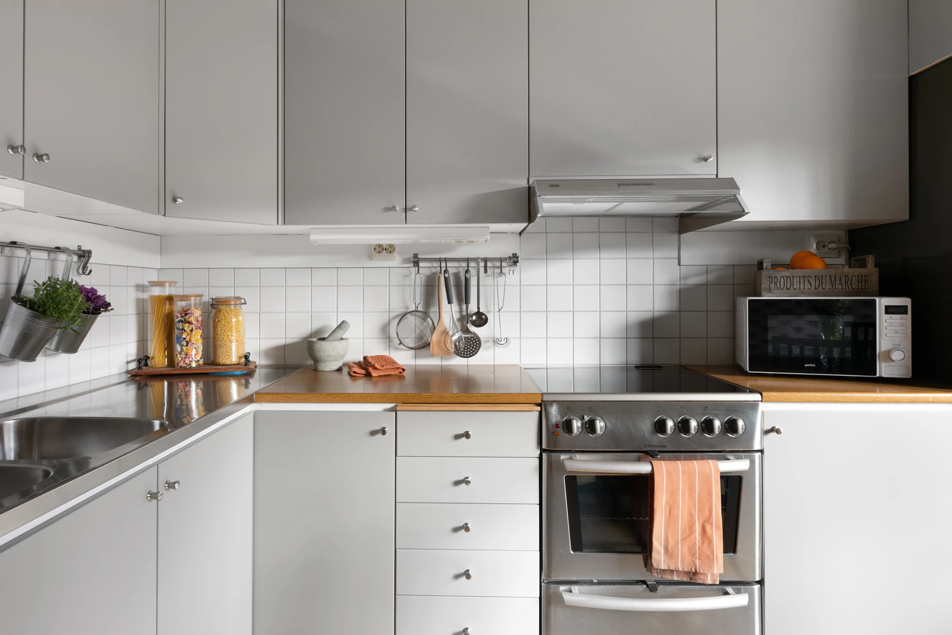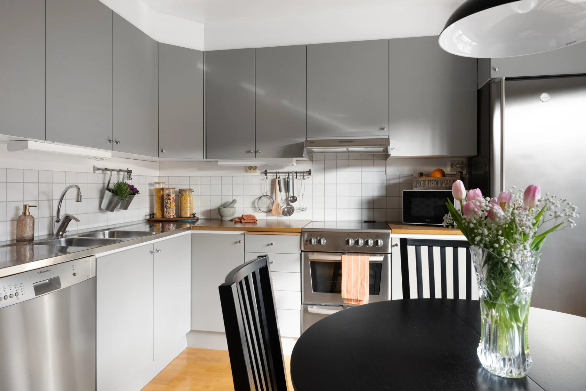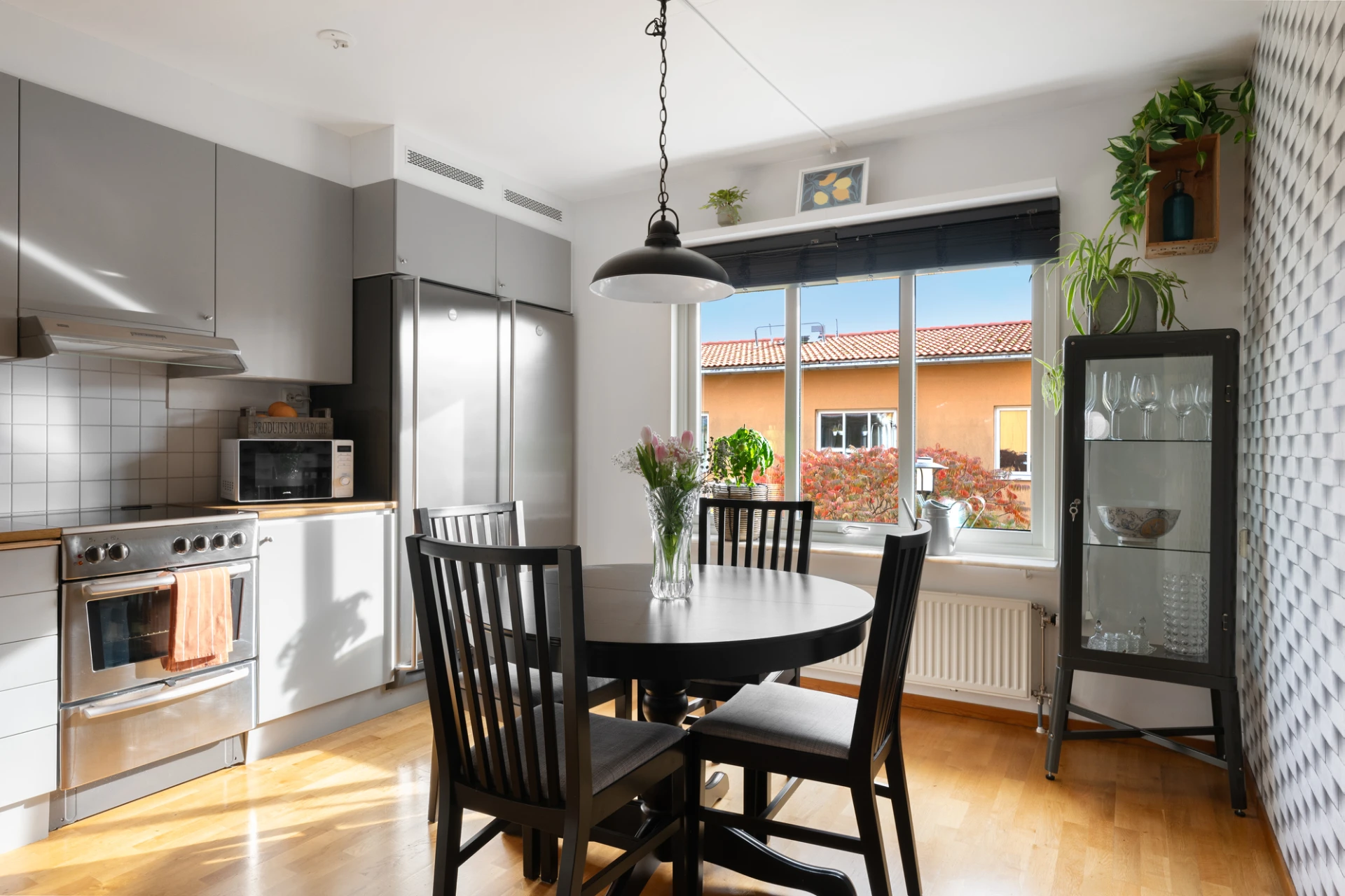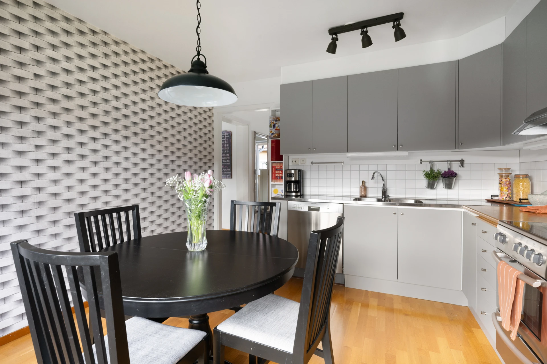 Köket är funktionellt och välutrustat med kyl, frys, diskmaskin, spis och ugn. Här finns gott om arbetsyta och plats för ett matbord, vilket gör köket till en naturlig samlingspunkt för både vardagsmiddagar och sociala stunder.
