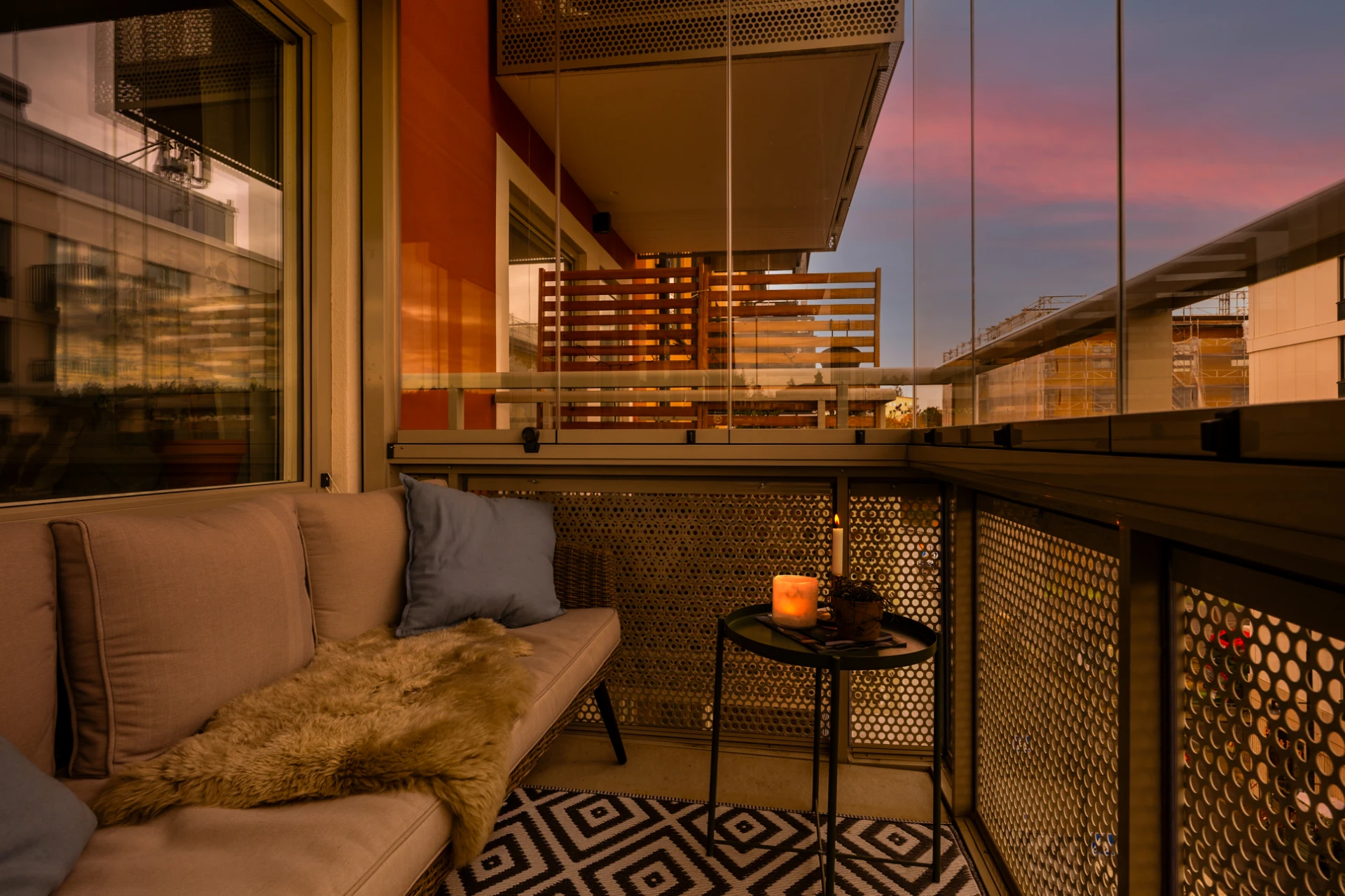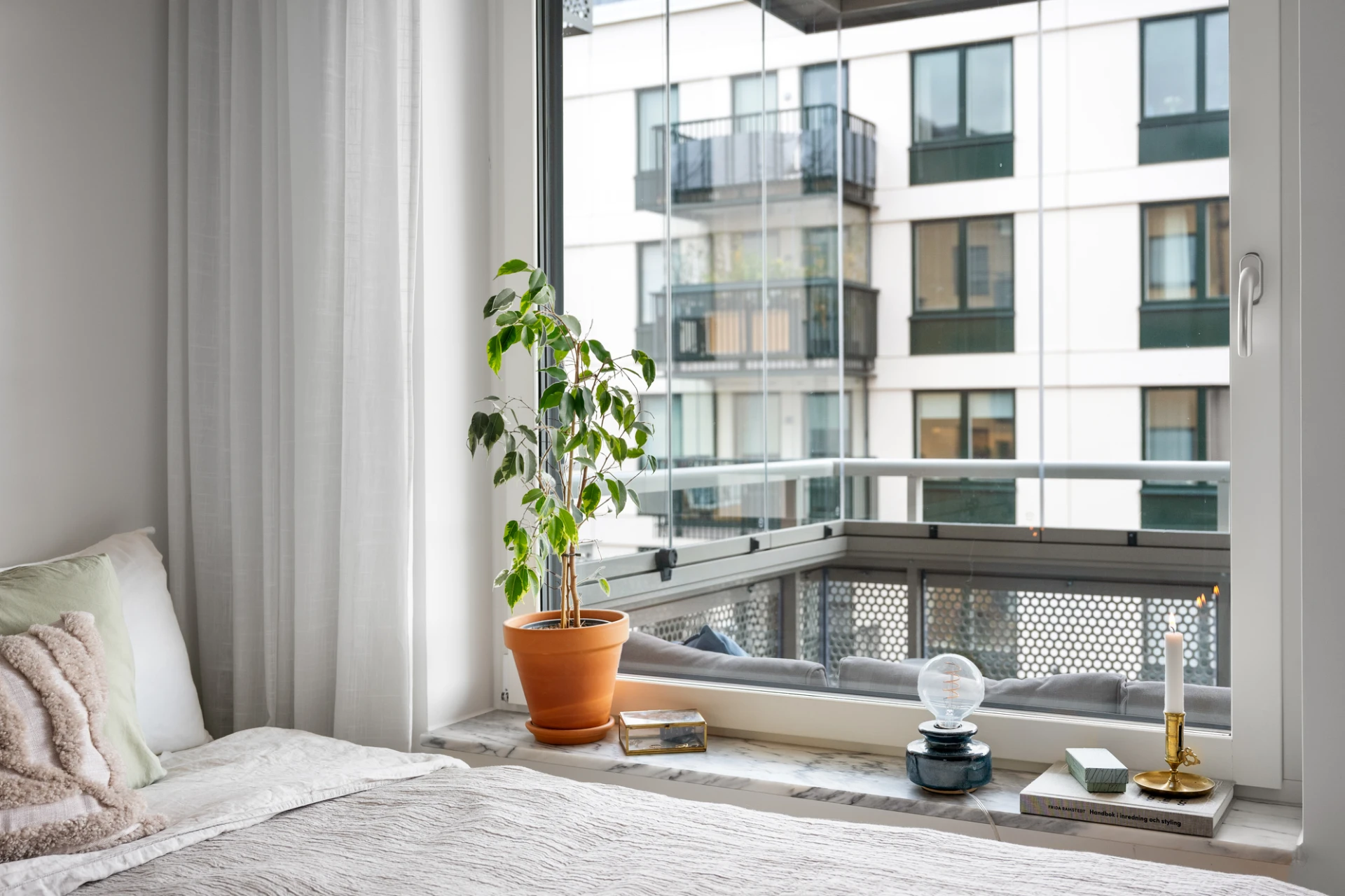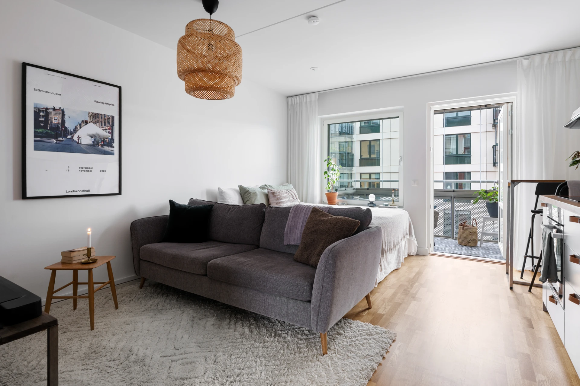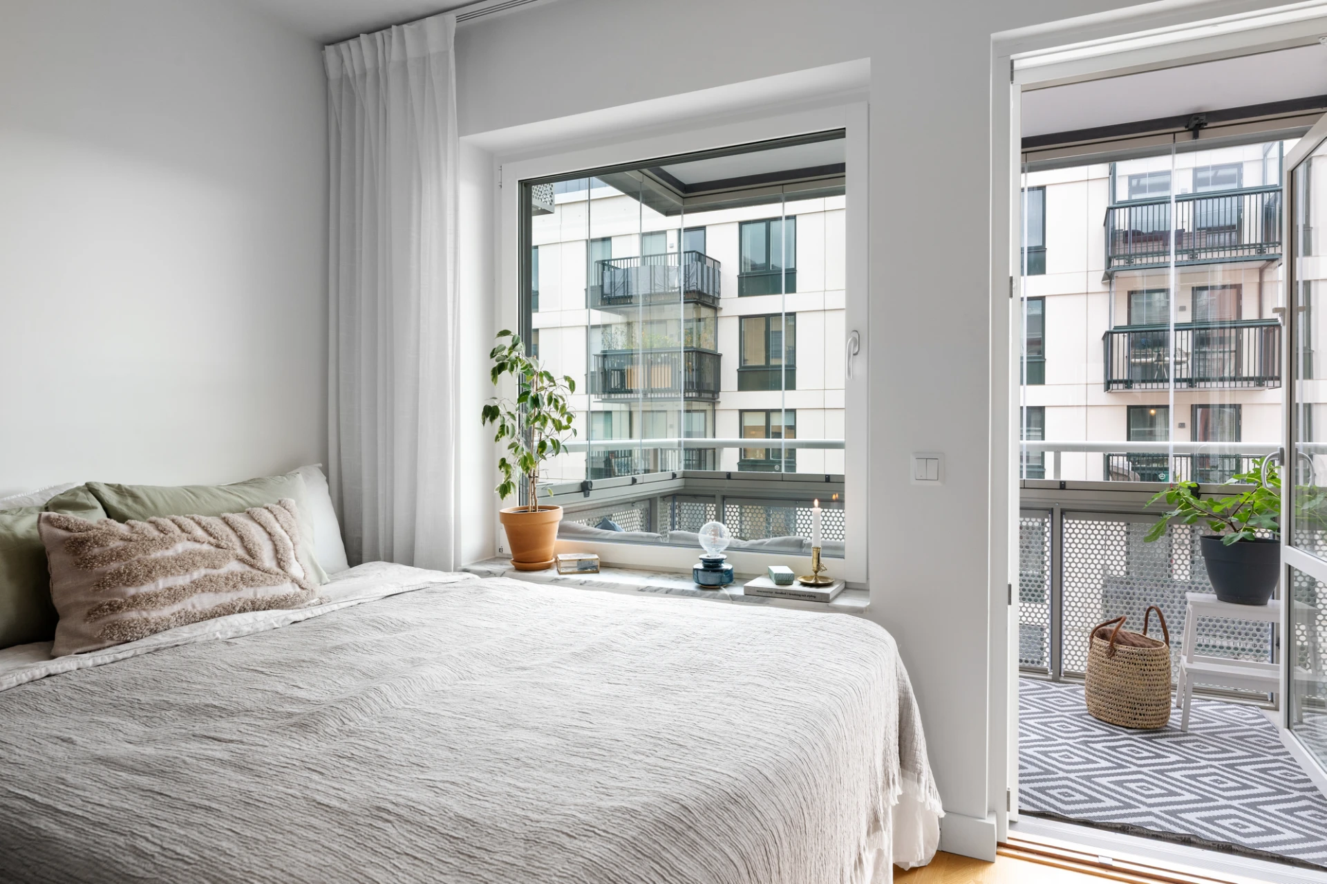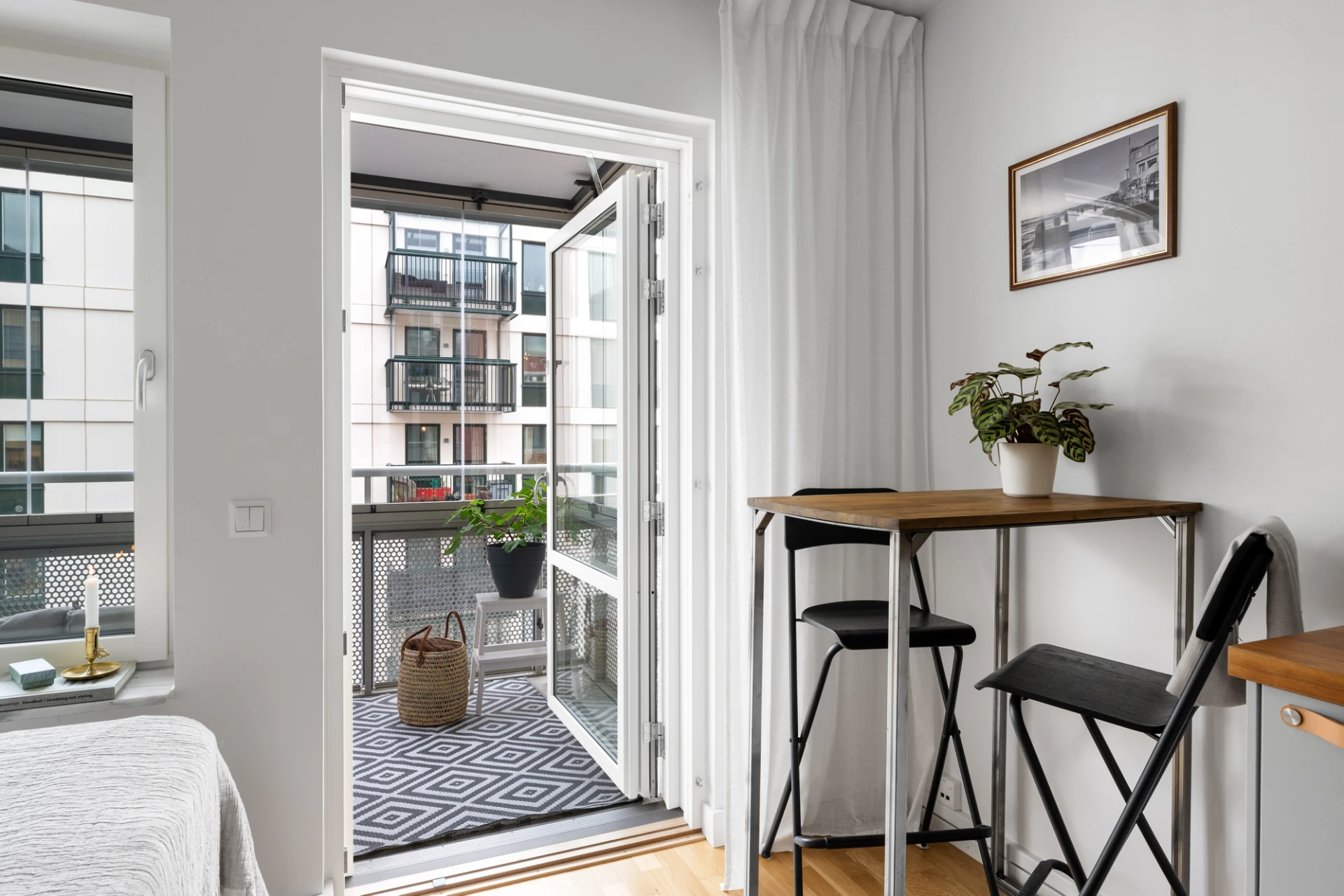 Från rummet når du en mysig balkong som bjuder in till både morgonkaffe och sköna kvällar utomhus. Lägenheten har ett fint ljusinsläpp tack vare det stora fönsterpartiet mot balkongen, vilket ger en luftig och trivsam känsla i hela rummet.