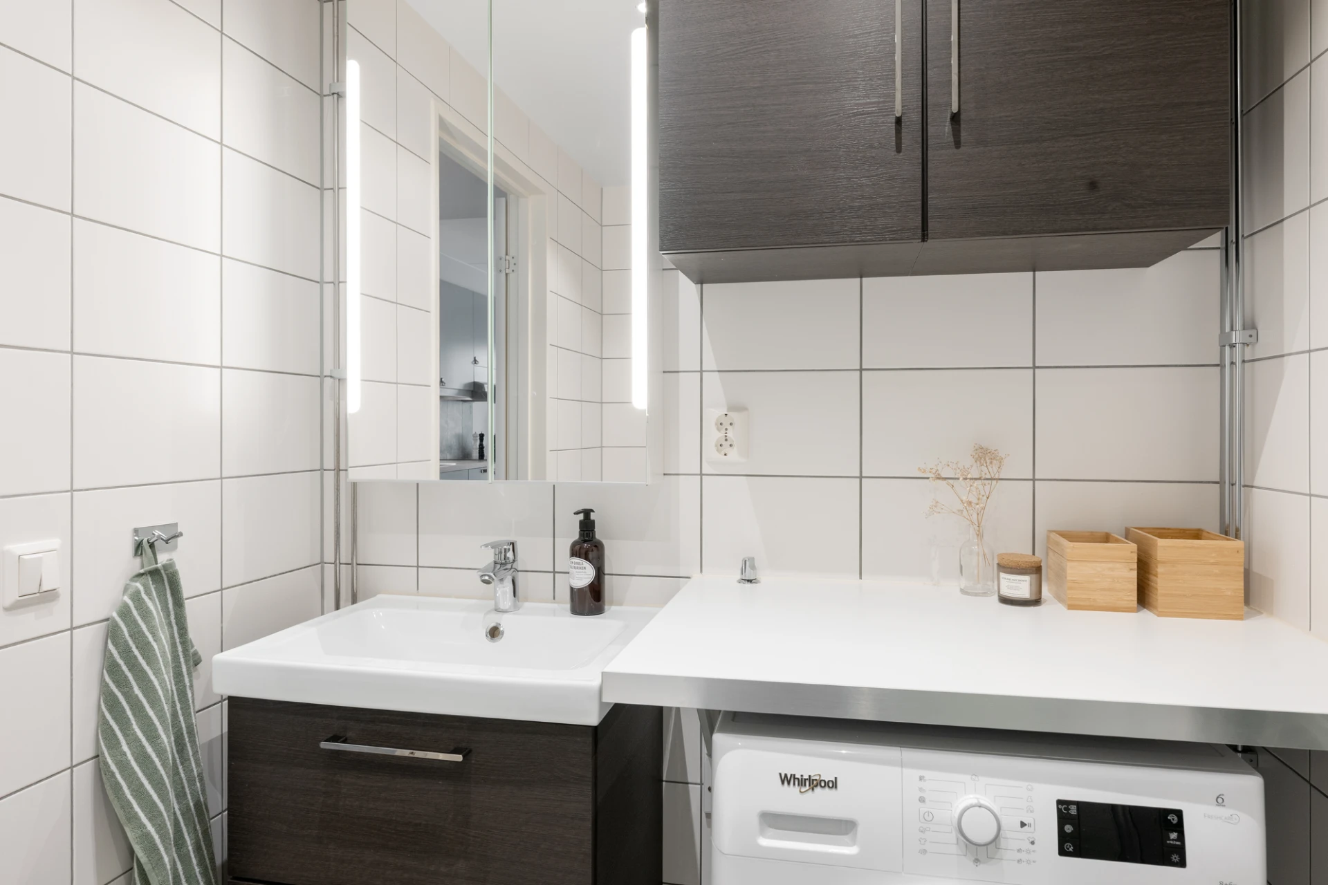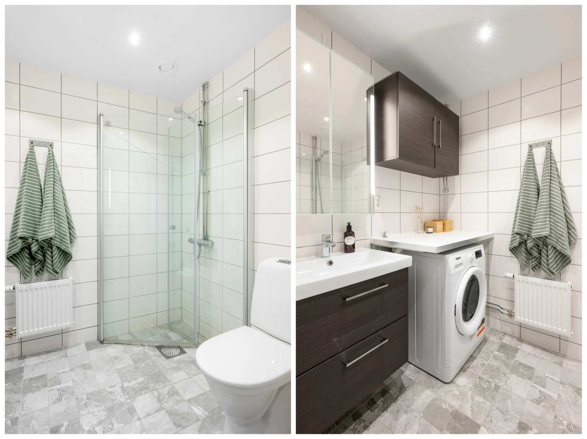 Badrummet är helkaklat och modernt utrustat med wc, dusch och en kombimaskin som både tvättar och torkar – en extra bekvämlighet i vardagen. I hallen finns gott om förvaring i form av garderob och städskåp, vilket underlättar ett ordningsamt boende. Det här är ett utmärkt boende för dig som söker ett första hem, en smart övernattningslägenhet eller en investering. Lägenheten har genomtänkta lösningar och ett fint ljusinsläpp från fönsterpartiet mot balkongen.