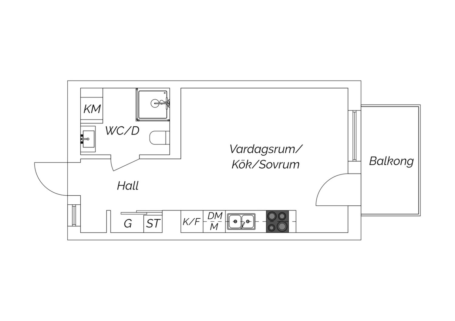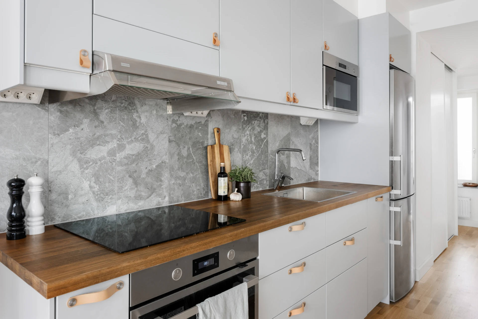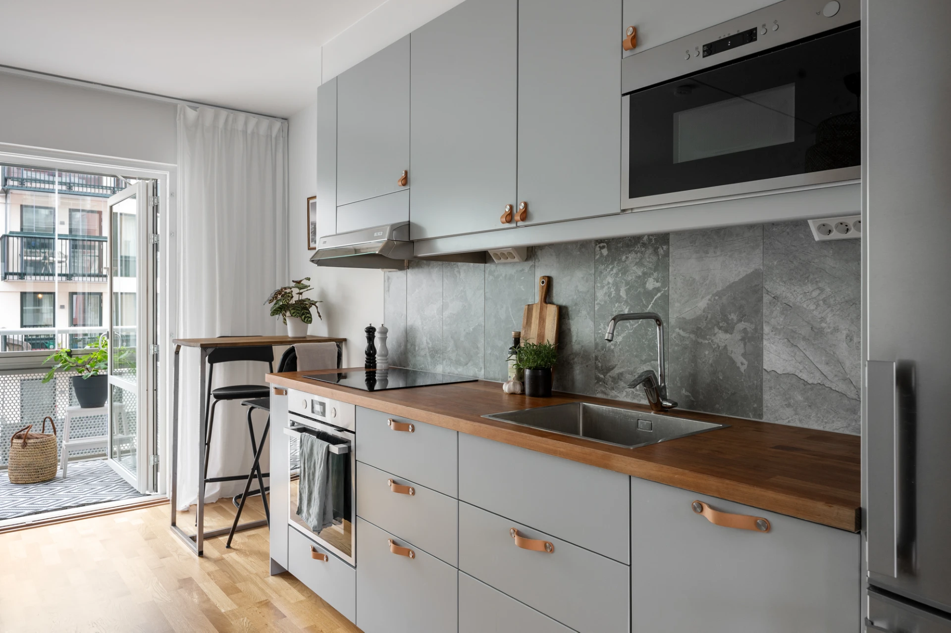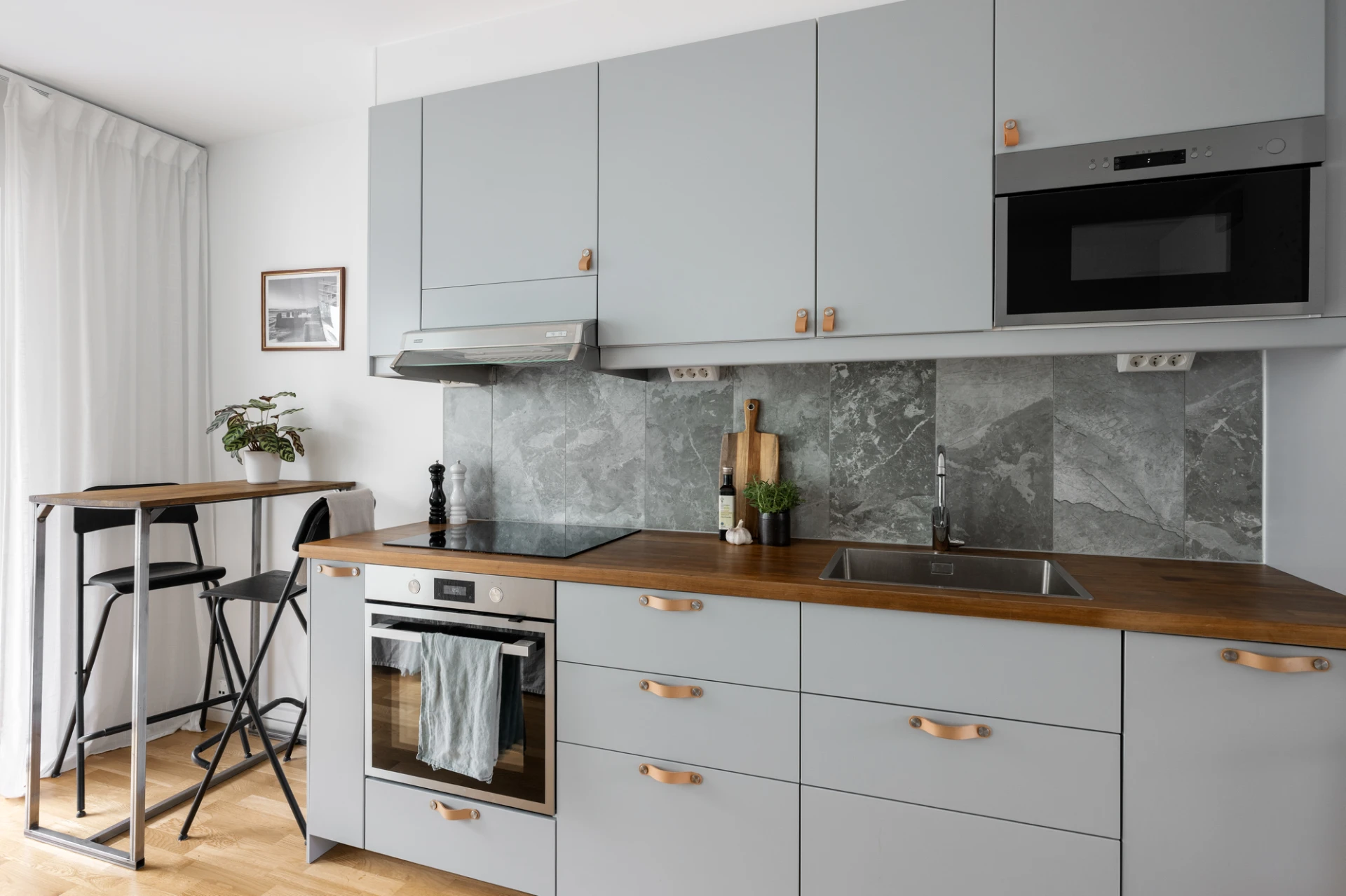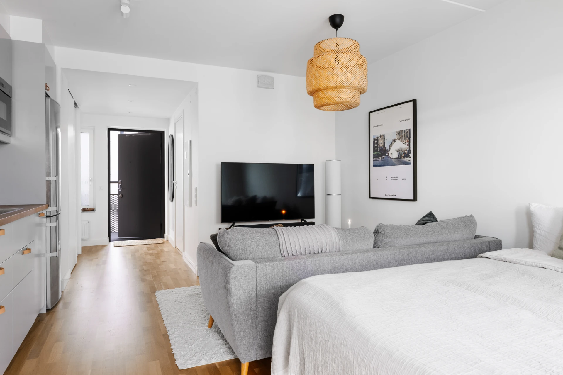 Bostaden är smart planerad med en öppen planlösning där kök, vardagsrum och sovdel smälter samman på ett harmoniskt sätt. Här får du ett modernt och funktionellt kök utrustat med kyl/frys, spis, ugn, diskmaskin, micro samt diskho – allt du behöver för att både vardagsmat och middagsbjudningar ska bli smidiga.
