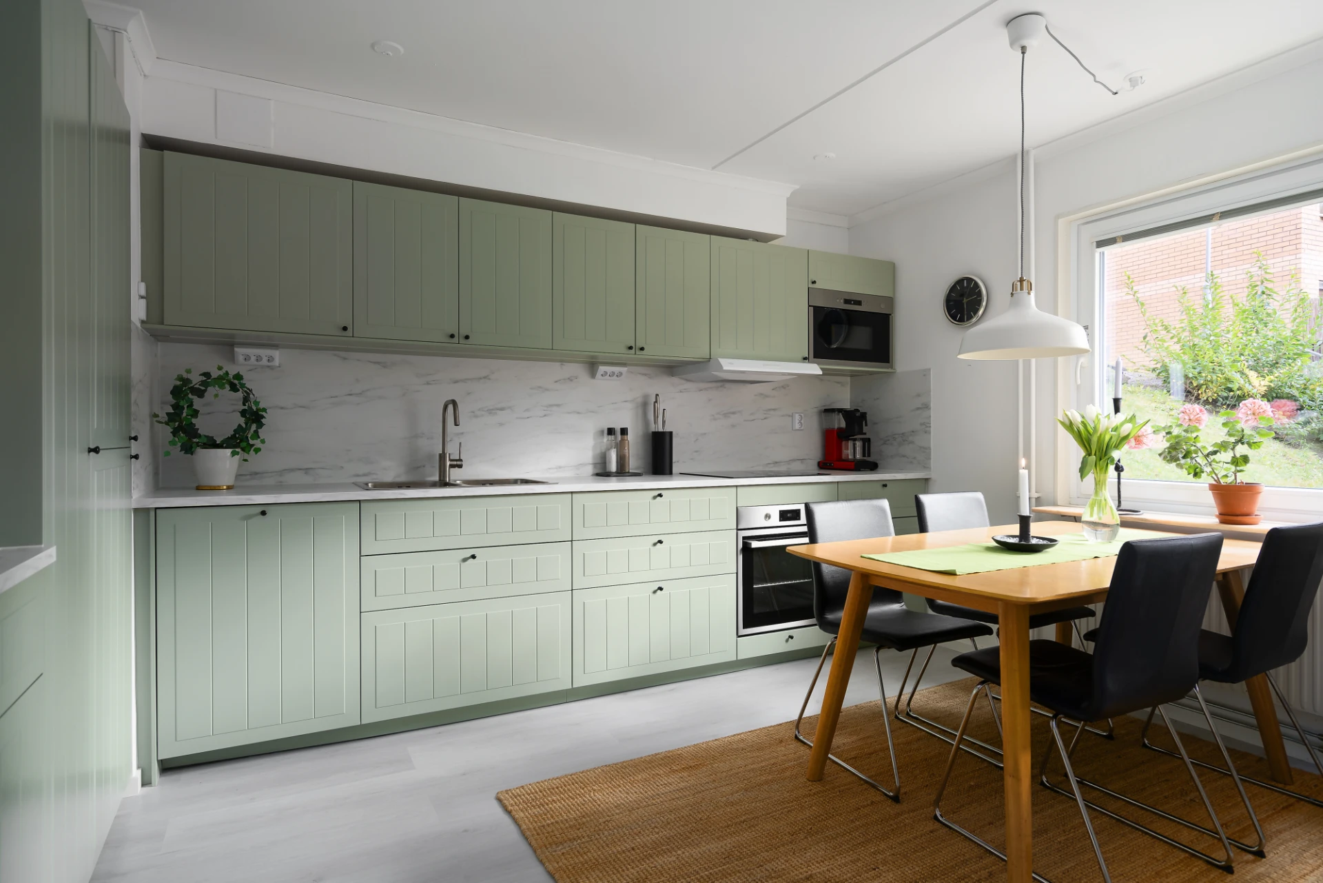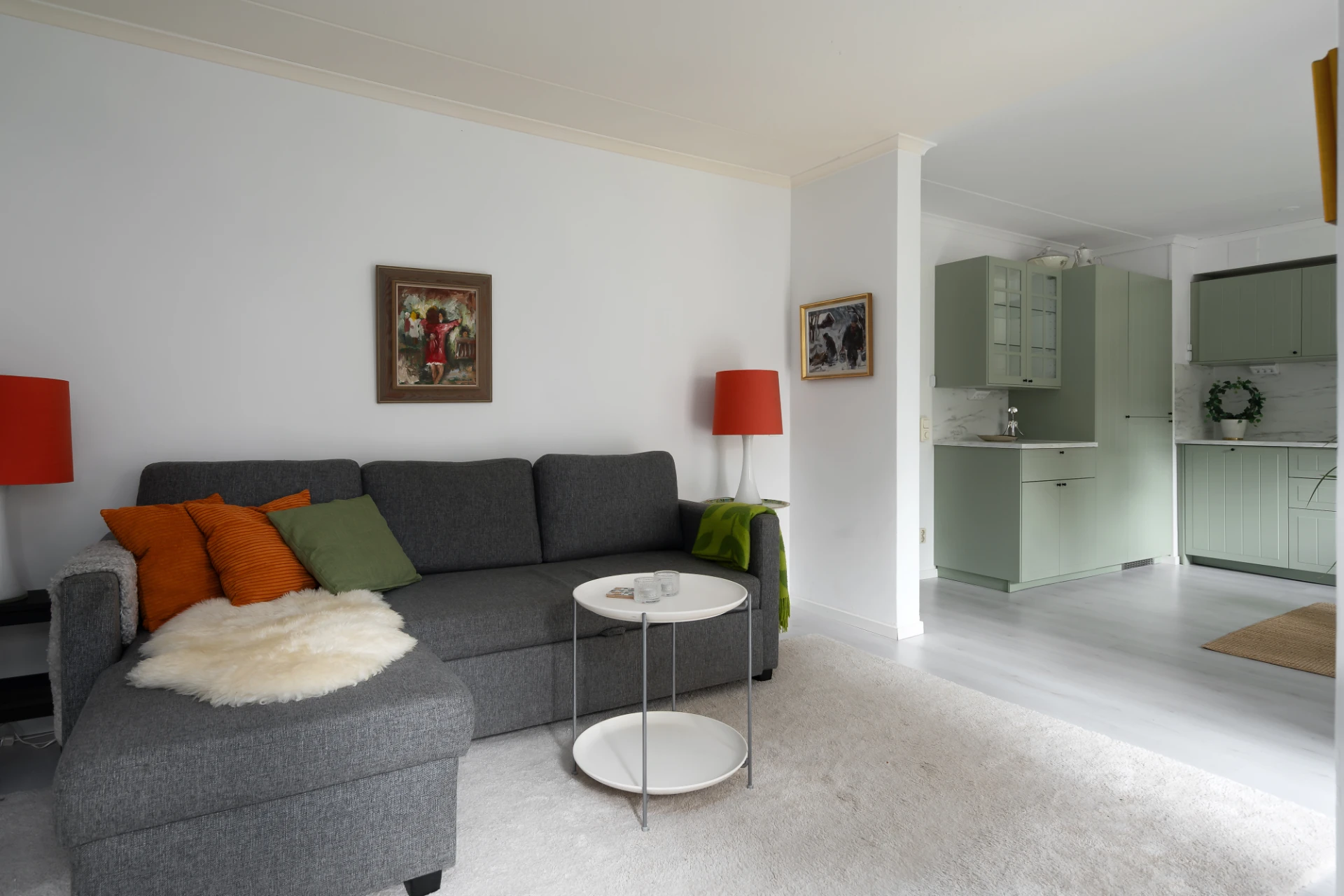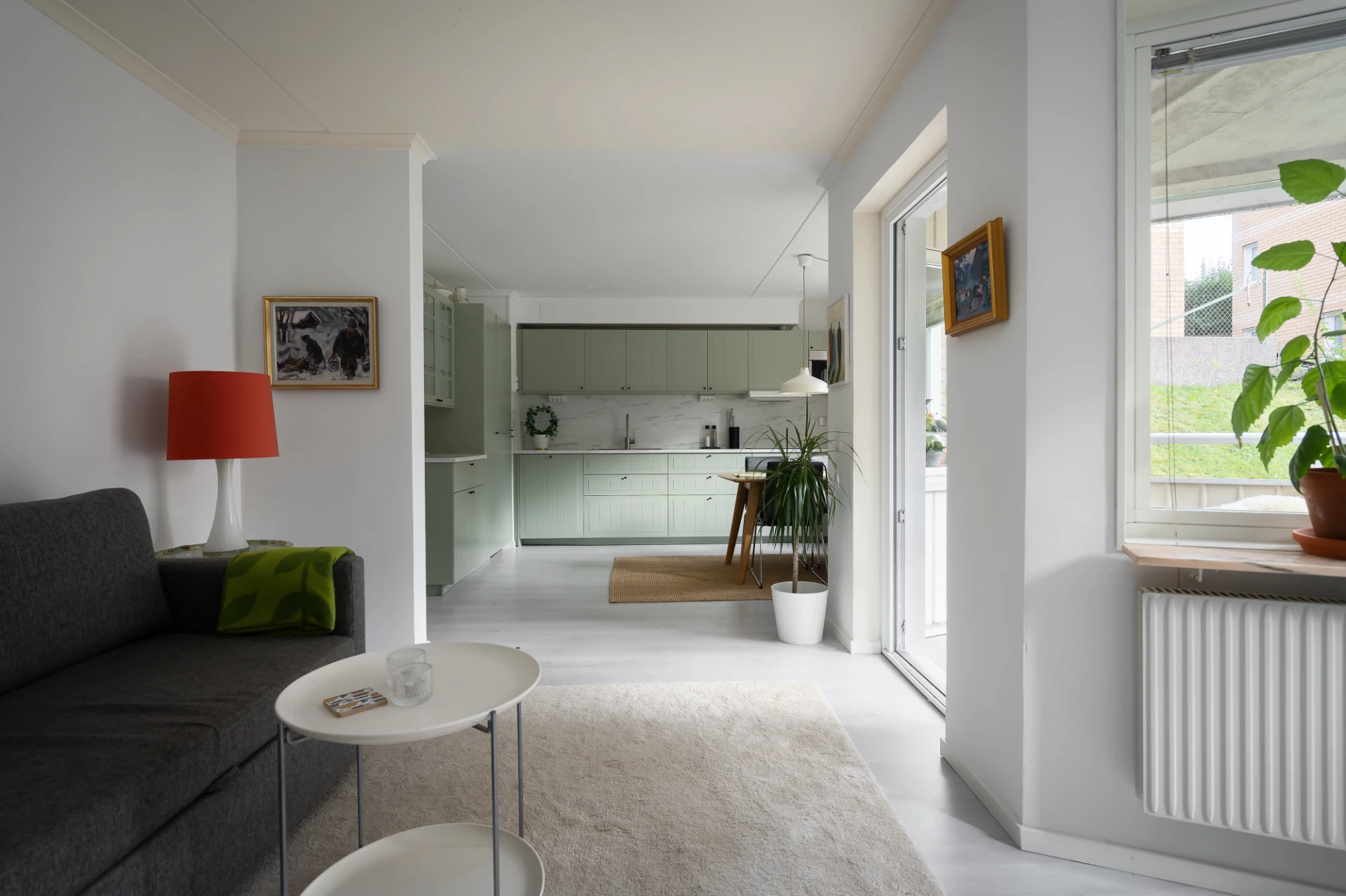Kök och vardagsrum i öppen planlösning med utgång till balkong. Köket som renoverades 2024 går i vacker grön ton och är utrustat med kombinerad kyl och frys, glas häll med spisfläkt och diskmaskin, inbyggd mikrovågsugn samt ugn. Här finns matplats för ca 6-8 personer. Väggarna är vit målade och golvet är av ljus laminat