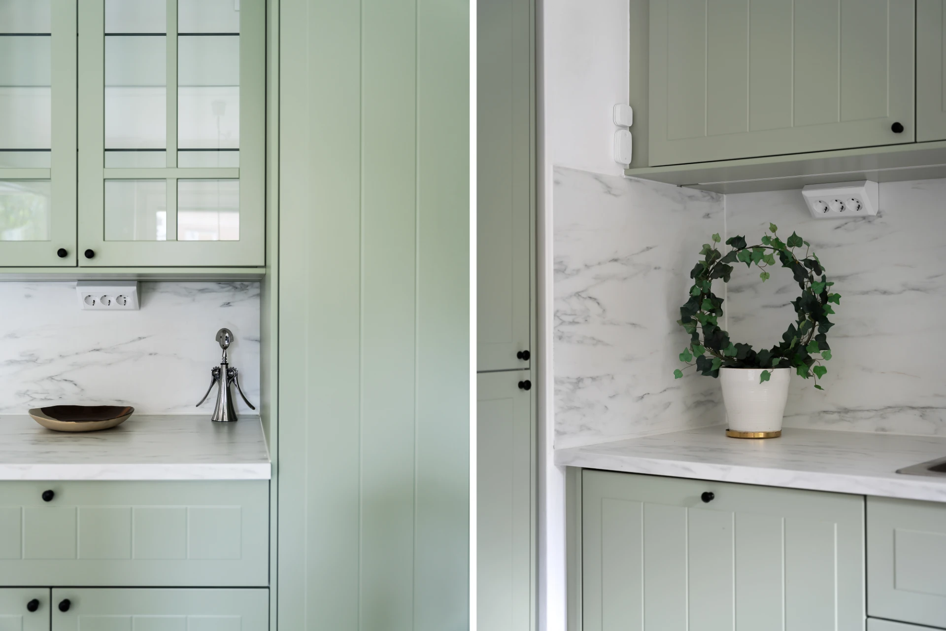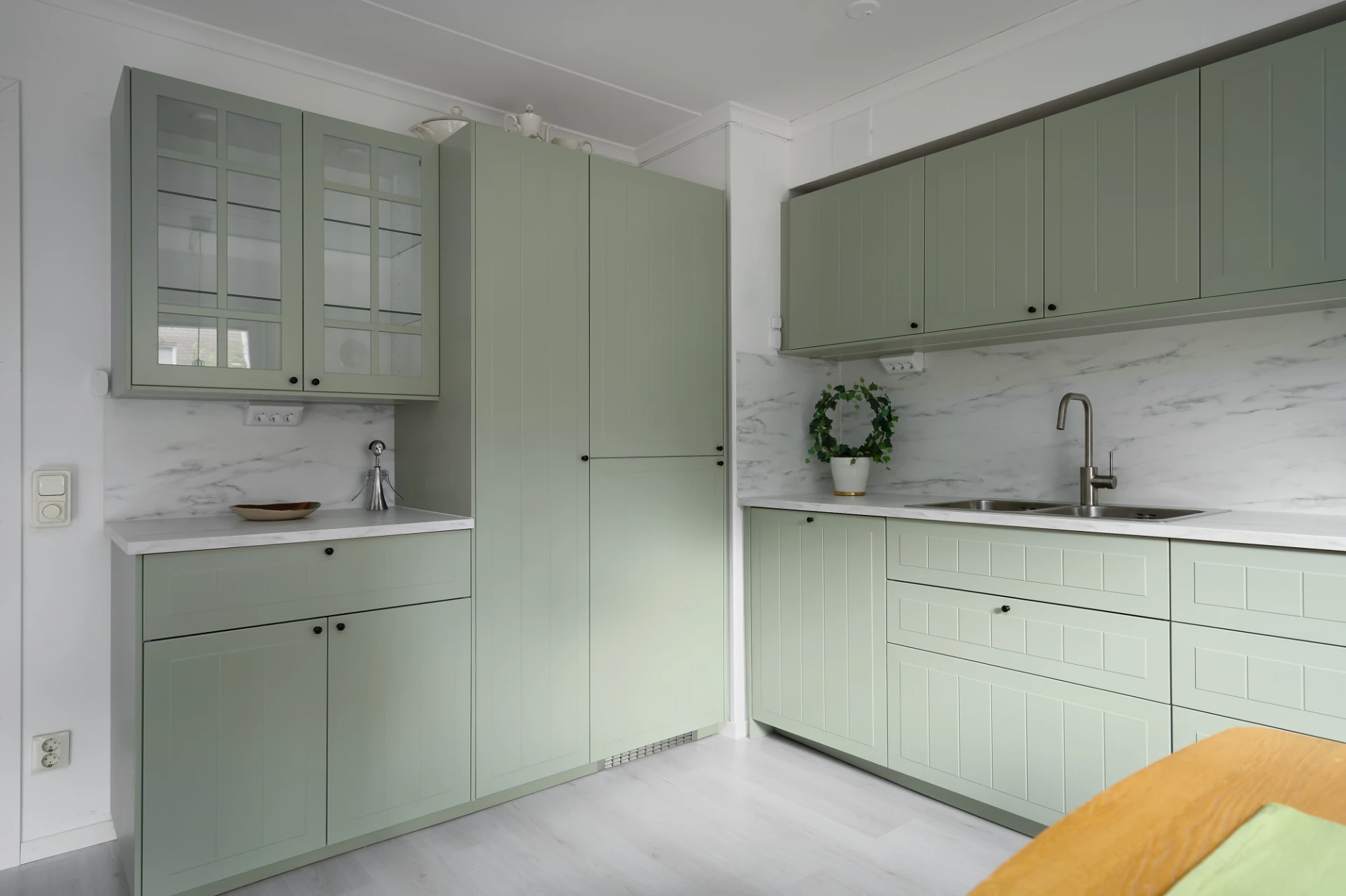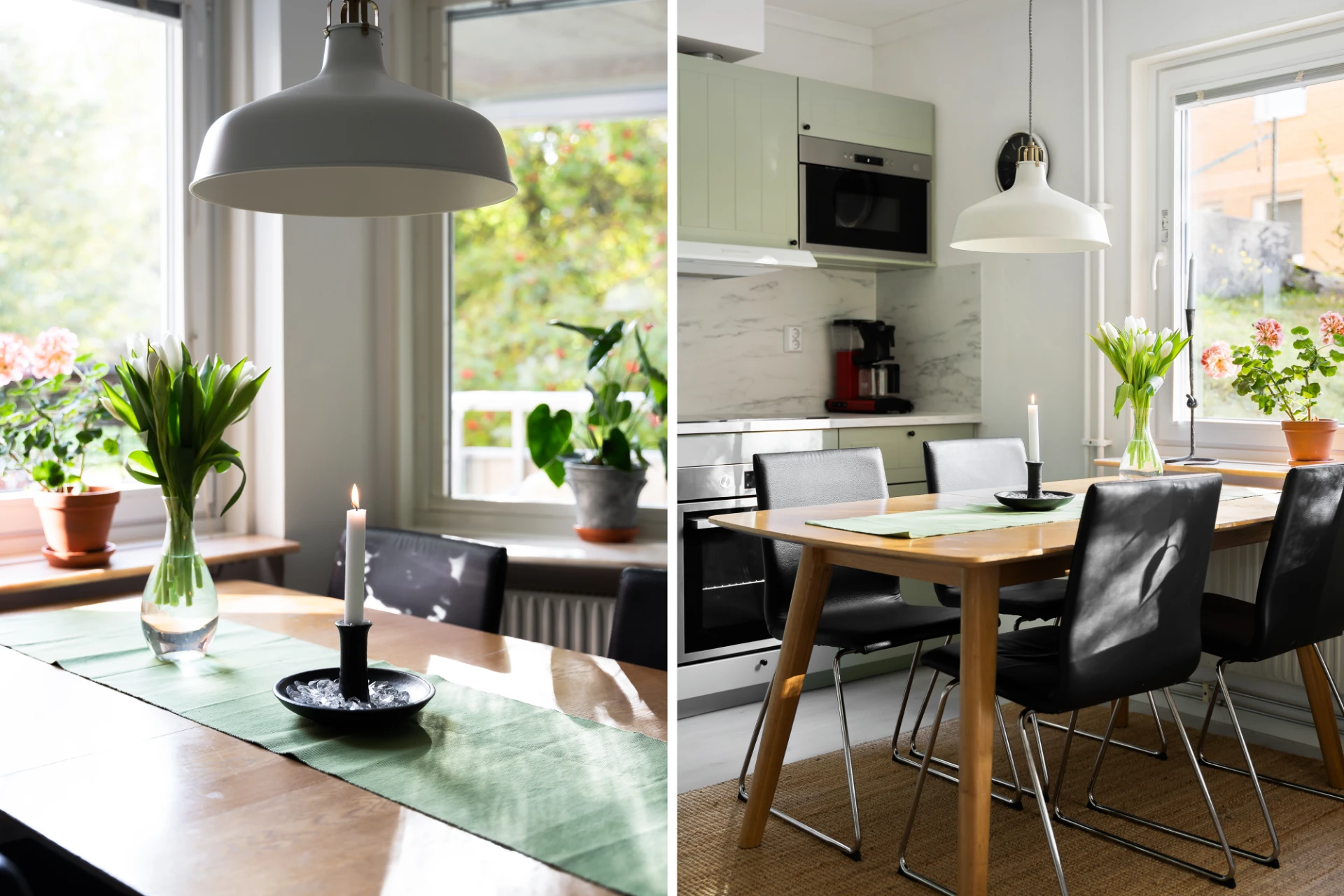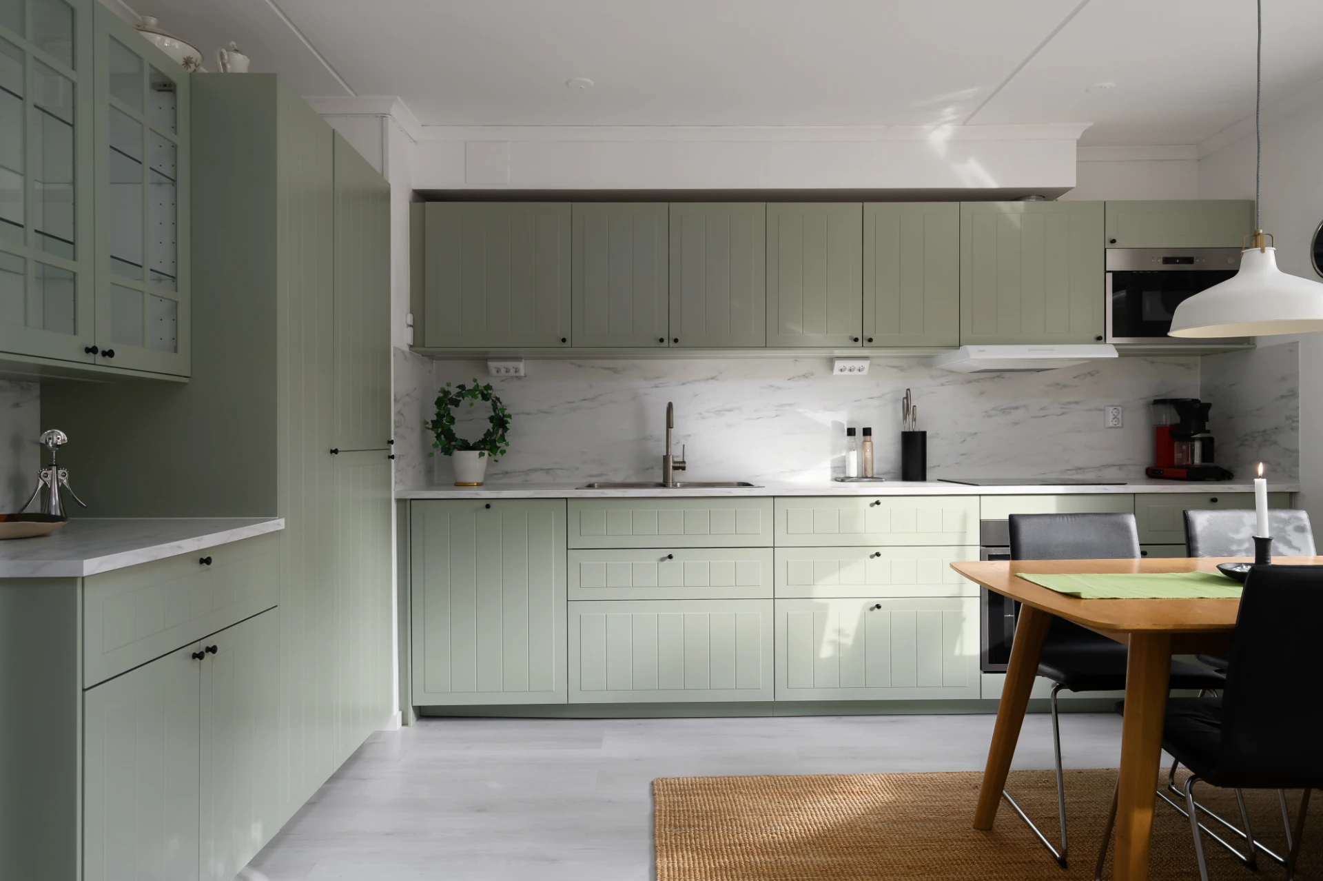 Kök och vardagsrum i öppen planlösning med utgång till balkong. Köket som renoverades 2024 går i vacker grön ton och är utrustat med kombinerad kyl och frys, glas häll med spisfläkt och diskmaskin, inbyggd mikrovågsugn samt ugn. Här finns matplats för ca 6-8 personer. Väggarna är vit målade och golvet är av ljus laminat