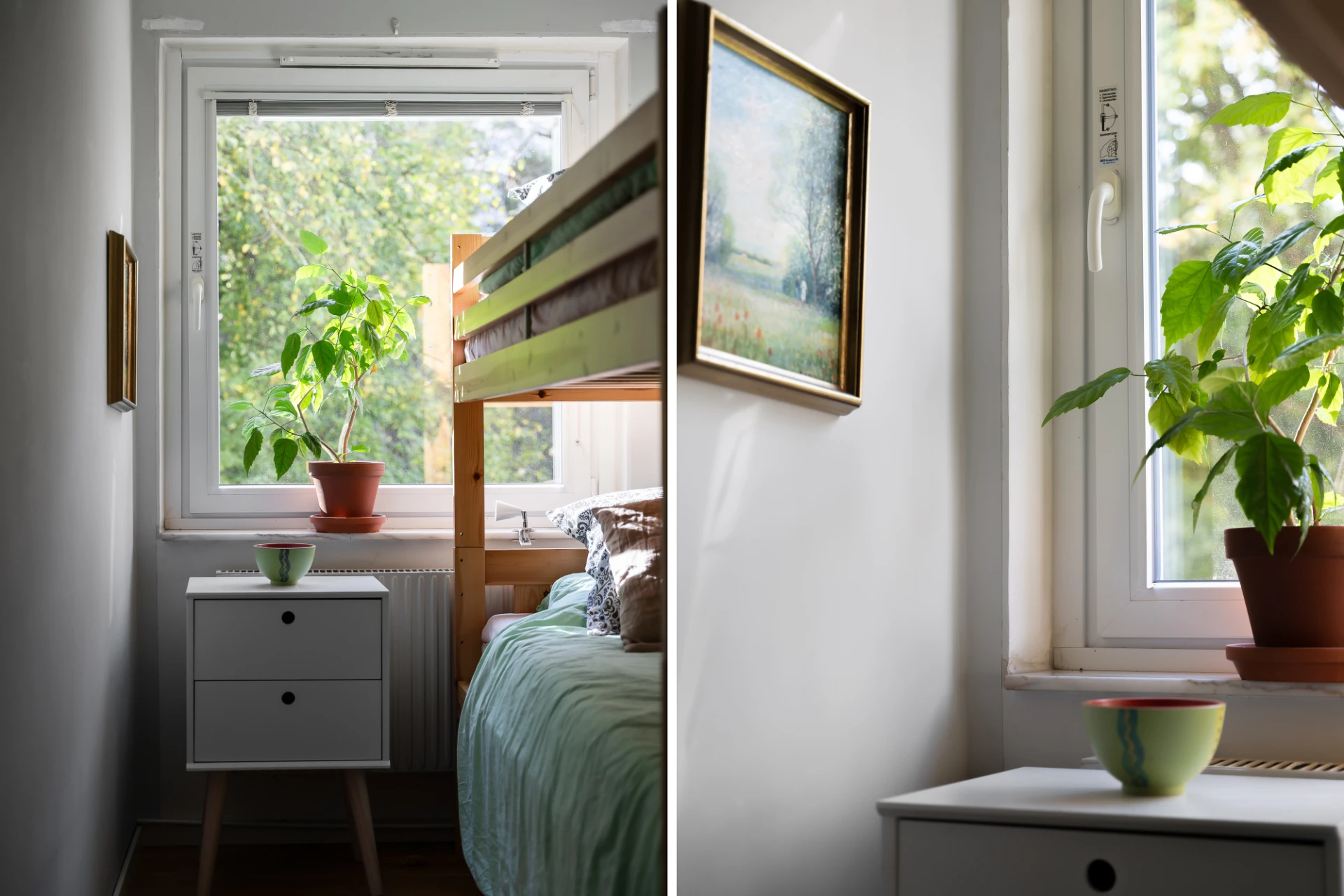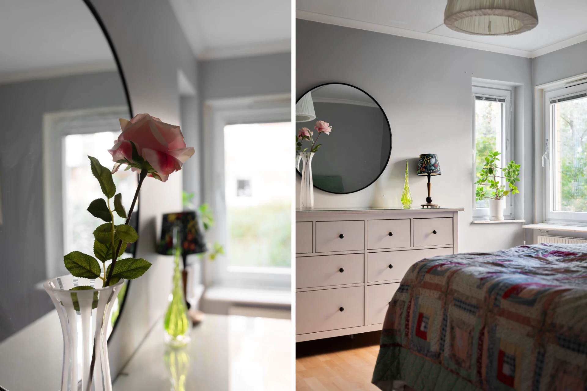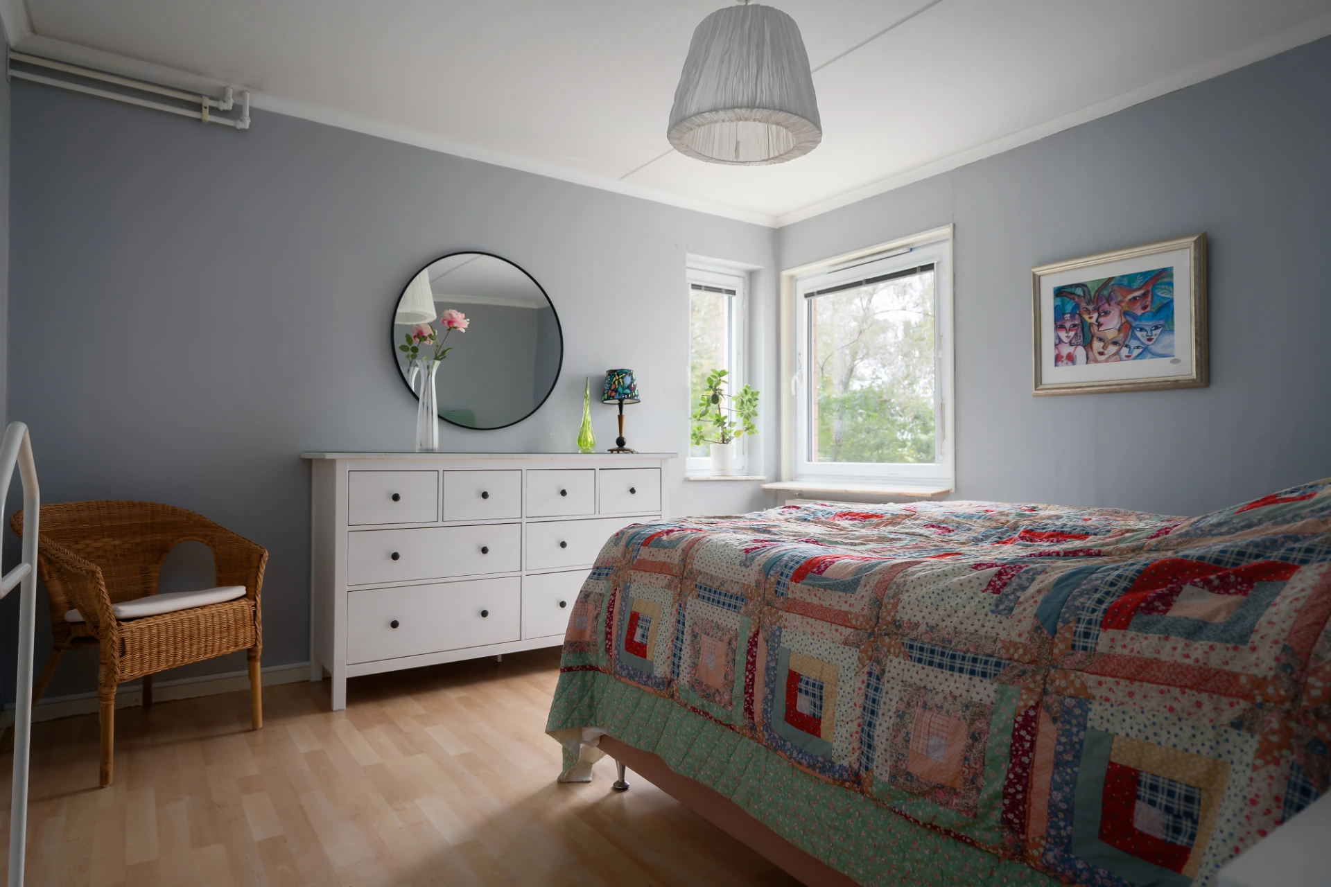 Ett väl tilltaget sovrum med två fönster i olika väderstreck som skapar ett härligt ljus. Här finns plats för stor säng och annat möblemang. Golven är av laminat och väggarna går i vitt