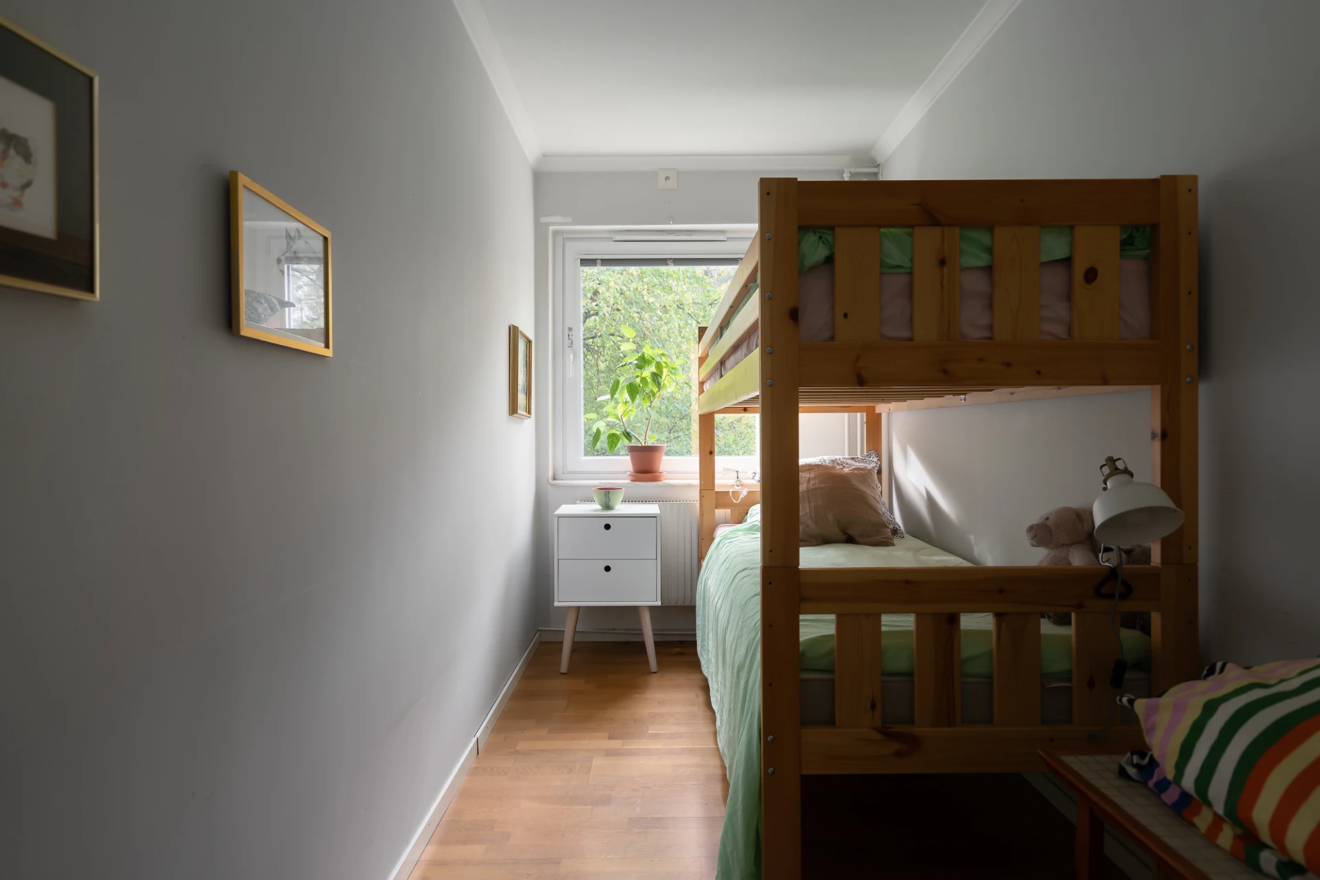 Ett praktiskt sovrum/ barnrum/ kontor med plats för säng och annat möblemang. Väggarna går i vit nyans och golvet är av laminat