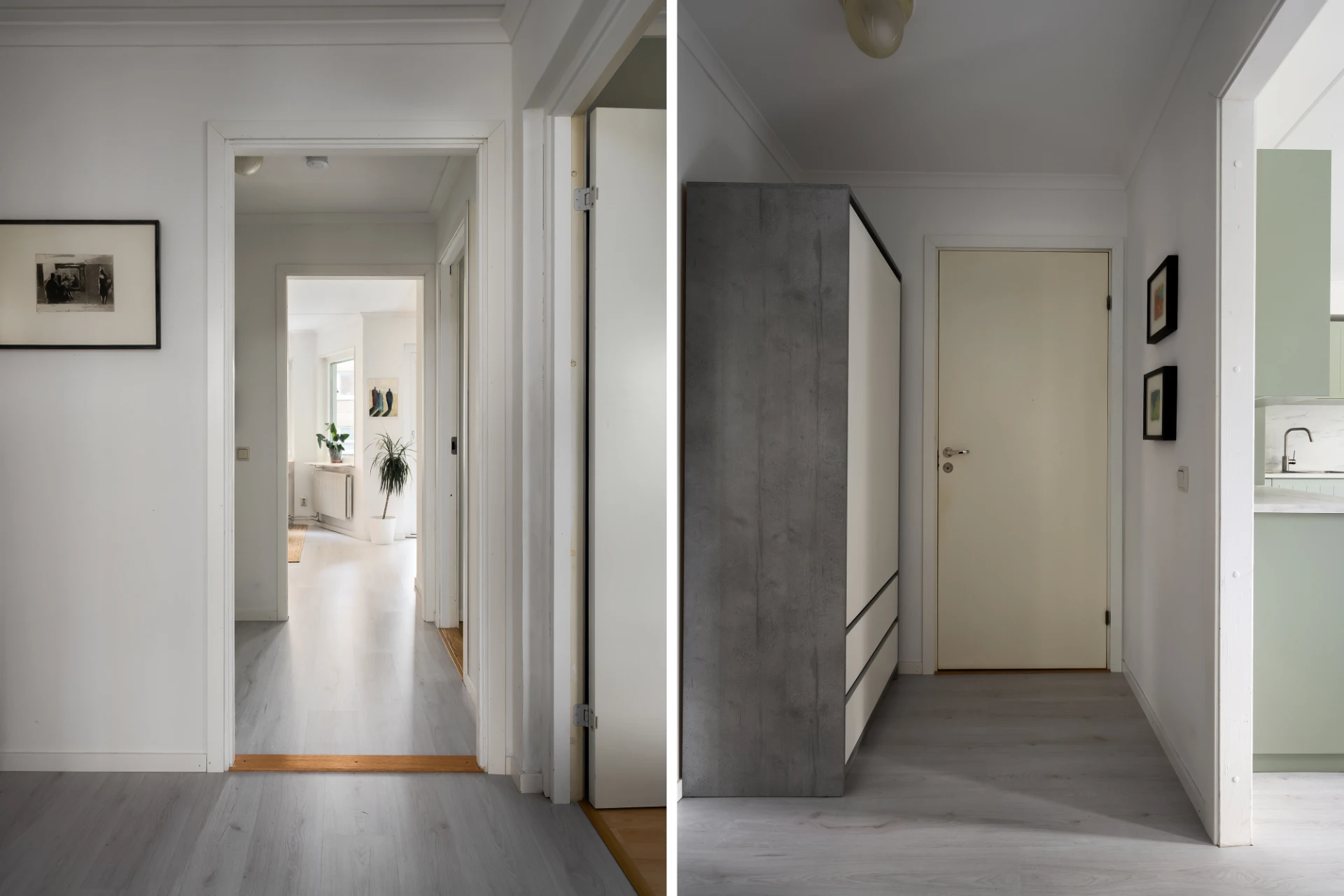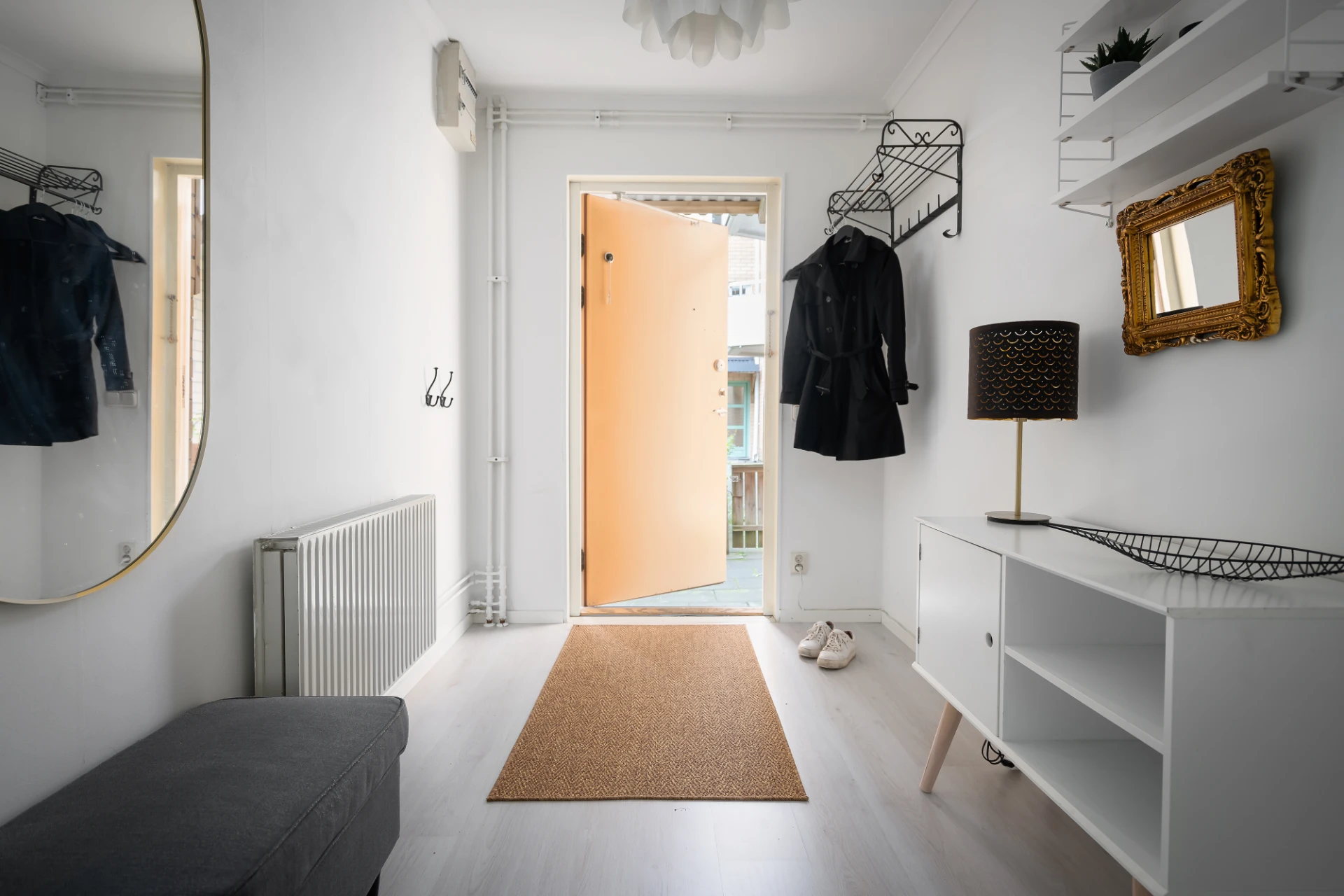 En generös och praktisk hall med plats för avhängning och förvaring samt hallmöbel. Här finns även en klädkammare för extra förvaringsmöjligheter. Väggarna är vitmålade och golvet kläs av ljus laminat
