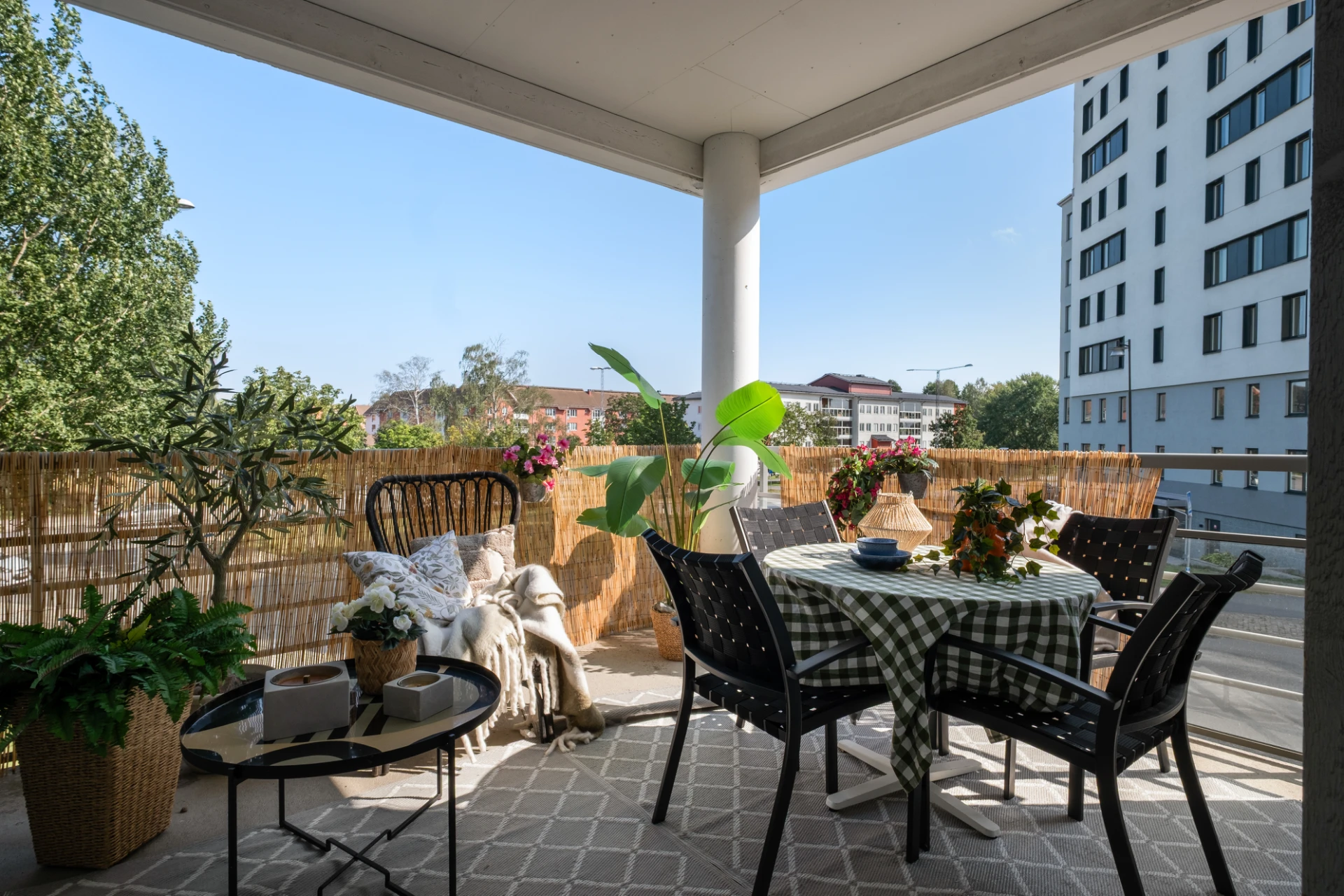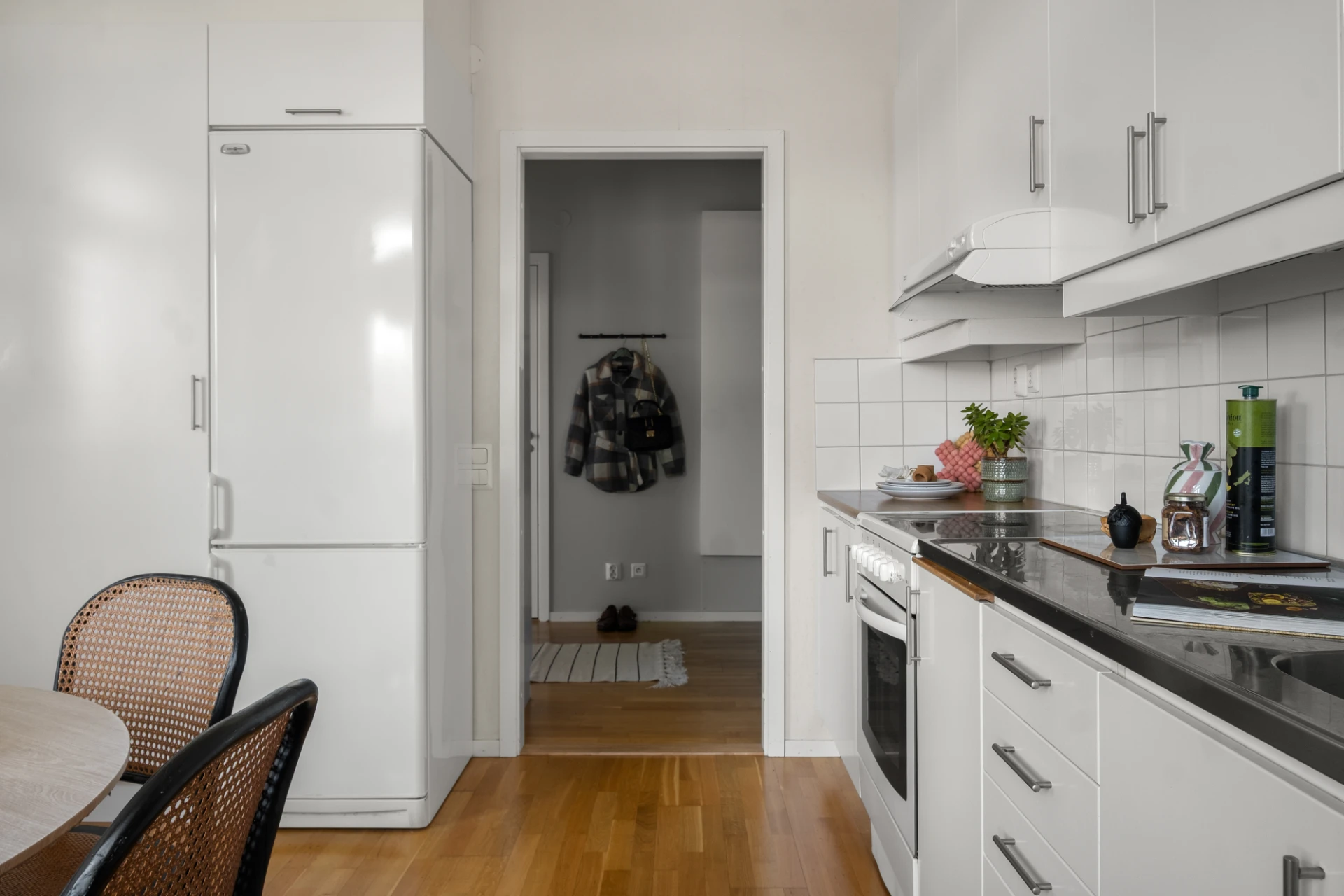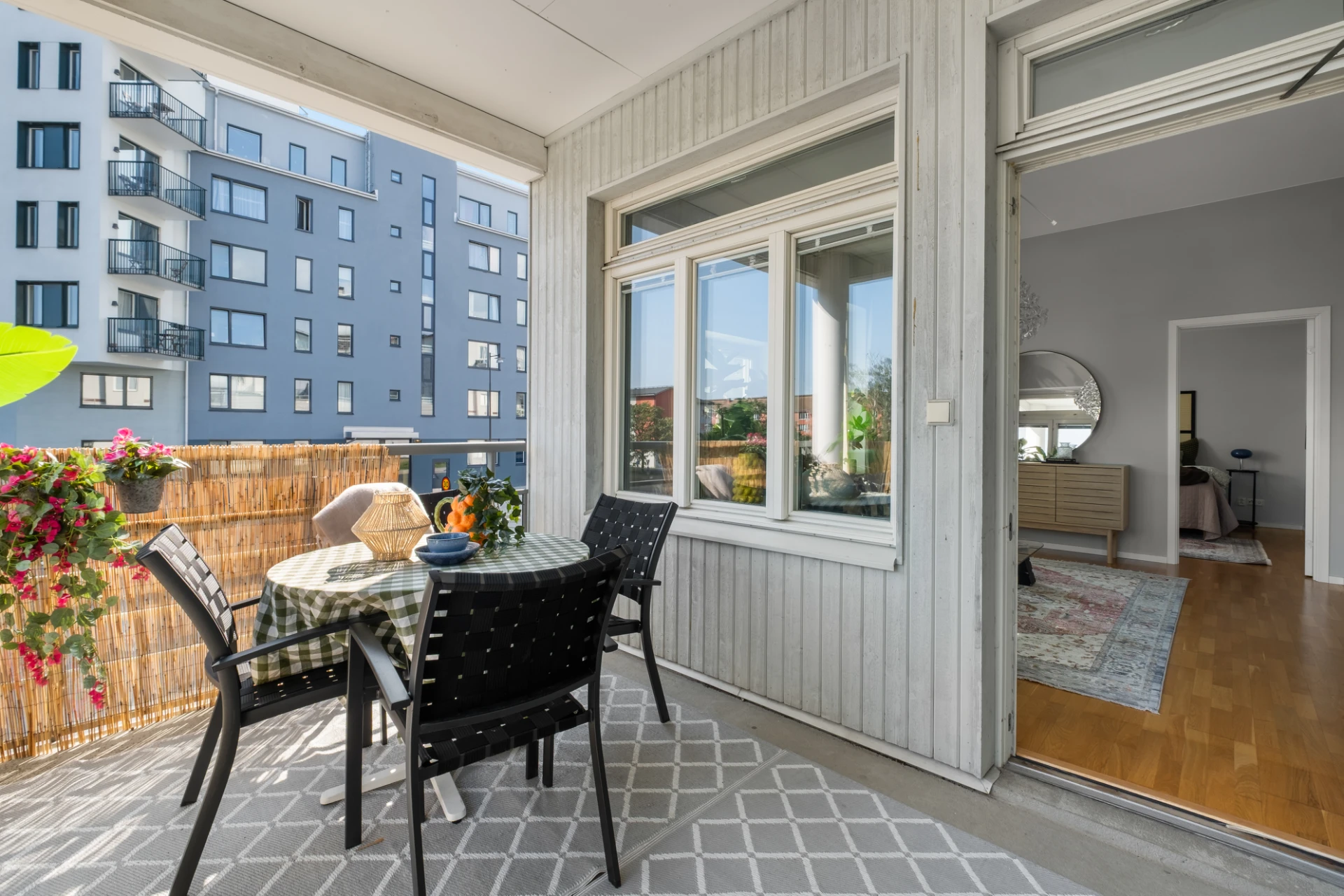 Den soliga mini-terrassen blir snabbt din favoritplats, gott om plats för önskat möblemang och här skiner solen större delar av dagen. Vardagsrummet är lättmöblerat med naturlig plats för TV. Det rymliga sovrummet erbjuder gott om plats för både säng, kontorsplats och förvaring. Badrummet är helkaklat och utrustad med bland annat tvättmaskin och torktumlare. Stilrent kök i vitt med gott om arbetsyta och förvaring, här finns även plats för matbord.