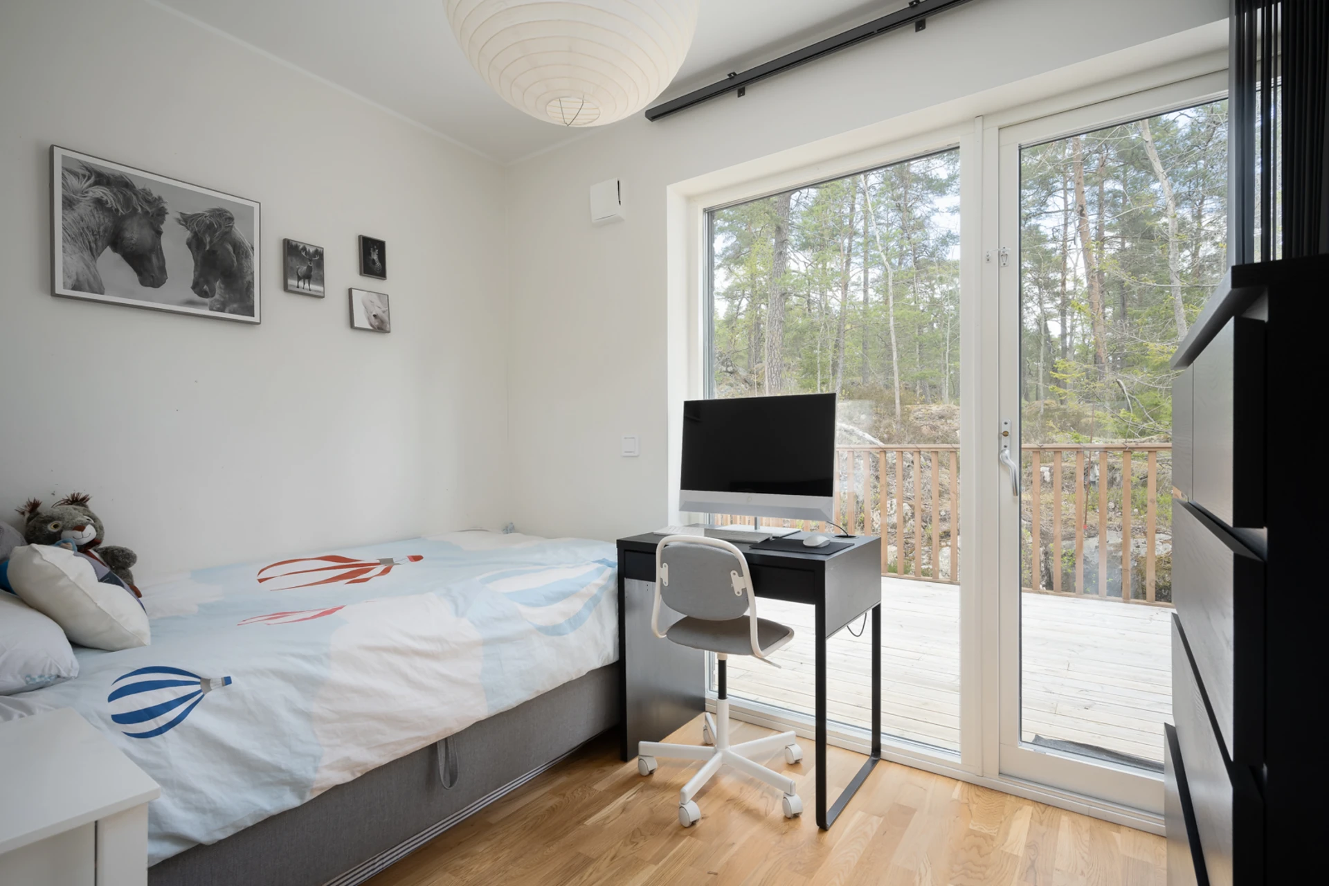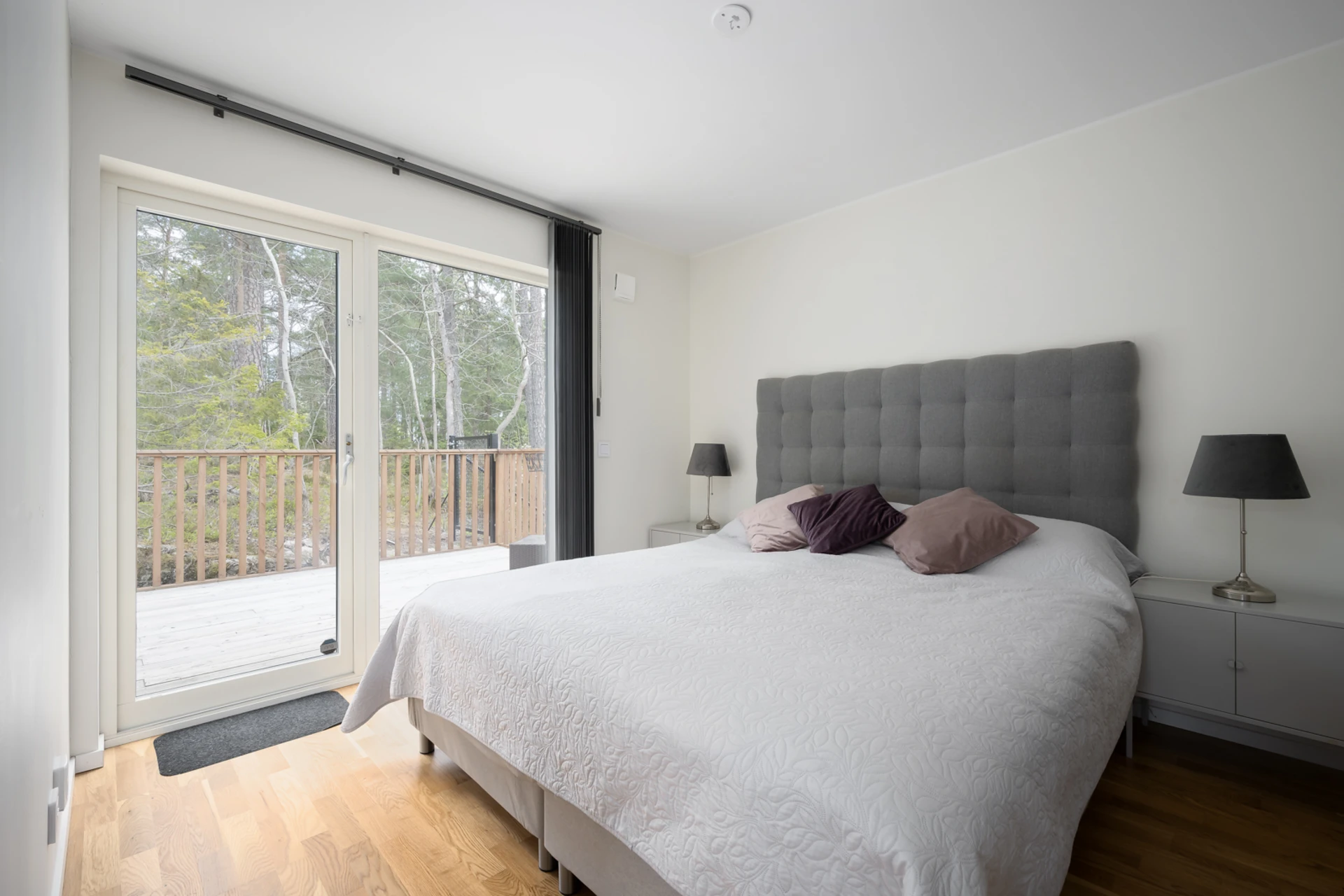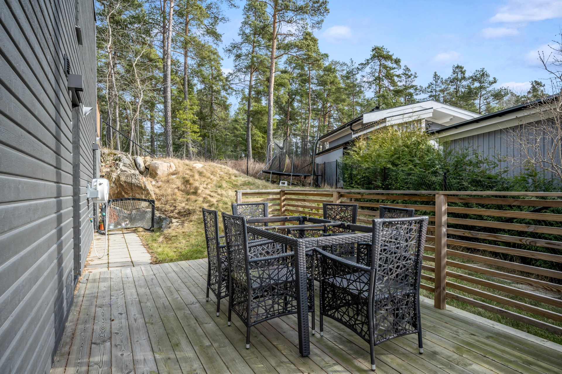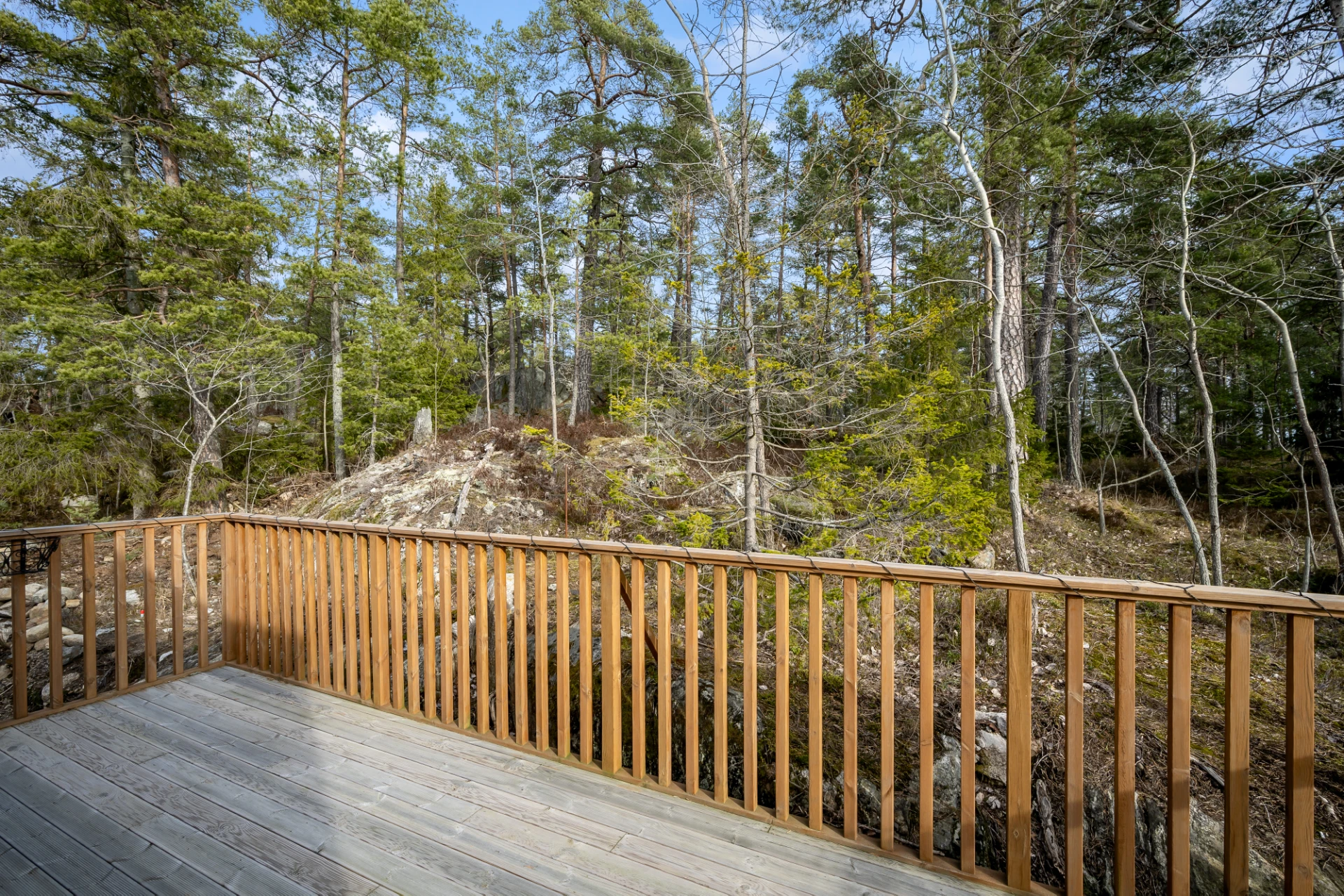På övervåningen finns de 4 sovrummen. Det största har egen klädkammare och två av sovrummen med egen utgång mot baksidans stora och mysiga terassen mot den vackra skogen.