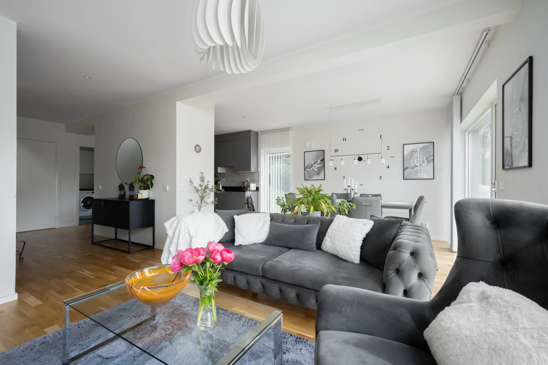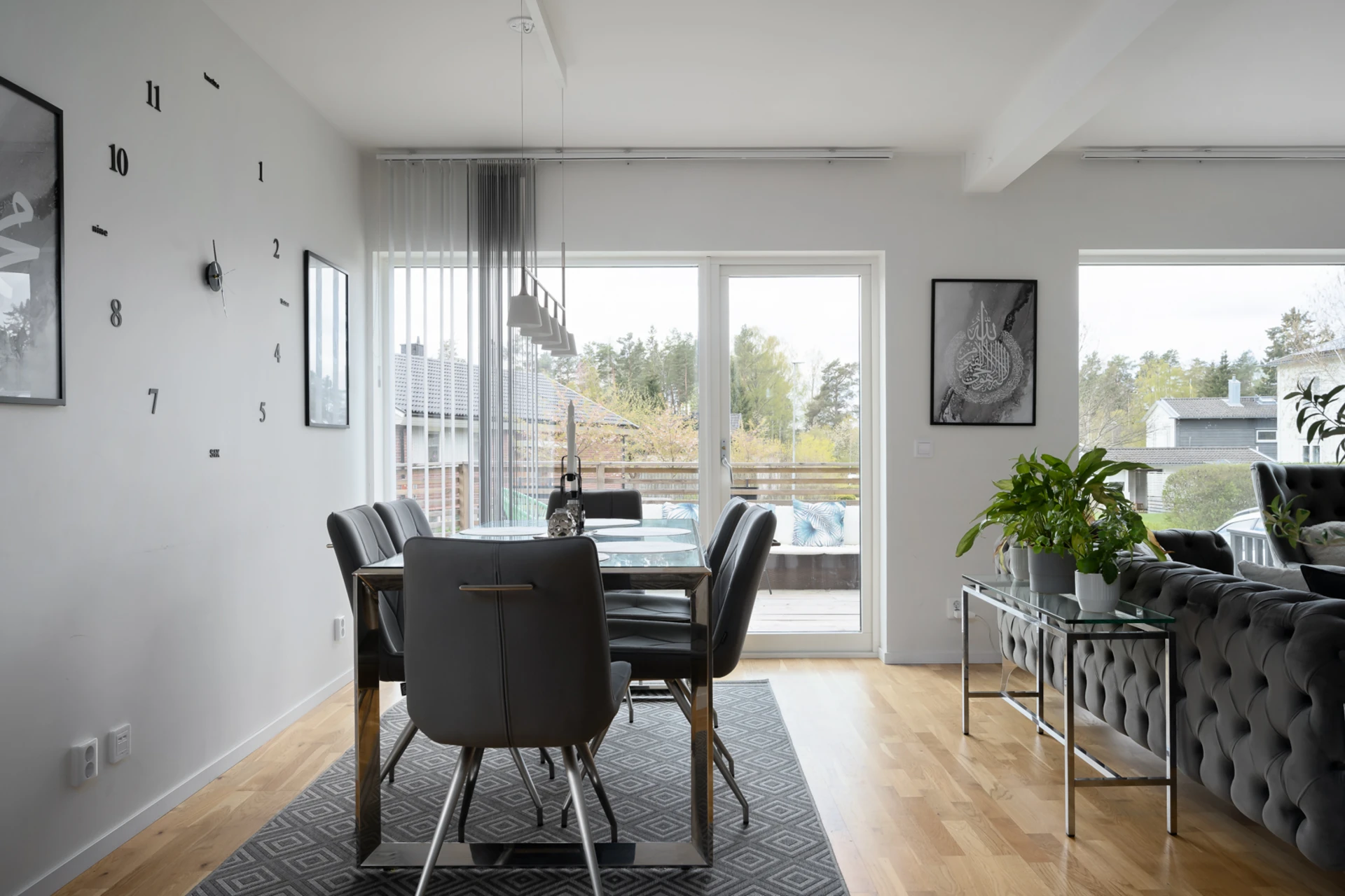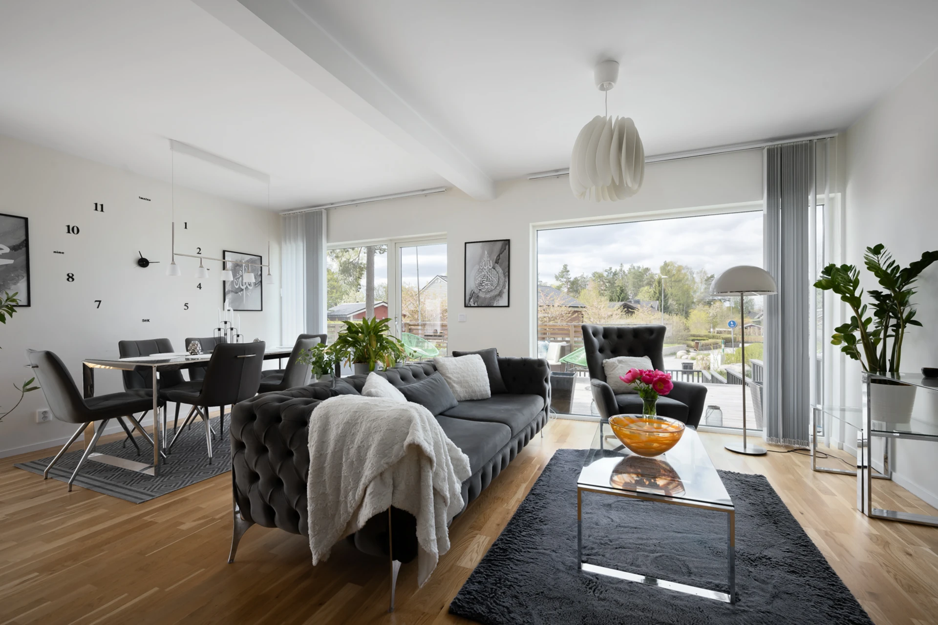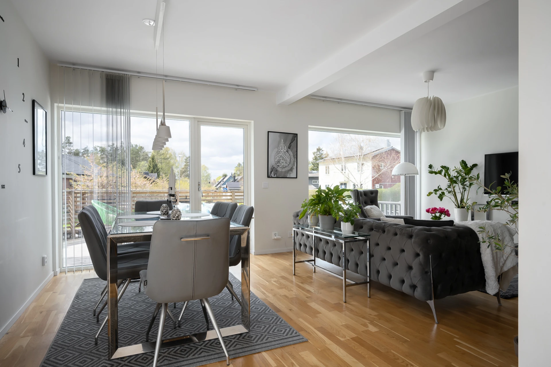 Rymligt och ljust vardagsrum med plats för både större soffgrupp samt stort matsalsbord. Stora härliga fönsterpartier ger en härlig känsla. 2 utgångar till den den soliga altanen.