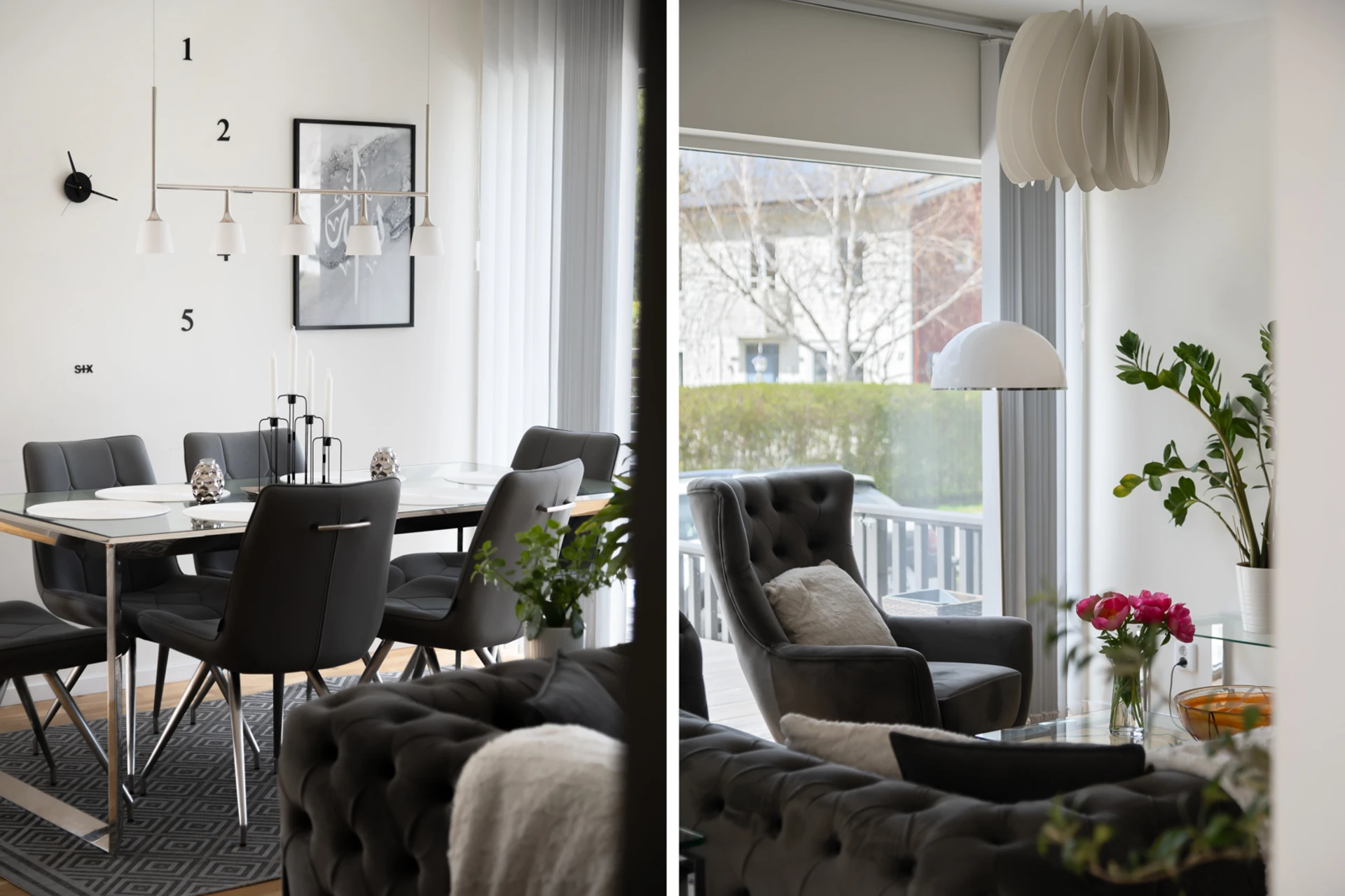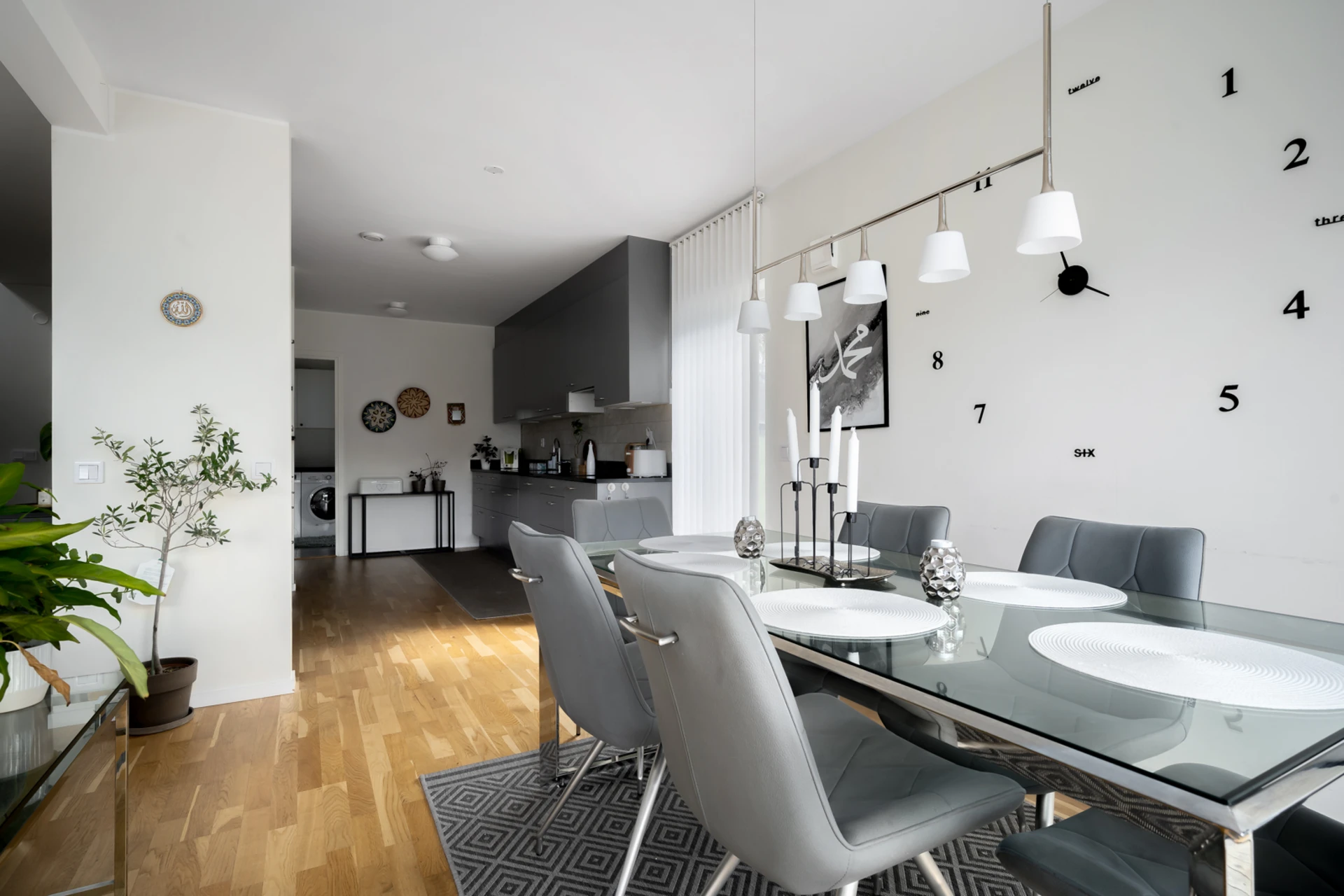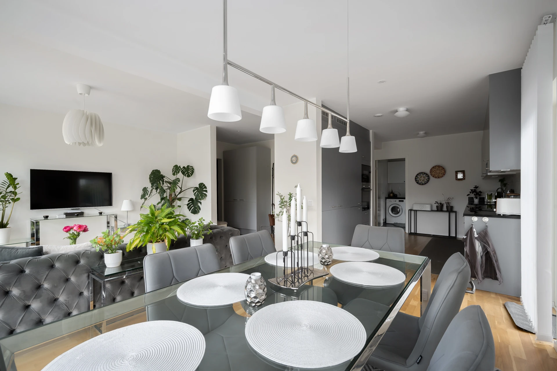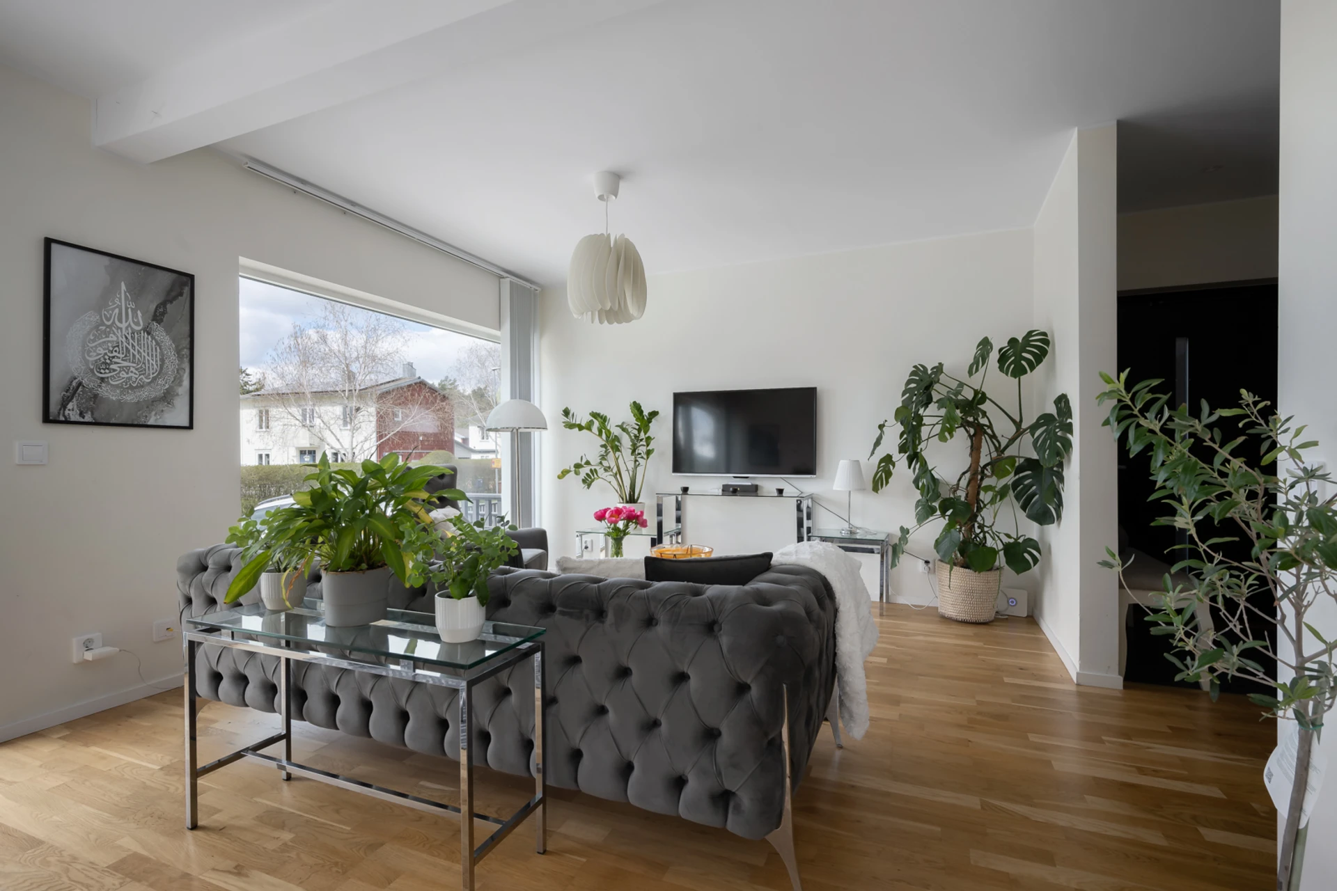Rymligt och ljust vardagsrum med plats för både större soffgrupp samt stort matsalsbord. Stora härliga fönsterpartier ger en härlig känsla. 2 utgångar till den den soliga altanen.