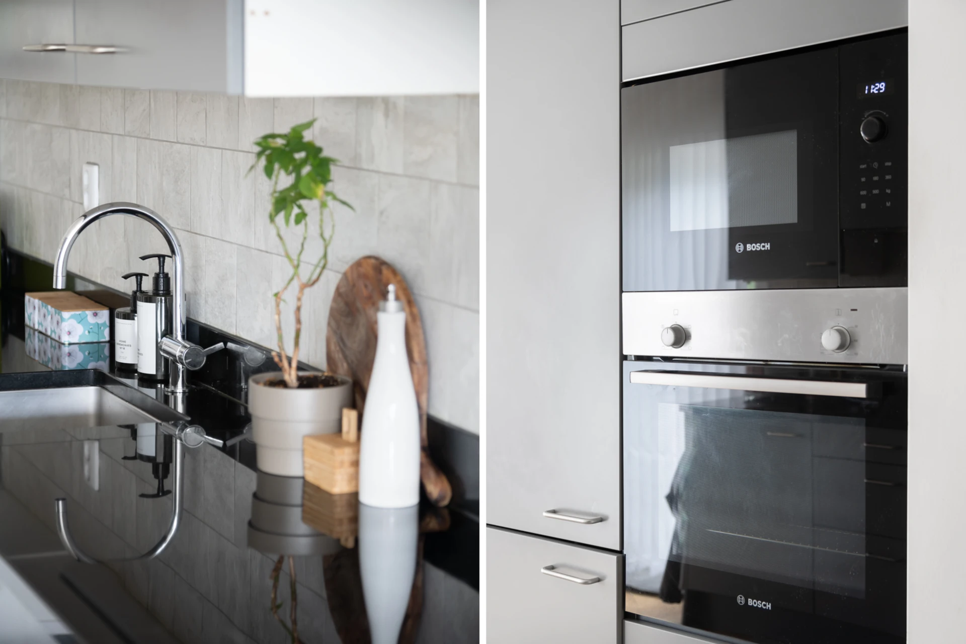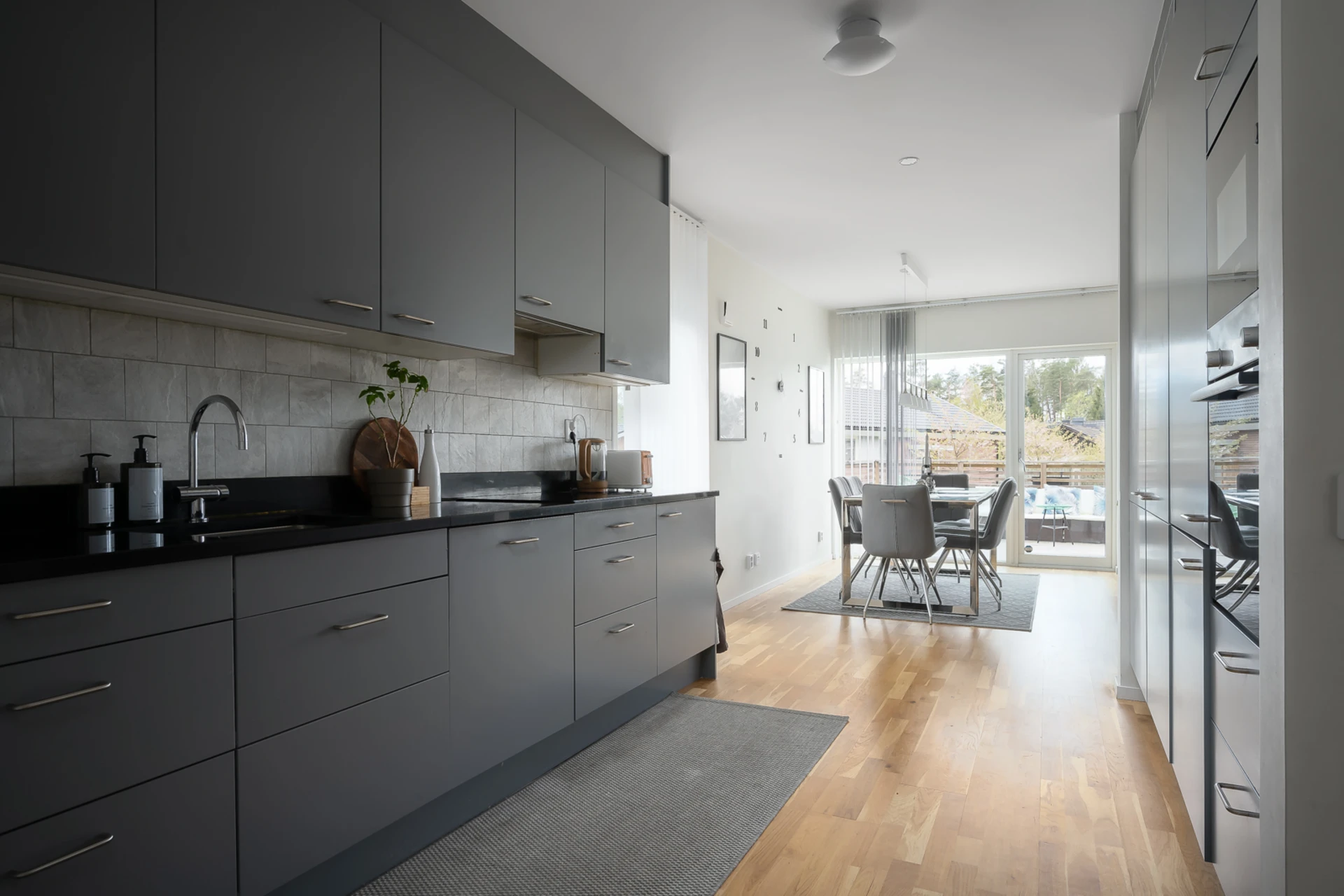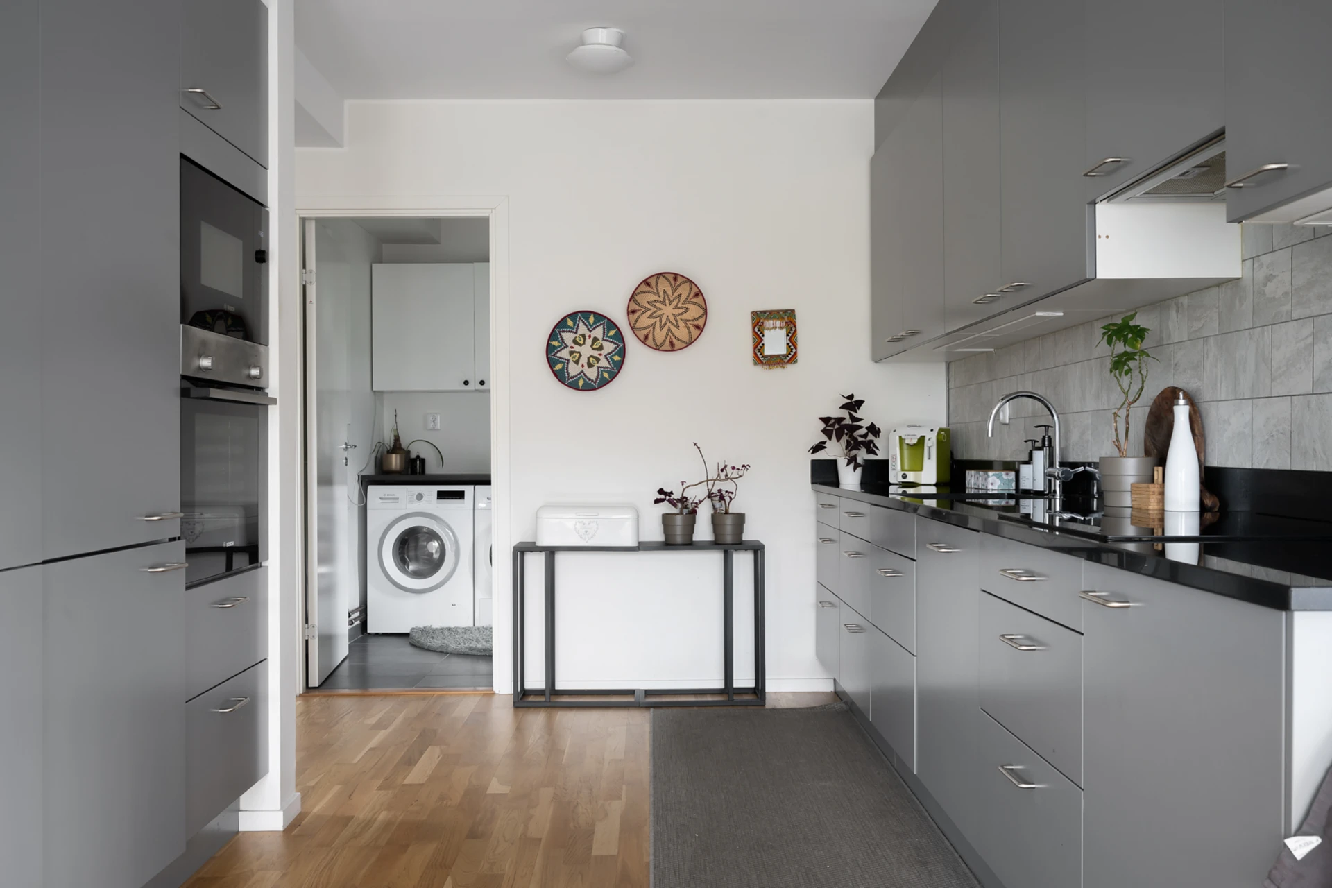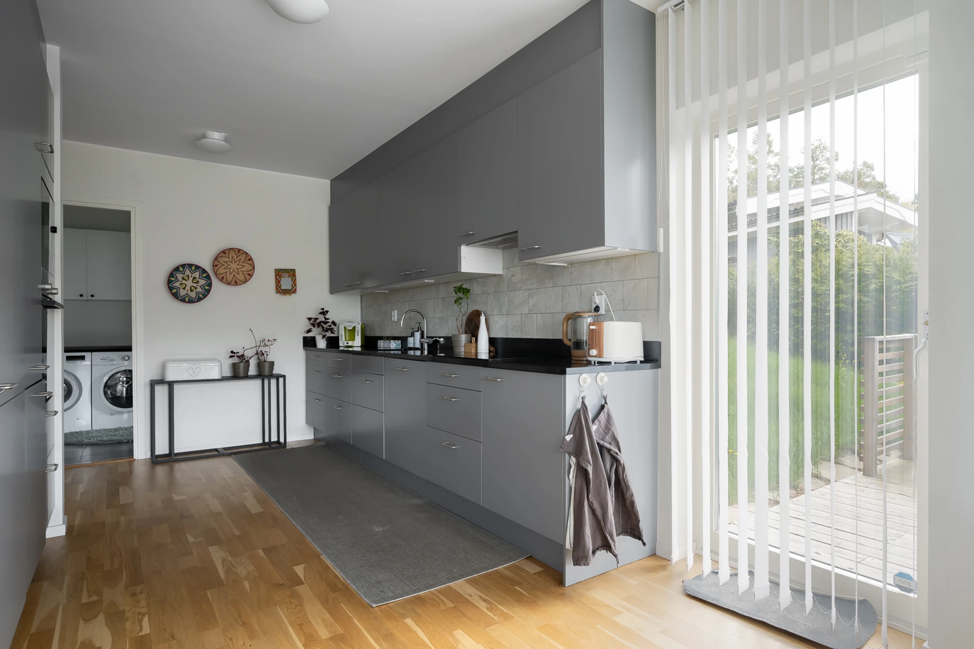 Köket är i anslutning till vardagsrummet i öppen planlösning. Köket är påkostat och av fabrikatet Marbodal. Fullt maskinellt utrustat med inbyggnadsugn, inbyggnadsmicro, induktionshäll, integrerad kyl och frys i fullhöjd, integrerad diskmaskin samt köksfläkt. Gott om skåpsförvaring.