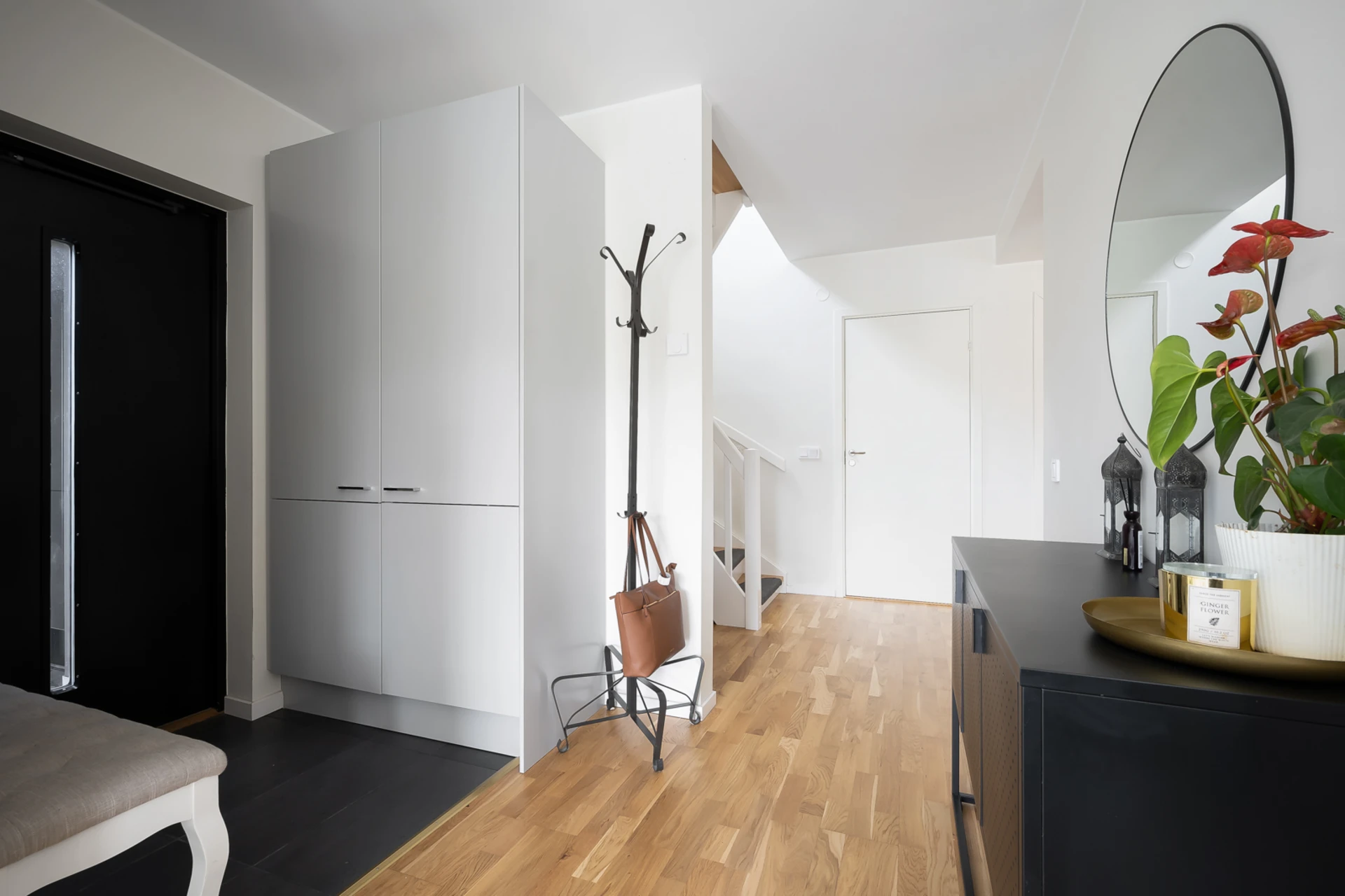 Väldisponerad hall med god plats för avhängning. Mörkgrått slitstarkt klinkergolv vid entréhallen.