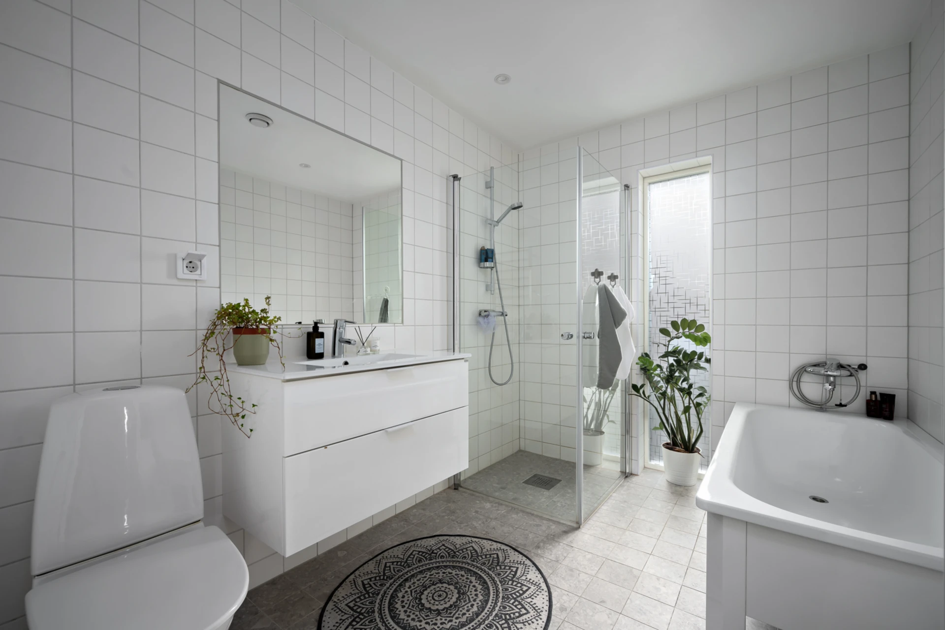 Till sist här uppe finns badrum 2. Även detta stort och har både dusch och badkar. Takspottar, handdukstork, wc, handfat med snygg kommod.