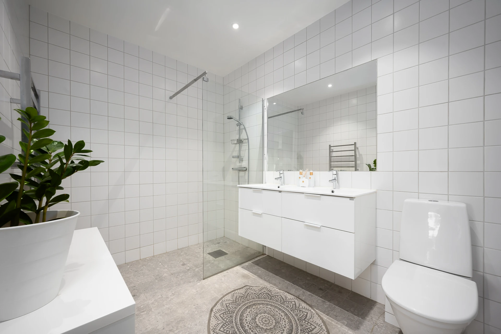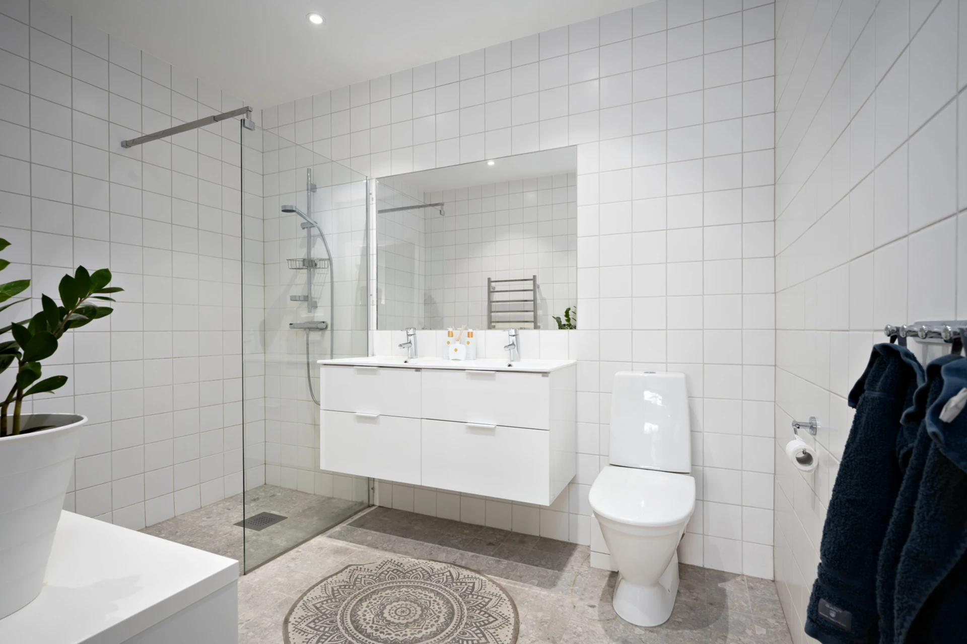 Stort helkaklat badrum med dusch med med duschväggar av glas, wc, handdukstork, dubbel-handfat med fin kommod under, takspottar och golvvärme.