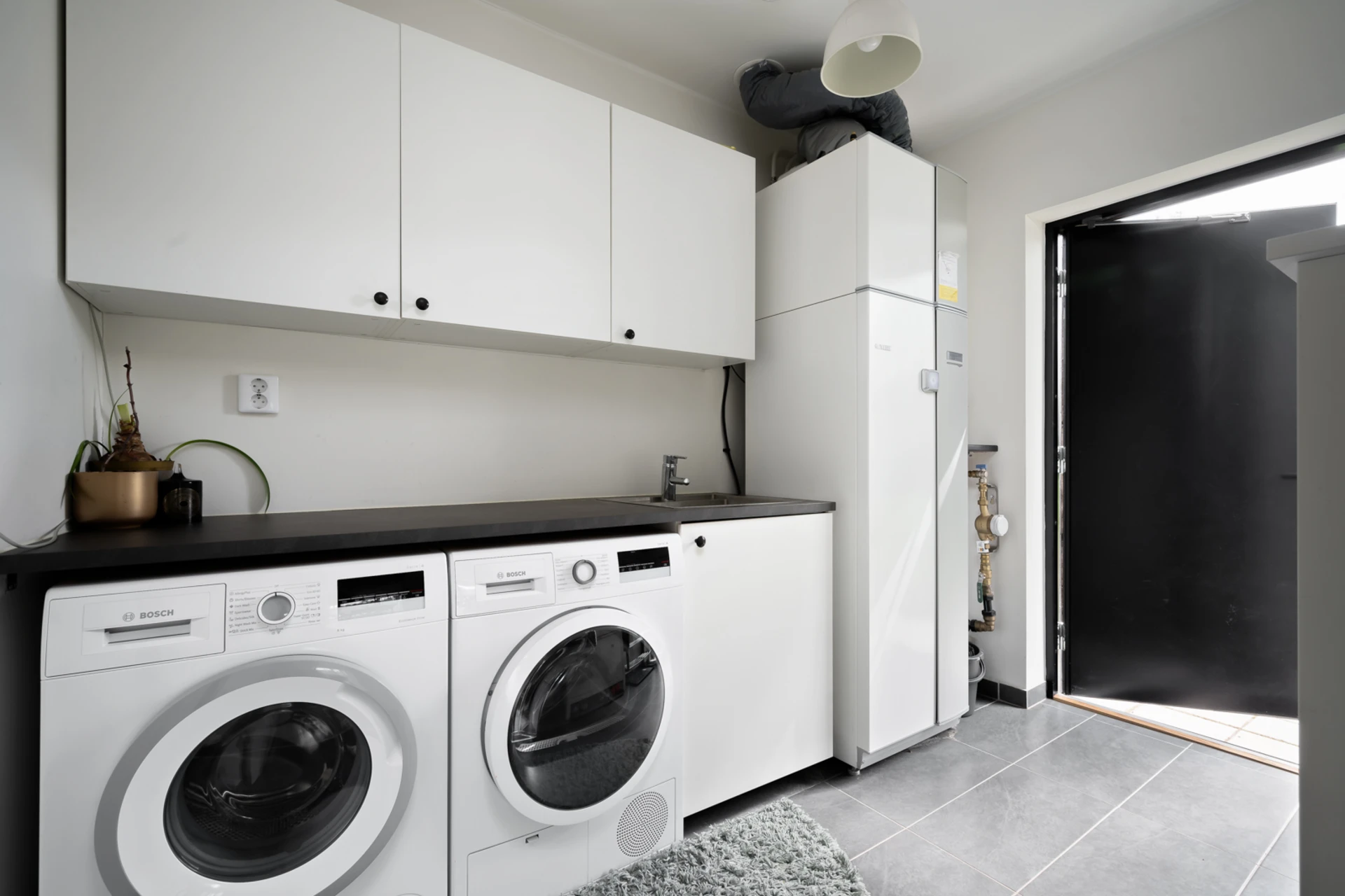 I tvättstugan finns tvättmaskin och torktumlare. Här inne står även husets värmesystem (En frånluftsvärmepump från NIBE). Här finns även groventrén till huset.