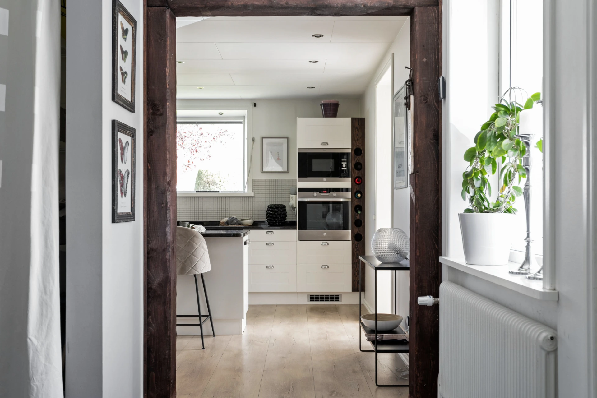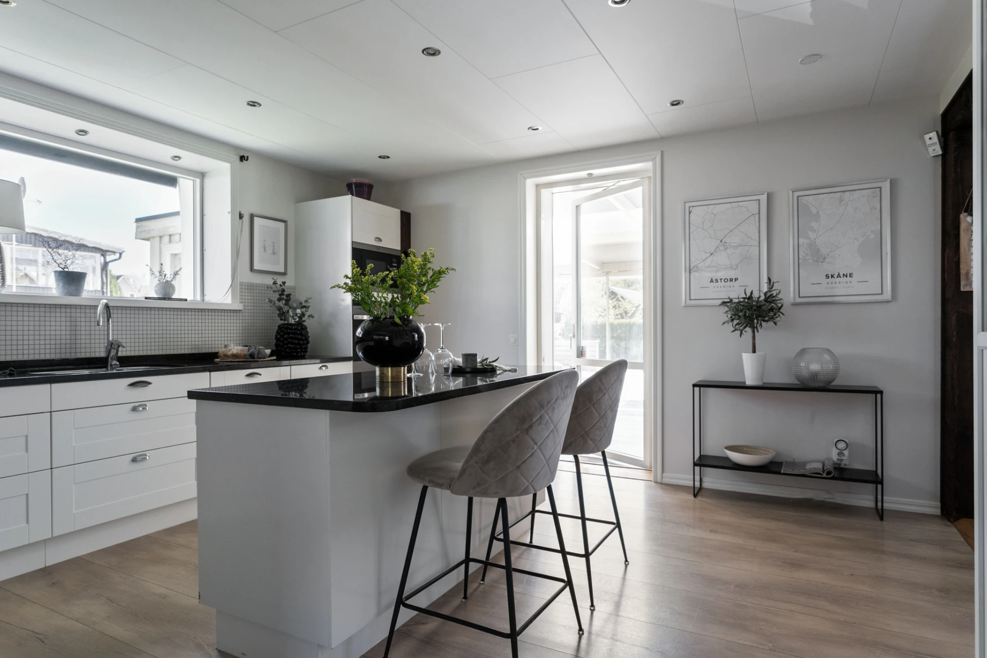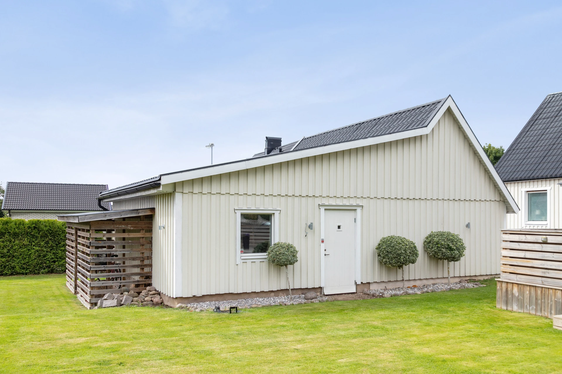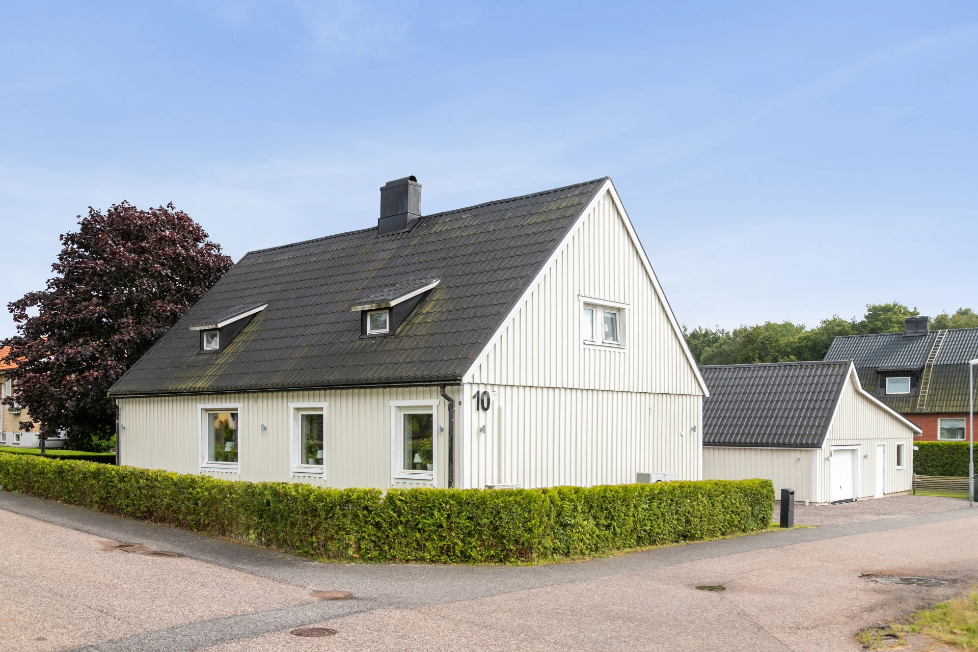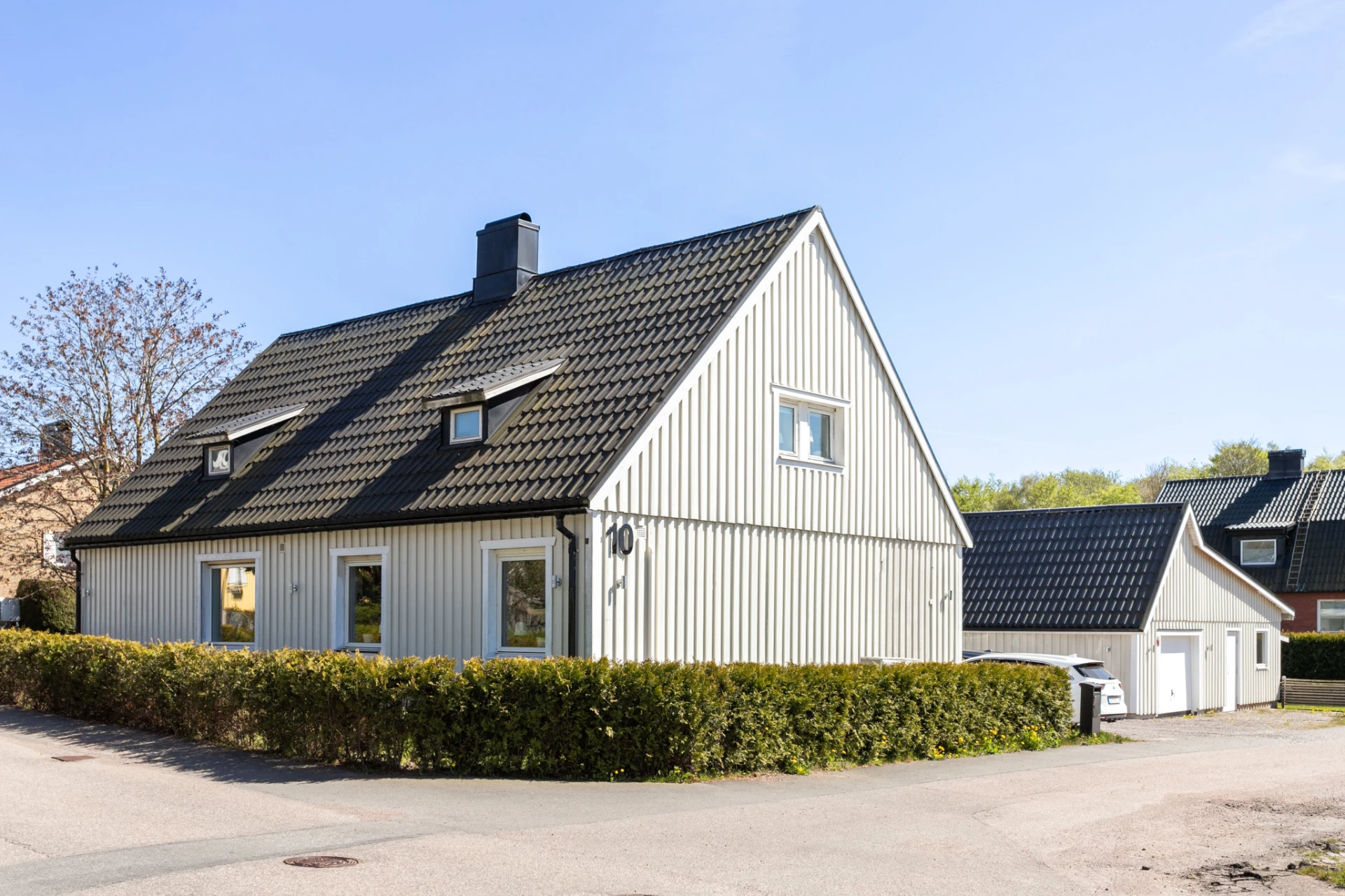 Här möter du ett charmigt och välskött hem som verkligen bjuder på det lilla extra. Den vita träfasaden, det svarta taket och den trevliga entrén med plantering och trappa skapar ett varmt välkomnande redan vid första intrycket.