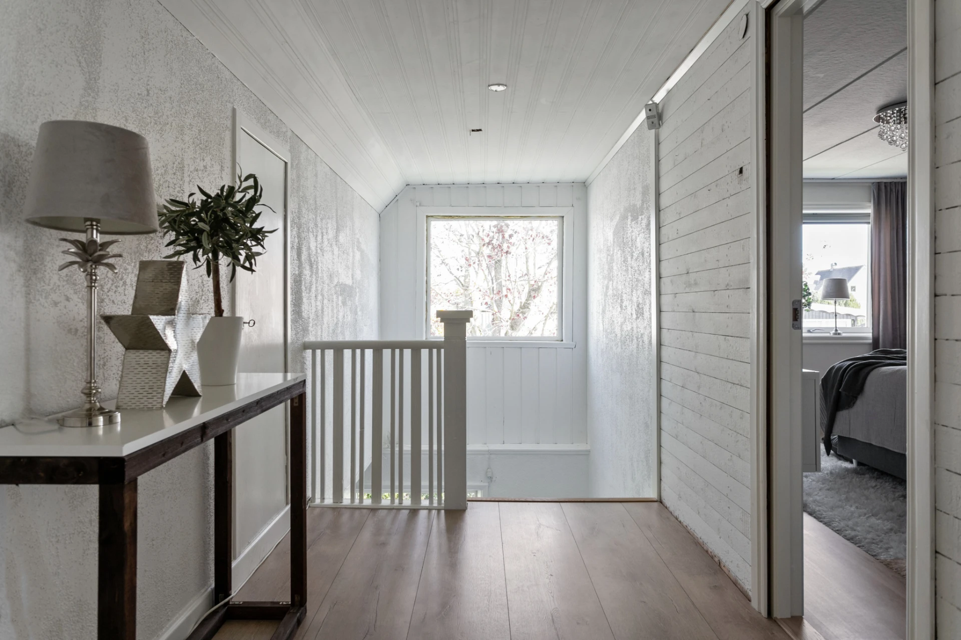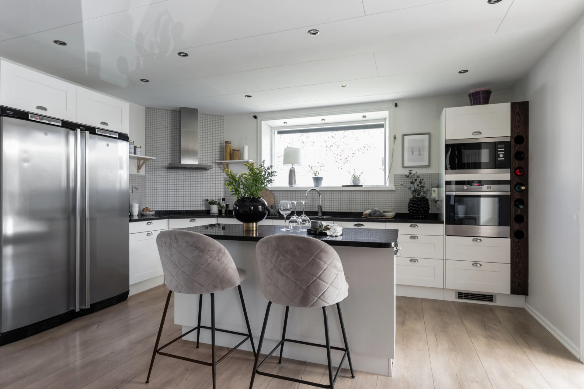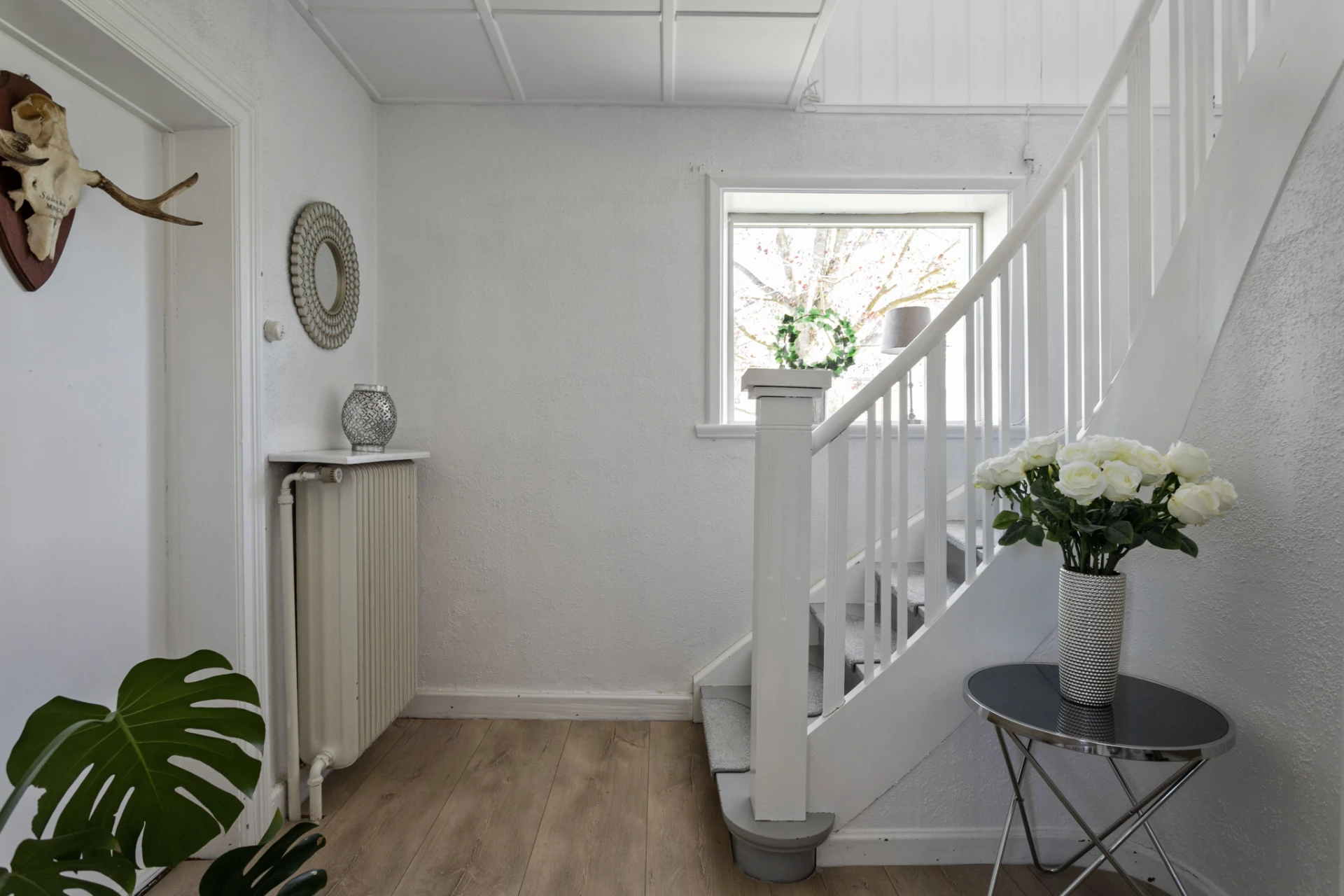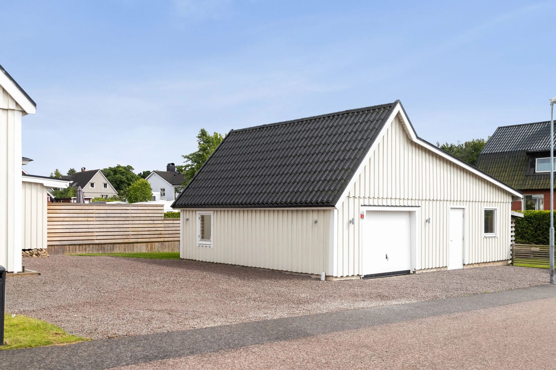 Här möter du ett charmigt och välskött hem som verkligen bjuder på det lilla extra. Den vita träfasaden, det svarta taket och den trevliga entrén med plantering och trappa skapar ett varmt välkomnande redan vid första intrycket.