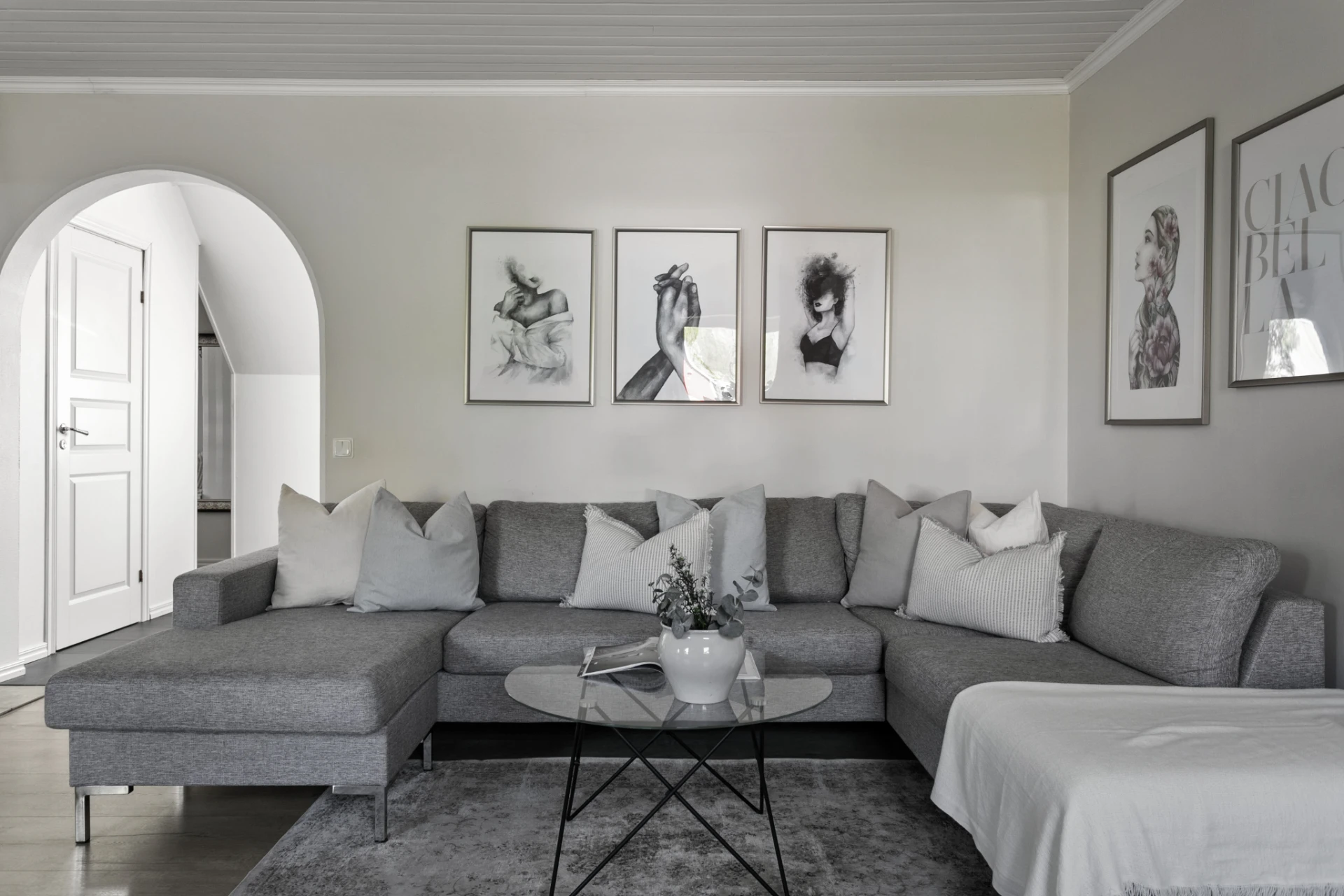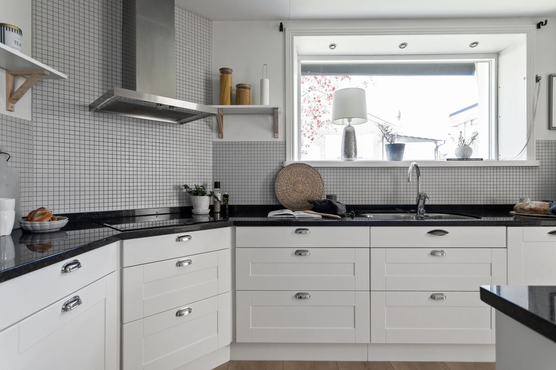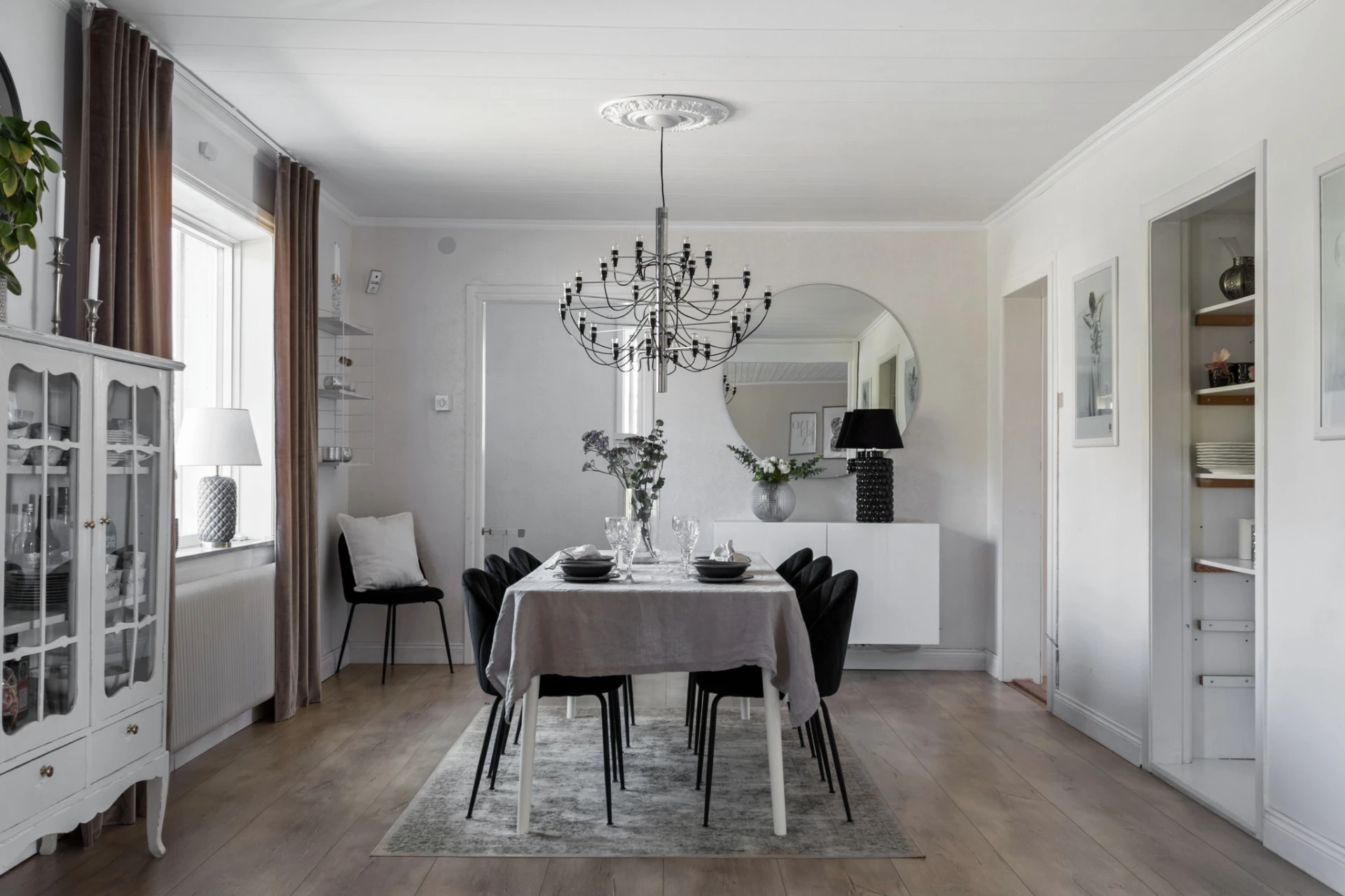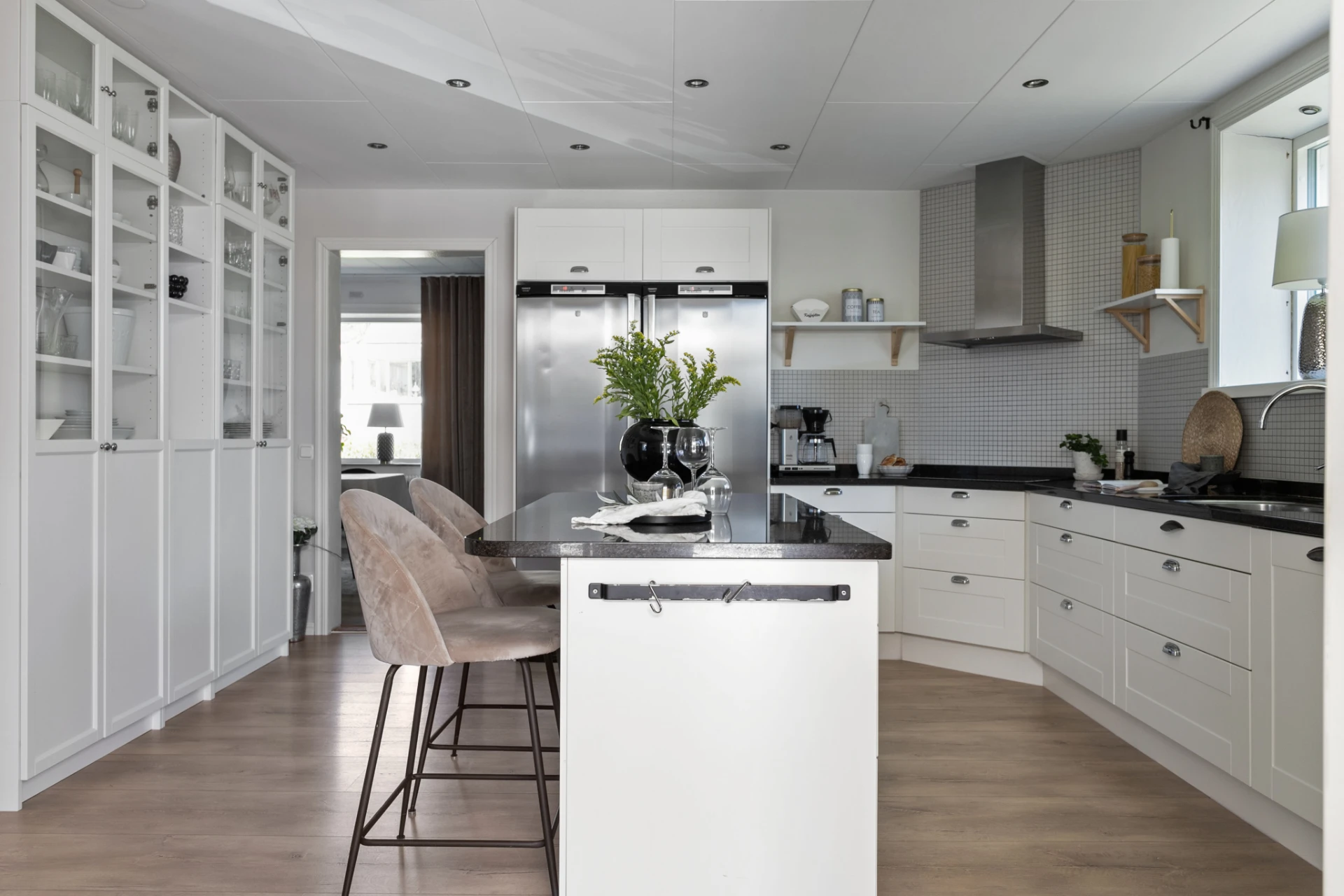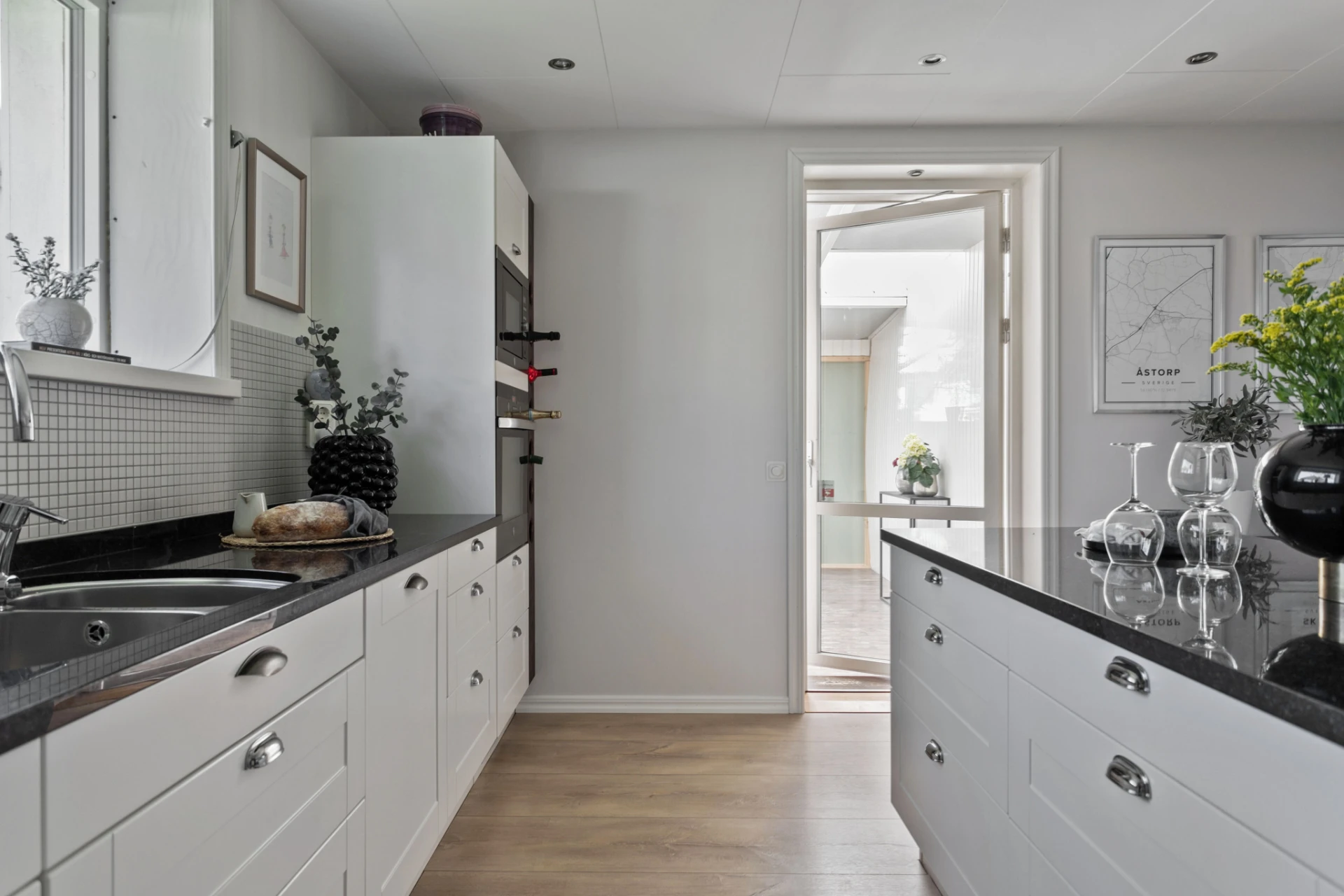 Här möter du ett charmigt och välskött hem som verkligen bjuder på det lilla extra. Den vita träfasaden, det svarta taket och den trevliga entrén med plantering och trappa skapar ett varmt välkomnande redan vid första intrycket.