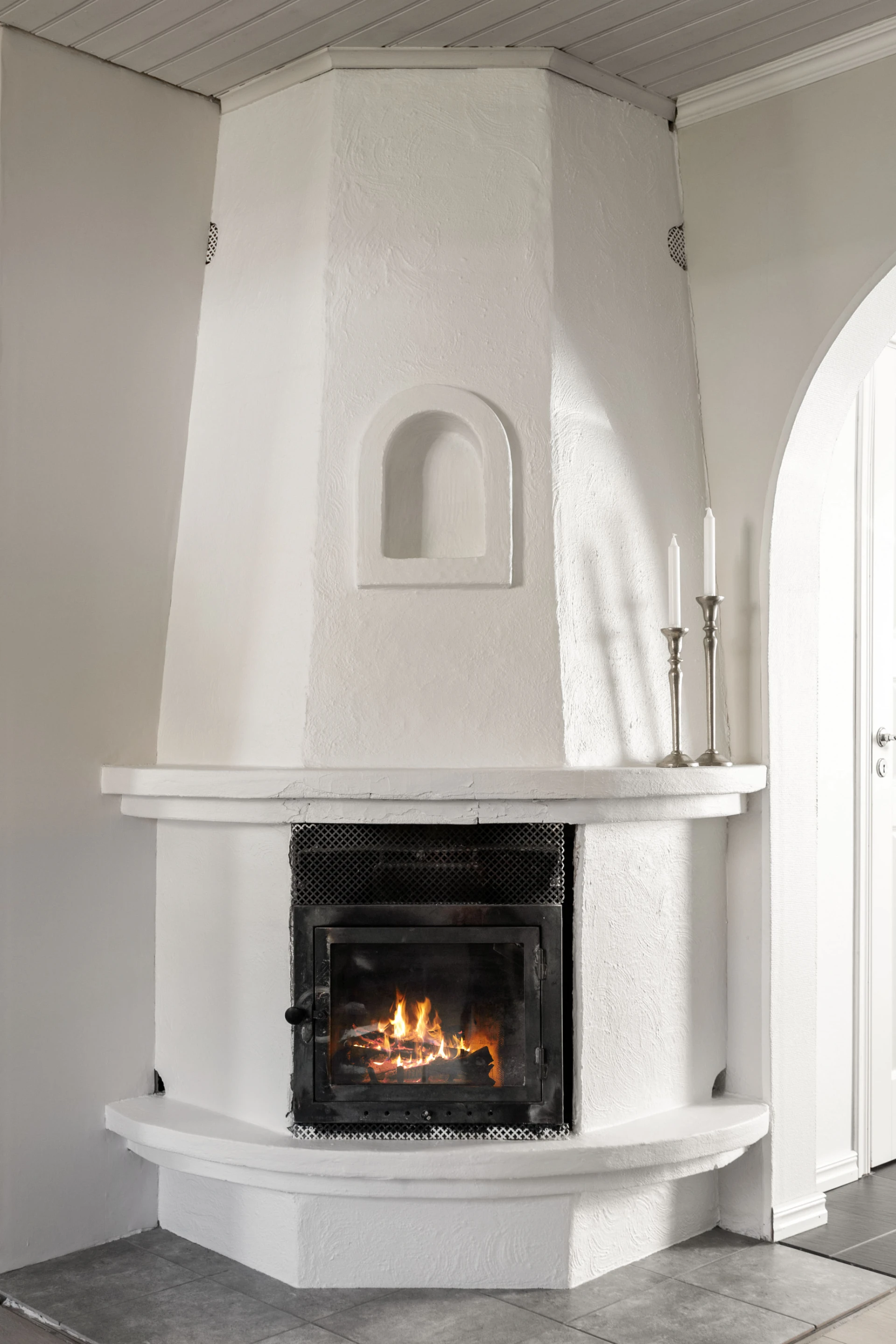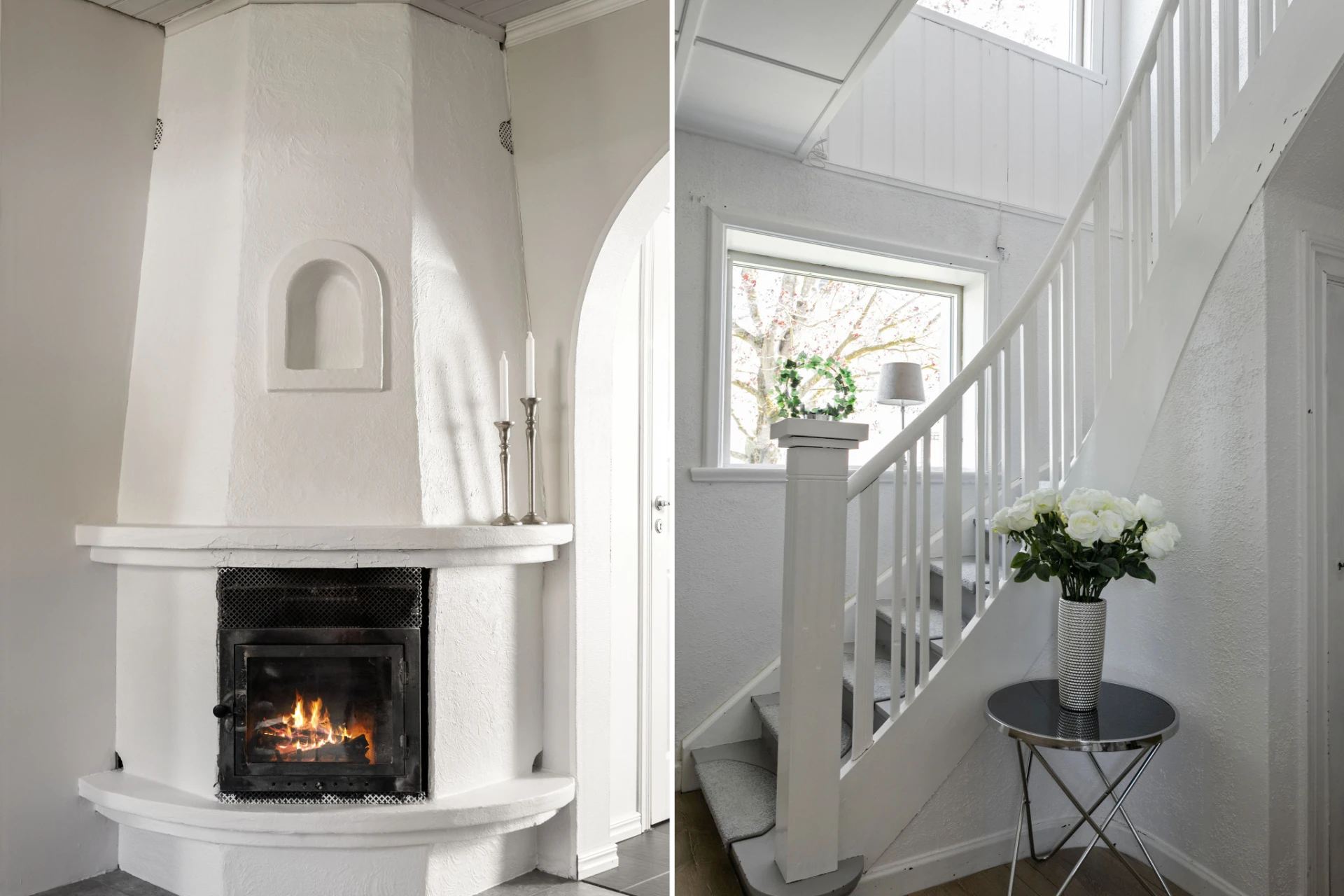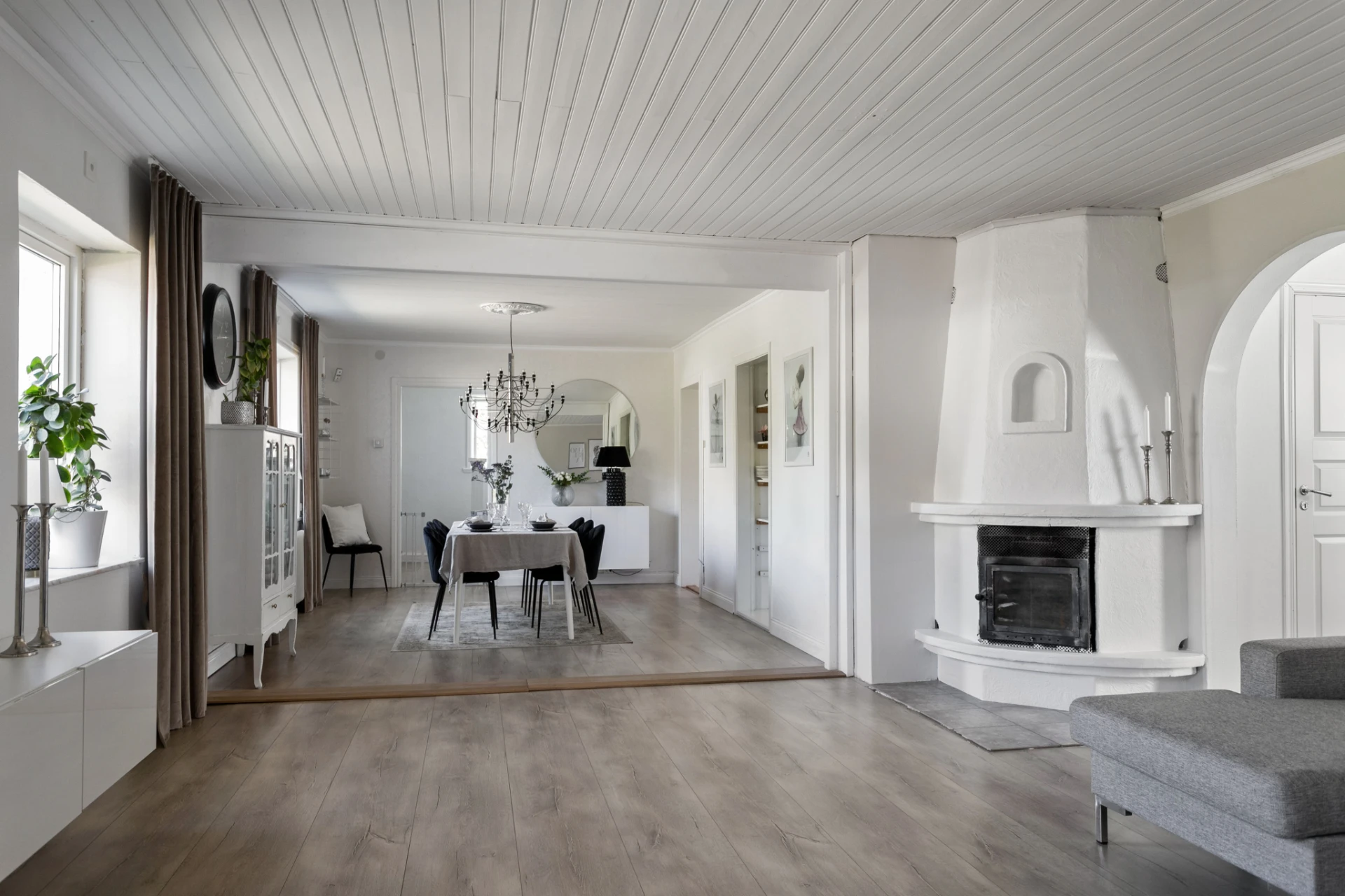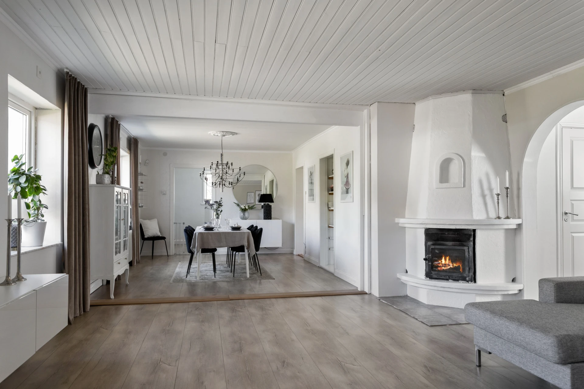 Braskamin (murad). Trägolv/plankgolv. Beigemålade/vita väggar.