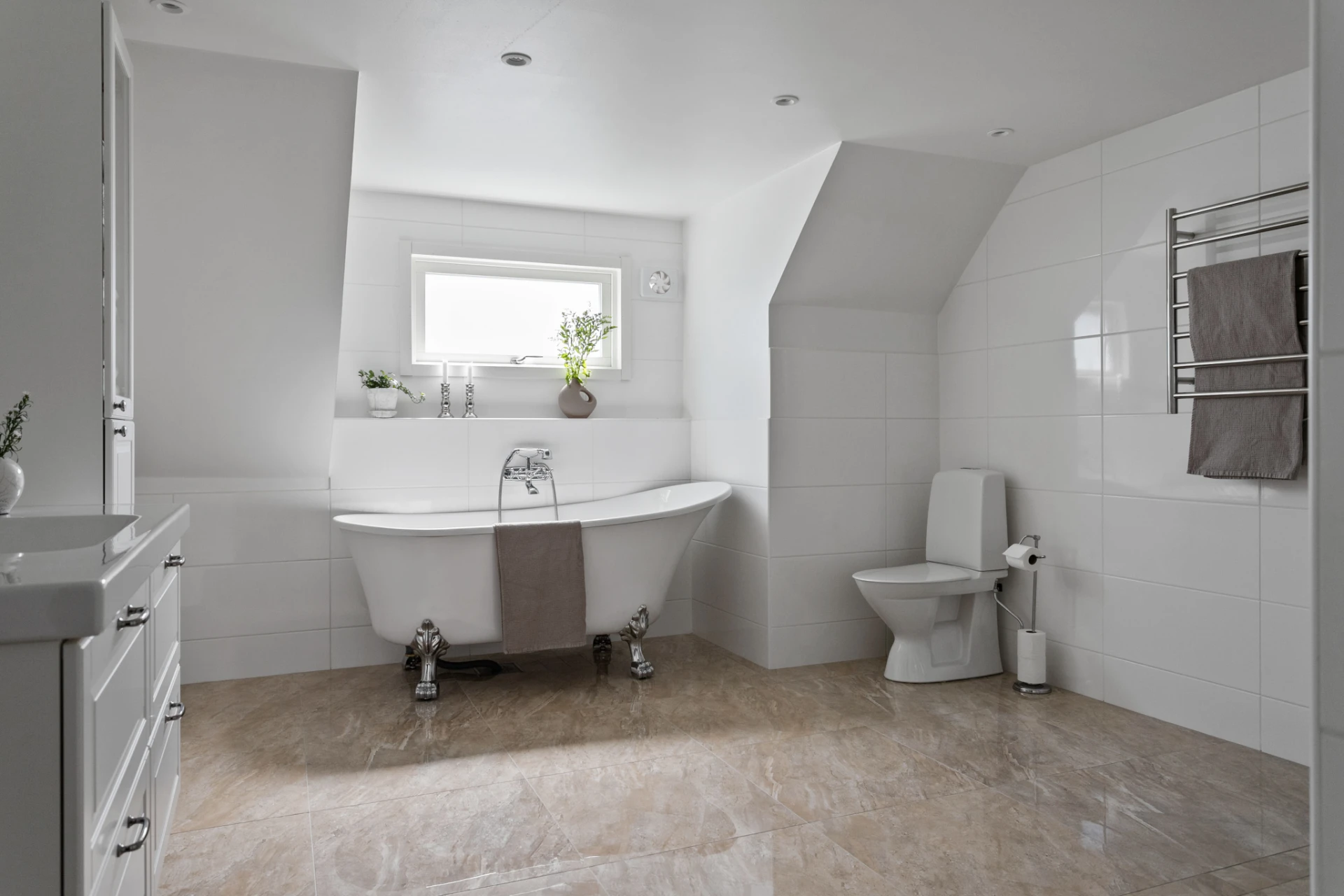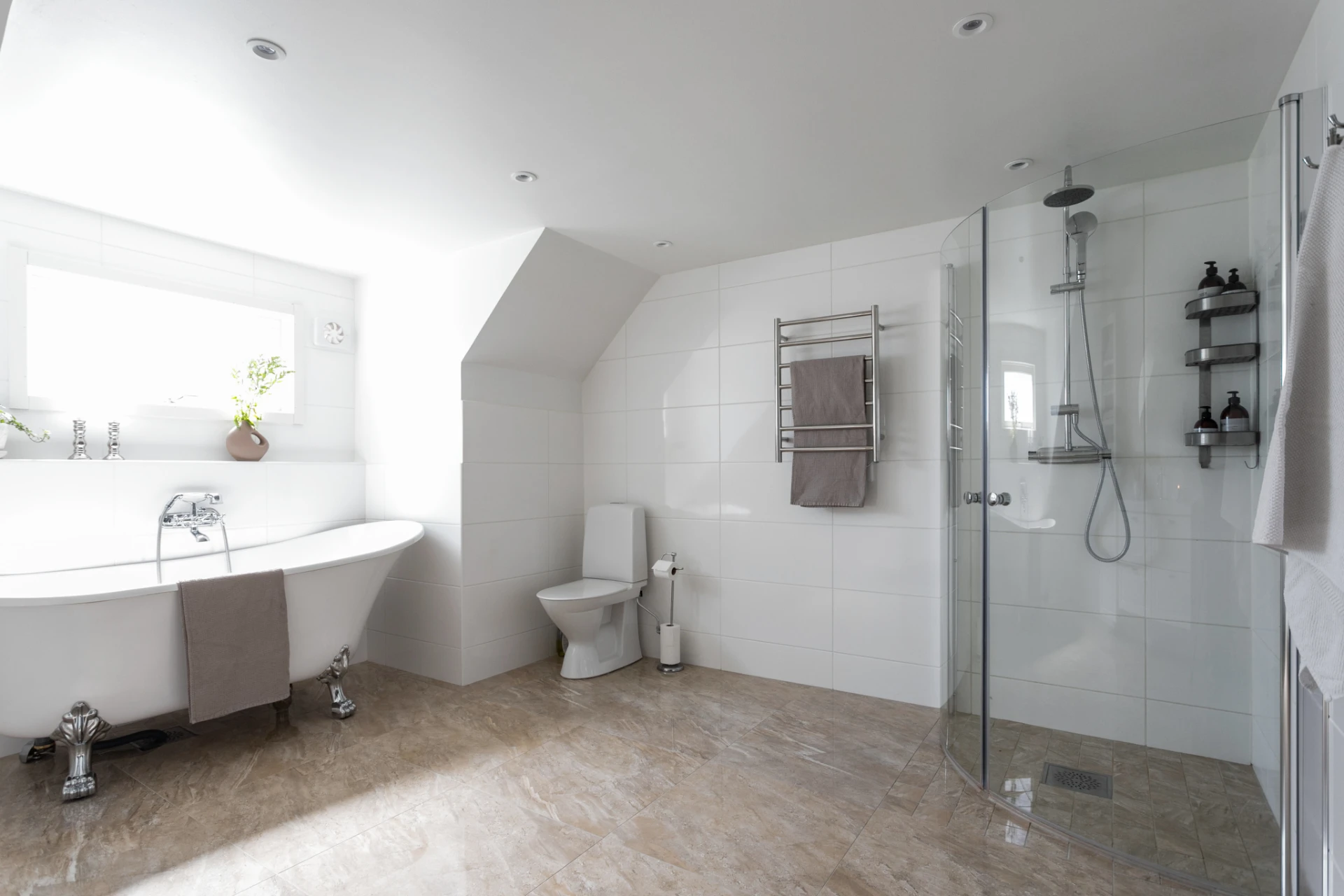Beige klinkergolv samt vitt kakel på väggar. Wc, dusch m takdusch, handfat m kommod, spegel, badkar, handdukstork samt förvaringsskåp. Golvvärme samt spotlights.