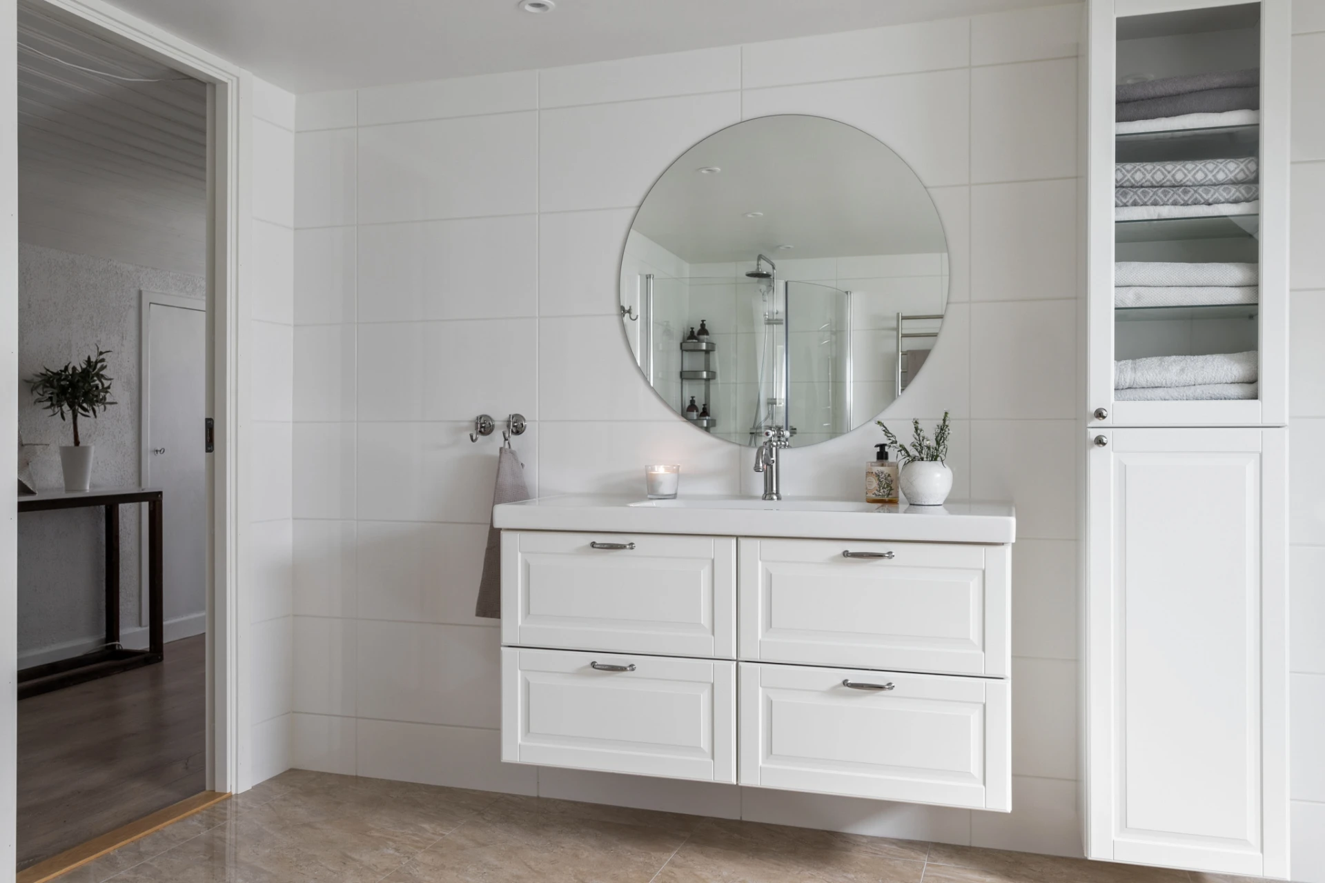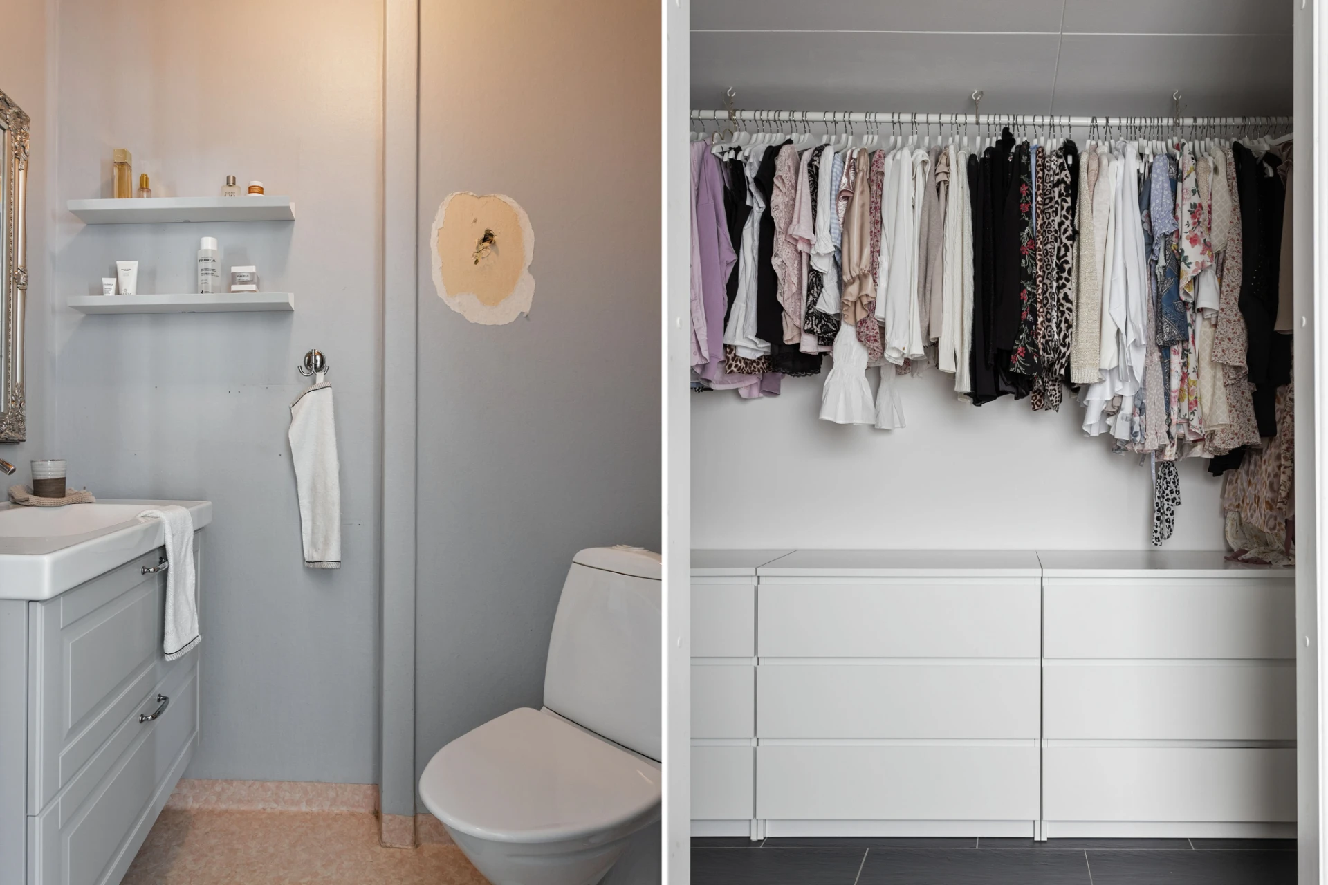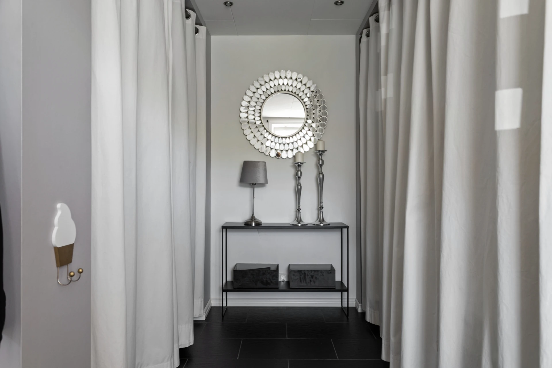 Inbyggda skjutgarderober. Mörkgrå klinker. Vita väggar. Golvvärme.