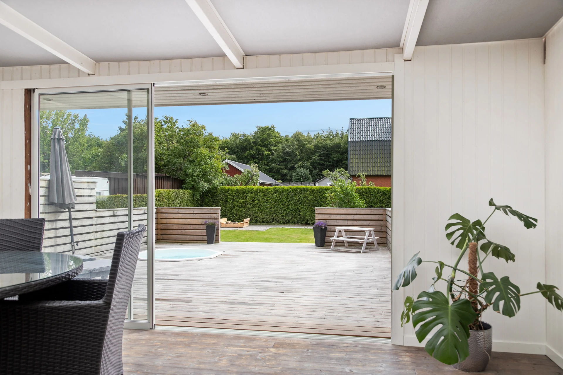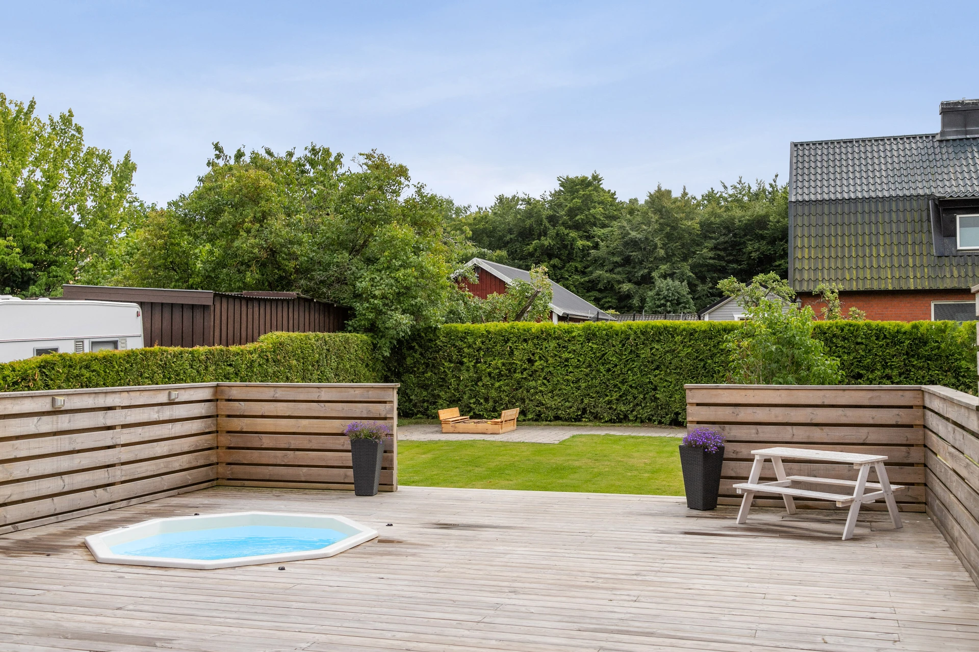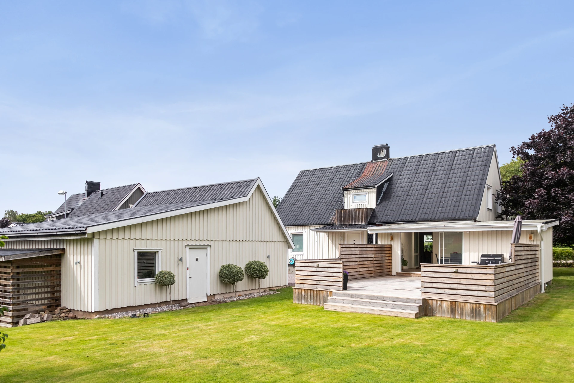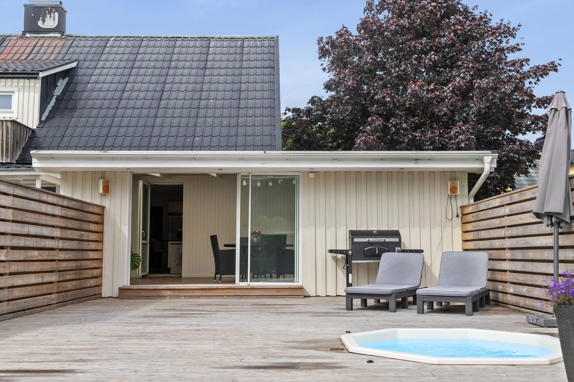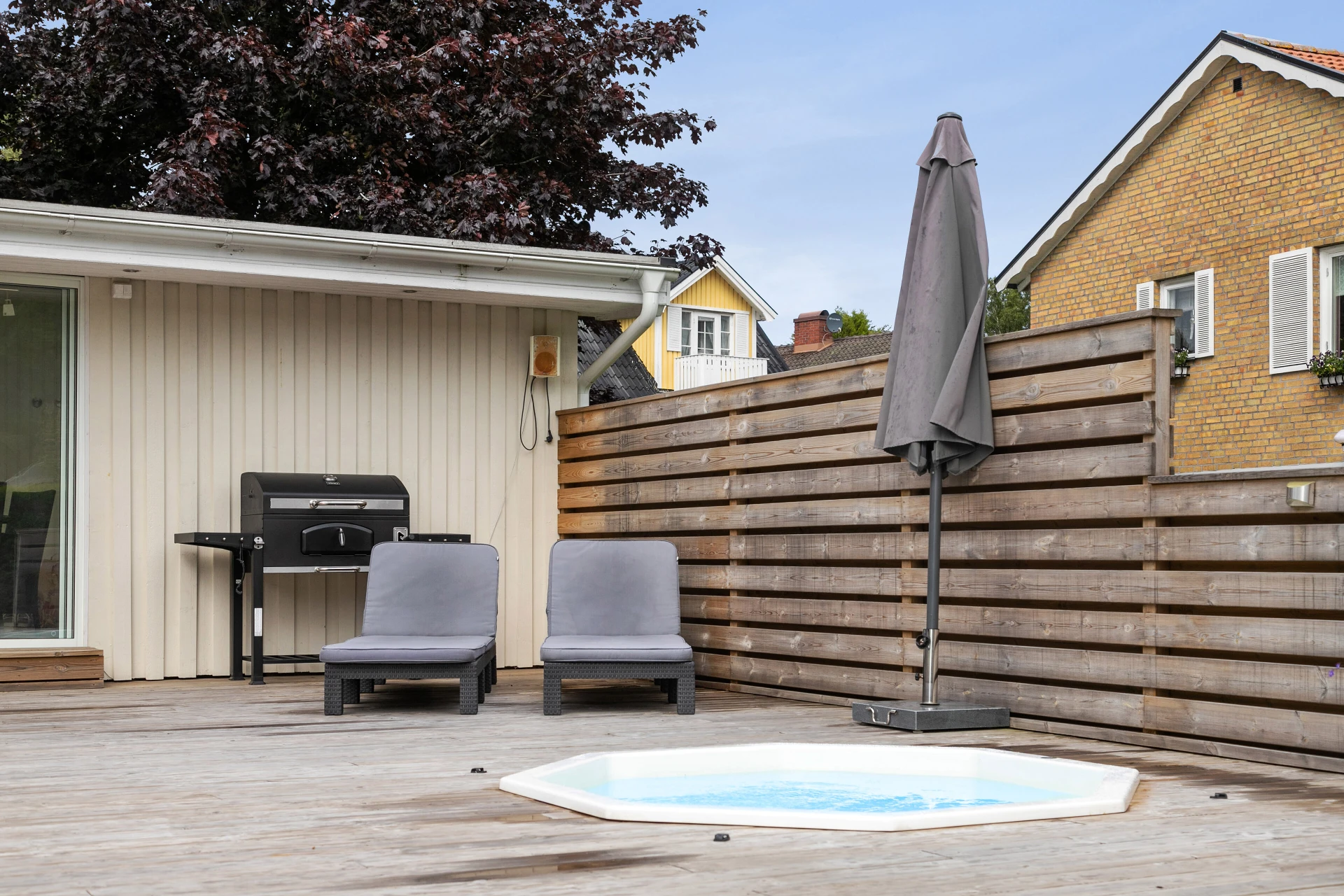 Baksidan är en riktig oas! Här väntar ett stort trädäck med jacuzzi/spabad, perfekt för avkoppling under stjärnhimlen. Den insynsskyddade uteplatsen med plats för solstolar, grill och matmöblemang gör detta till en självklar plats för sommarens alla stunder. Dessutom finns ett generöst inglasat uterum på hela 24 kvm som förlänger utesäsongen långt in på hösten.