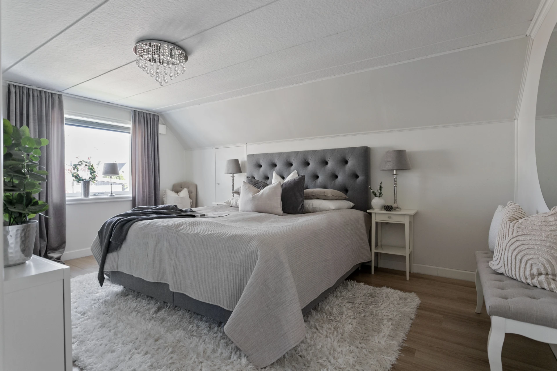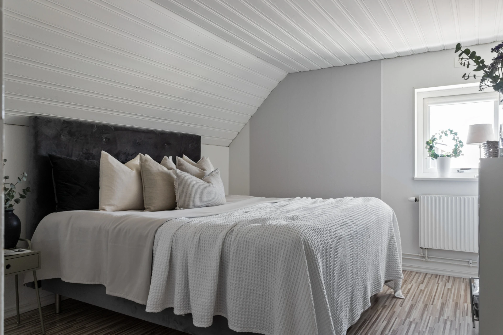 Plats för dubbelsäng. Laminatgolv. Vitmålade väggar.