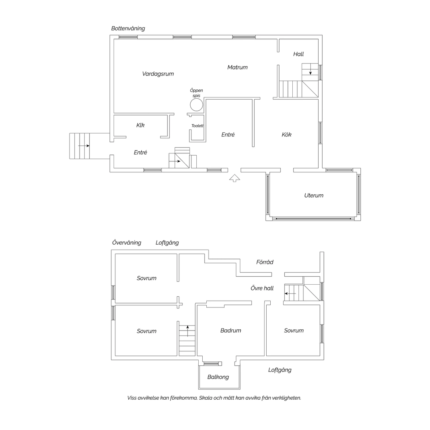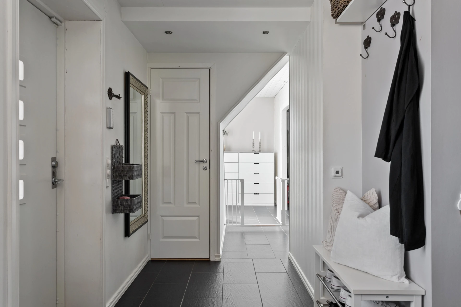 Husets planlösning är både generös och originell – med två trappor till ovanvåningen som ger både karaktär och funktion. På entréplan finns gott om ytor för hela familjen, inklusive en rymlig öppen garderob med smarta förvaringsmöjligheter.