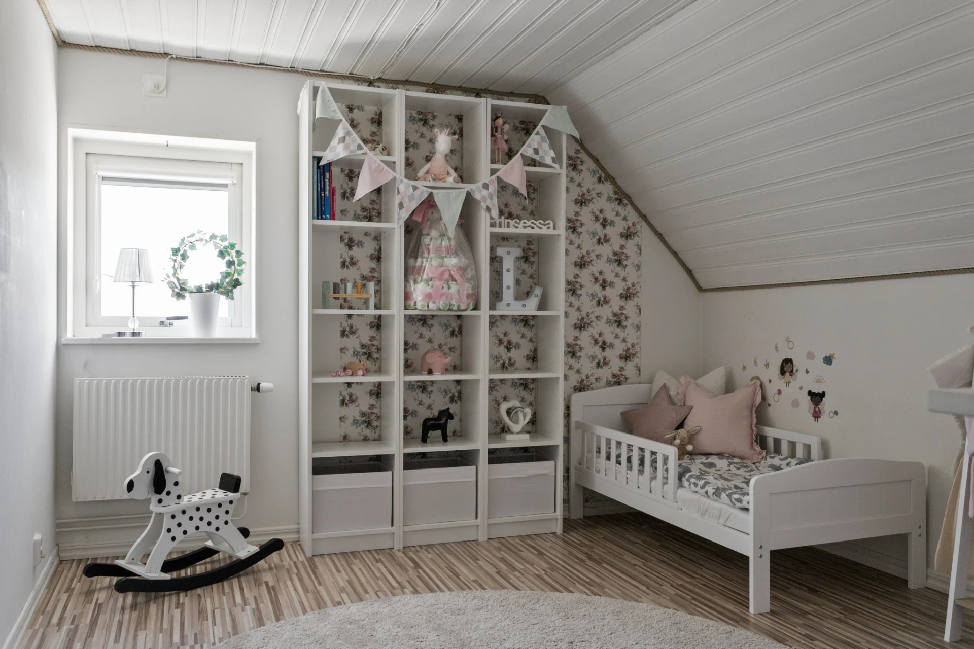 Plats för enkelsäng. Laminatgolv. Vitmålade väggar.